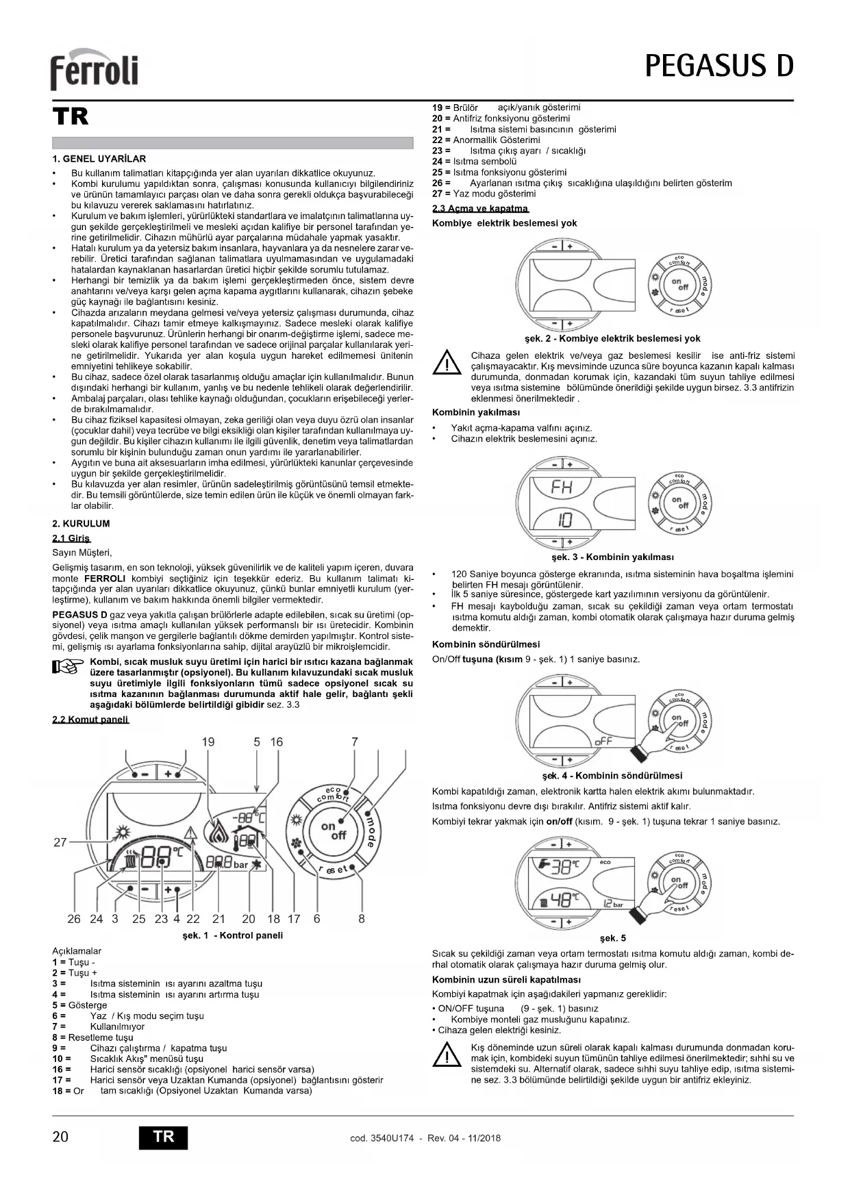 - Bu kÕlavuzda yer alan resimler, ürünün sadeleútirilmiú görüntüsünü temsil etmekte- dir. Bu temsili görüntülerde, size temin edilen ürün ile küçük ve önemli olmayan fark-lar olabilir.2. KURULUM2.1 Giriú SayÕn Müúteri, Geliúmiú tasarÕm, en son teknoloji, yüksek güvenilirlik ve de kaliteli yapÕm içeren, duvara monte FERROLI kombiyi seçti÷iniz için teúekkür ederiz. Bu kullanÕm talimatÕ ki- tapçÕ÷Õnda yer alan uyarÕlarÕ dikkatlice okuyunuz, çünkü bunlar emniyetli kurulum (yer- leútirme), kullanÕm ve bakÕm hakkÕnda önemli bilgiler vermektedir. PEGASUS D gaz veya yakÕtla çalÕúan brülörlerle adapte edilebilen, sÕcak su üretimi (op- siyonel) veya ÕsÕtma amaçlÕ kullanÕlan yüksek performanslÕ bir ÕsÕ üretecidir. Kombinin gövdesi, çelik manúon ve gergilerle ba÷lantÕlÕ dökme demirden yapÕlmÕútÕr. Kontrol siste- mi, geliúmiú ÕsÕ ayarlama fonksiyonlarÕna sahip, dijital arayüzlü bir mikroiúlemcidir.