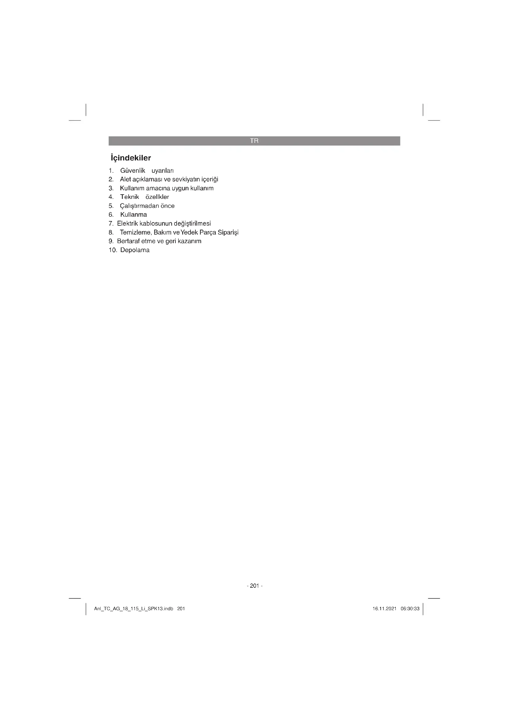 talimatlara göre kullanılmadığında veya bakımı düzgün şekilde yapılmadığında el-kol titreşiminden kaynaklanan sağlık hasarlarının oluşması. Anl_TC_AG_18_115_Li_SPK13.indb 203Anl_TC_AG_18_115_Li_SPK13.indb 203 16.11.2021 06:30:3316.11.2021 06:30:33TR