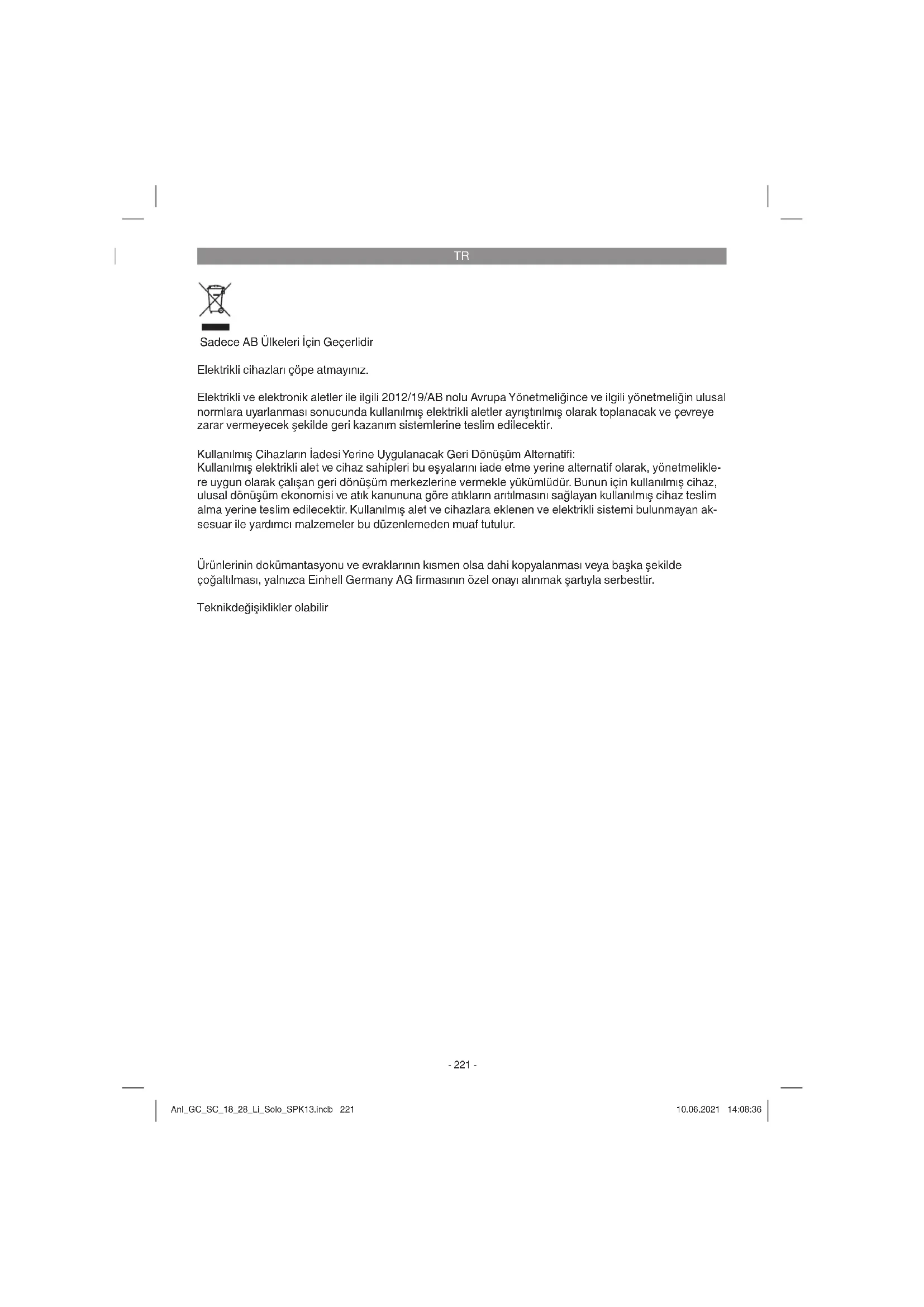 Sadece AB Ülkeleri İçin Geçerlidir Elektrikli cihazları çöpe atmayınız. Elektrikli ve elektronik aletler ile ilgili 2012/19/AB nolu Avrupa Yönetmeliğince ve ilgili yönetmeliğin ulusal normlara uyarlanması sonucunda kullanılmış elektrikli aletler ayrıştırılmış olarak toplanacak ve çevreye zarar vermeyecek şekilde geri kazanım sistemlerine teslim edilecektir. Kullanılmış Cihazların İadesi Yerine Uygulanacak Geri Dönüşüm Alternatifi : Kullanılmış elektrikli alet ve cihaz sahipleri bu eşyalarını iade etme yerine alternatif olarak, yönetmelikle- re uygun olarak çalışan geri dönüşüm merkezlerine vermekle yükümlüdür. Bunun için kullanılmış cihaz, ulusal dönüşüm ekonomisi ve atık kanununa göre atıkların arıtılmasını sağlayan kullanılmış cihaz teslim alma yerine teslim edilecektir. Kullanılmış alet ve cihazlara eklenen ve elektrikli sistemi bulunmayan ak- sesuar ile yardı mcı malzemeler bu düzenlemeden muaf tutulur. Ürünlerinin dokümantasyonu ve evraklarının kısmen olsa dahi kopyalanması veya başka şekilde çoğaltılması, yalnızca Einhell Germany AG fi rmasının özel onayı alınmak şartıyla serbesttir. Teknik değişiklikler olabilir Anl_GC_SC_18_28_Li_Solo_SPK13.indb 221Anl_GC_SC_18_28_Li_Solo_SPK13.indb 221 10.06.2021 14:08:3610.06.2021 14:08:36TR