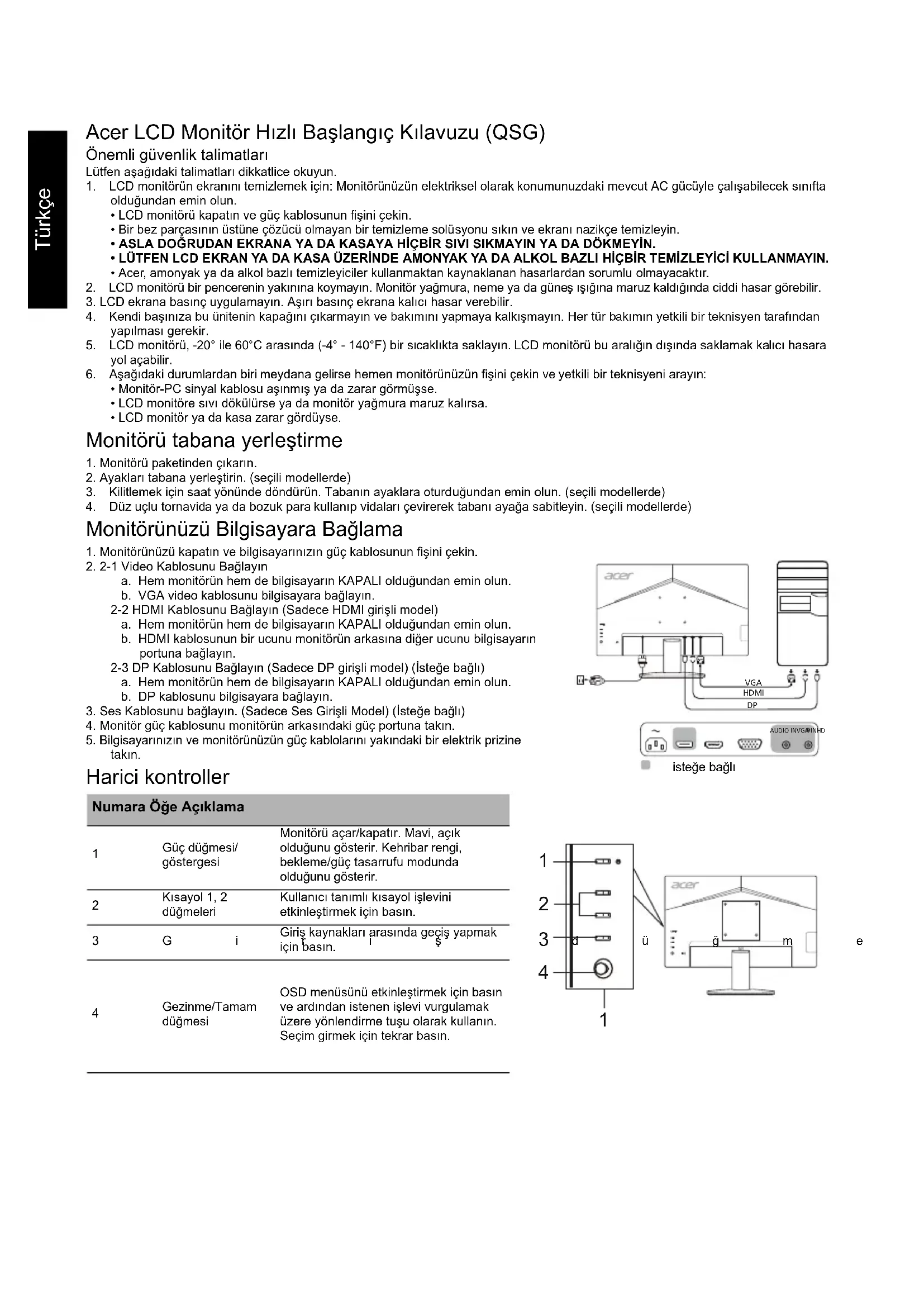 Monitörünüzü Bilgisayara Bağlama 1. Monitörünüzü kapatın ve bilgisayarınızın güç kablosunun fişini çekin.2. 2-1 Video Kablosunu Bağlayına. Hem monitörün hem de bilgisayarın KAPALI olduğundan emin olun.b. VGA video kablosunu bilgisayara bağlayın. 2-2 HDMI Kablosunu Bağlayın (Sadece HDMI girişli model)a. Hem monitörün hem de bilgisayarın KAPALI olduğundan emin olun.b. HDMI kablosunun bir ucunu monitörün arkasına diğer ucunu bilgisayarın portuna bağlayın.2-3 DP Kablosunu Bağlayın (Sadece DP girişli model) (İsteğe bağlı)a. Hem monitörün hem de bilgisayarın KAPALI olduğundan emin olun.b. DP kablosunu bilgisayara bağlayın.3. Ses Kablosunu bağlayın. (Sadece Ses Girişli Model) (İsteğe bağlı)4. Monitör güç kablosunu monitörün arkasındaki güç portuna takın.5. Bilgisayarınızın ve monitörünüzün güç kablolarını yakındaki bir elektrik prizine takın. Harici kontroller Numara Öğe Açıklama