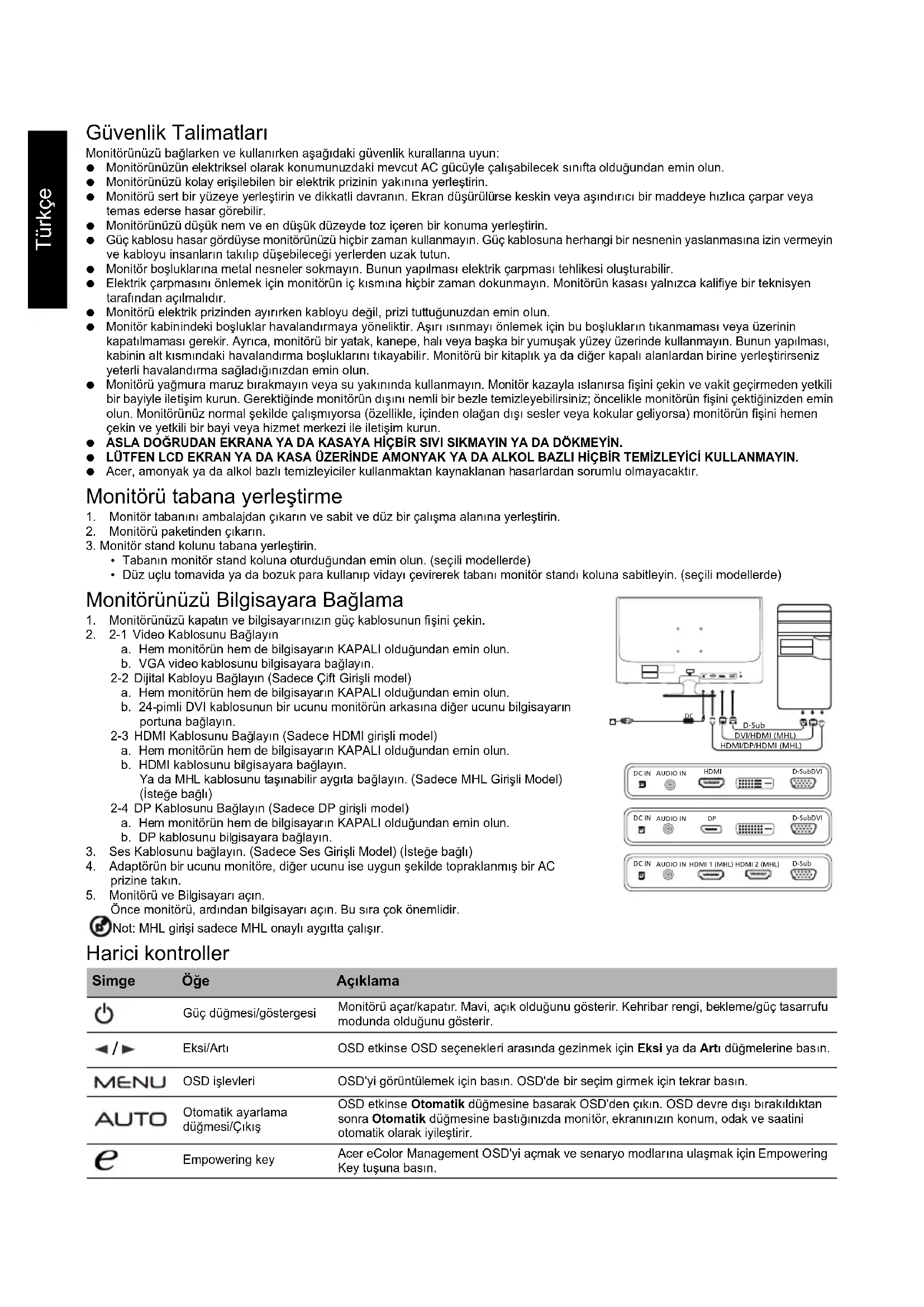 HDMI DC IND-SubDVI HDMI DC IND-SubDVIAUDIO INDC IND-SubDVI AUDIO INDC IND-SubAUDIO INHDMI 1 (MHL) HDMI 2 (MHL) HDMI/DP/HDMI (MHL) DVI/HDMI (MHL) /Türkçe Düzenlemeler ve güvenlik bildirimleri FCC bildirimi Bu aygıt test edilmiş ve FCC kurallarının 15. maddesi uyarınca B Sınıfı dijital aygıt olarak kabul edilmiştir. Bu sınırlar evde kurulumda meydana gelebilecek zararlı bir müdahaleye karşı koruma sağlamak için geliştirilmiştir. Bu aygıt radyo frekansı enerjisi yaratır, kullanır ve hatta saçabilir; ayrıca, talimatlara uygun olarak kurulmaz ve kullanılmazsa radyo iletişiminde zararlı bir müdahalede bulunabilir. Bununla birlikte, bu müdahalenin talimatlara uygun kurulumda meydana gelmeyeceğinin garantisi yoktur. Aygıt, radyo ya da televizyonun sinyal alımına aygıtı kapatıp açarak tespit edilebilen zararlı bir müdahalede bulunursa kullanıcı aşağıdaki önlemlerin birini ya da birden fazlasını alarak bu müdahaleyi düzeltmeyi deneyebilir: Alıcı antenin yerini ya da yönünü değiştirin. Aygıt ile alıcıyı birbirinden biraz daha uzaklaştırın. Aygıtı, alıcının bağlı olduğundan faklı bir devrede bulunan çıkışa bağlayın. Yardım için satıcınıza ya da tecrübeli bir radyo/televizyon teknisyenine danışın. CE Uygunluk beyanı Bu belge ile Acer Inc. bu LCD monitörün EMC Yönetmeliği 2004/108/AT, Alçak Gerilim Yönetmeliği 2006/95/AT ve RoHS Yönetmeliği 2002/95/AT ile Yönetmeliği 2009/125/AT yasalarının enerji ürünleri için çevreci bir tasarım yapacak bir sistem kurmayı gerektiren temel gerekliliklerine ve diğer maddelerine uyduğunu beyan eder. Uyarı: Monitörün zarar görmesini önlemek için monitörü tabanından tutarak kaldırmayın. Uyarı: Blendajlı kablolar Diğer bilişim aygıtlarıyla yapılacak tüm bağlantılar EMC düzenlemelerine uyum sağlamak için blendajlı kablolar kullanılarak yapılmalıdır. Uyarı: Çevresel aygıtlar Bu ekipmana sadece B Sınıfı sınırlarına uygun olduğu sertifikayla belirtilmiş çevresel aygıtlar (giriş/çıkış aygıtları, terminaller, yazıcılar vb.) eklenebilir. Sertifikasız çevresel aygıtlarla çalıştırılırsa radyo ve TV alıcılarına müdahale meydana gelebilir. Dikkat Üretici tarafından açıkça onaylanmamış değişiklikler ve düzenlemeler, kullanıcının Federal İletişim Komisyonu tarafından verilen bu ürünü çalıştırma hakkının feshedilmesine neden olabilir. Çalışma koşulları Bu aygıt FCC Hükümlerinin 15. maddesine uygundur. Çalışma şu iki şarta uygunluk gerektirir: (1) bu aygıt zararlı bir müdahaleye neden olmamalıdır ve (2) istem dışı çalıştırma da dahil olmak üzere bu aygıt alınan her müdahaleyi üstlenmek durumundadır. Uyarı: Kanadalı kullanıcılar Bu B Sınıfı tertibat, Kanada ICES-003 yasasına uygundur. Remarque à l'intention des utilisateurs canadiens Cet appareil numérique de la classe B est conforme à la norme NMB-003 du Canada. Atılacak Ekipmanın Avrupa Birliği Üyesi Ülkelerde Özel Mekanda Kullanıcılarca Atılması Üründe ve ürünün paketinde bulunan bu simge, bu ürünün diğer ev atıklarınızla atılmaması gerektiğini gösterir. Bunun yerine, atılacak ekipmanınızı atık elektrikli cihaz toplama noktasına teslim etmek sizin sorumluluğunuzdur. Ürününüzün bu şekilde ayrı atılması ve geri dönüştürülmesi doğal kaynakları koruyacak ve ürünün insan sağlığını ve çevreyi koruyacak şekilde geri dönüştürülmesini sağlayacaktır. Atık ürününüzü nereye teslim edebileceğiniz hakkında daha fazla bilgi alabilmek için lütfen yerel belediyeyle, çöp hizmetlerinizi sunan birimle ya da ürünü aldığınız mağazayla iletişime geçin.Türkçe