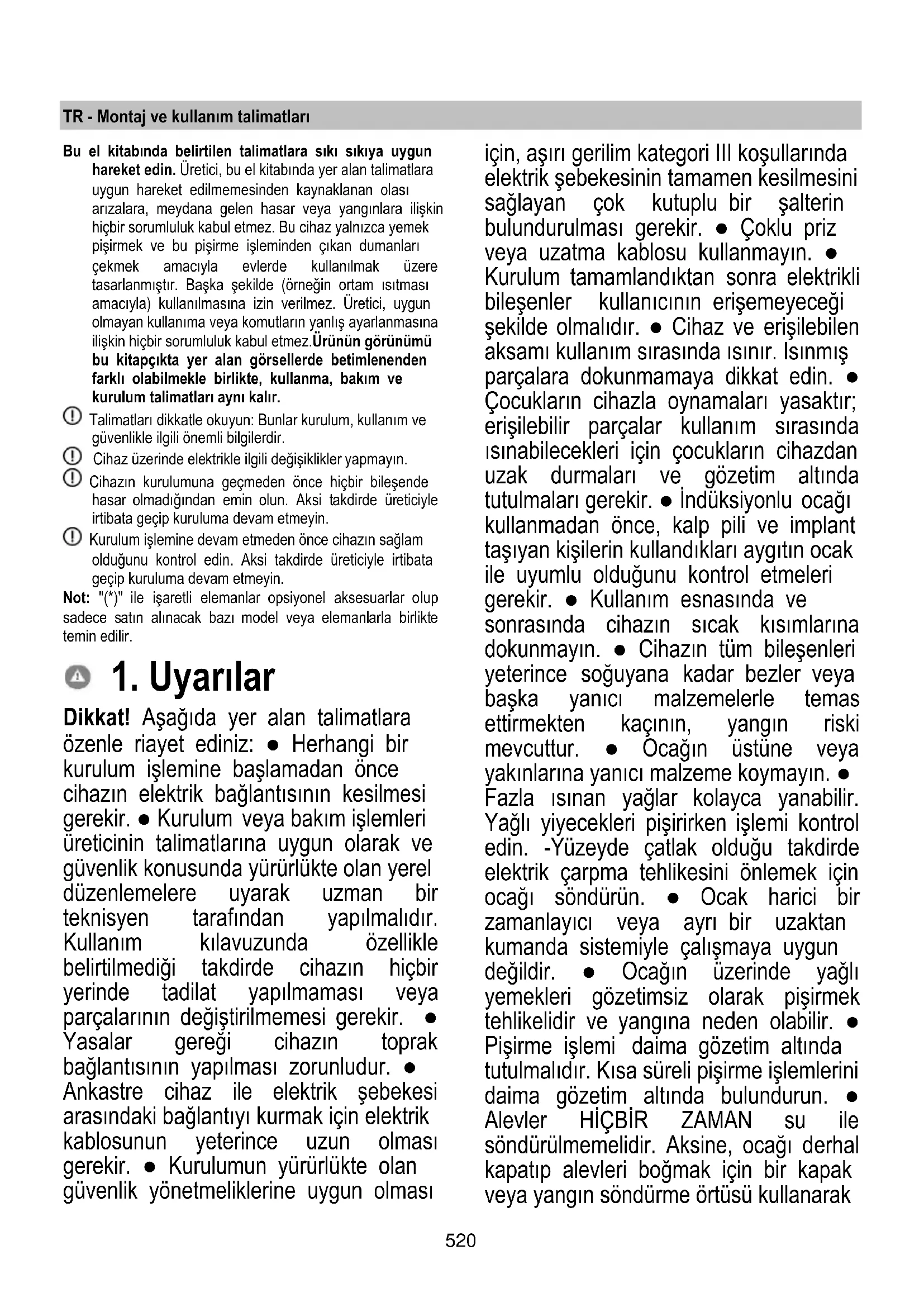Dikkat! Aşağıda yer alan talimatlara özenle riayet ediniz: ● Herhangi bir kurulum işlemine başlamadan önce cihazın elektrik bağlantısının kesilmesi gerekir. ● Kurulum veya bakım işlemleri üreticinin talimatlarına uygun olarak ve güvenlik konusunda yürürlükte olan yerel düzenlemelere uyarak uzman bir teknisyen tarafından yapılmalıdır. Kullanım kılavuzunda özellikle belirtilmediği takdirde cihazın hiçbir yerinde tadilat yapılmaması veya parçalarının değiştirilmemesi gerekir. ● Yasalar gereği cihazın toprak bağlantısının yapılması zorunludur. ● Ankastre cihaz ile elektrik şebekesi arasındaki bağlantıyı kurmak için elektrik kablosunun yeterince uzun olması gerekir. ● Kurulumun yürürlükte olan güvenlik yönetmeliklerine uygun olması için, aşırı gerilim kategori III koşullarında elektrik şebekesinin tamamen kesilmesini sağlayan çok kutuplu bir şalterin bulundurulması gerekir. ● Çoklu priz veya uzatma kablosu kullanmayın. ● Kurulum tamamlandıktan sonra elektrikli bileşenler kullanıcının erişemeyeceği şekilde olmalıdır. ● Cihaz ve erişilebilen aksamı kullanım sırasında ısınır. Isınmış parçalara dokunmamaya dikkat edin. ● Çocukların cihazla oynamaları yasaktır; erişilebilir parçalar kullanım sırasında ısınabilecekleri için çocukların cihazdan uzak durmaları ve gözetim altında tutulmaları gerekir. ● İndüksiyonlu ocağı kullanmadan önce, kalp pili ve implant taşıyan kişilerin kullandıkları aygıtın ocak ile uyumlu olduğunu kontrol etmeleri gerekir. ● Kullanım esnasında ve sonrasında cihazın sıcak kısımlarına dokunmayın. ● Cihazın tüm bileşenleri yeterince soğuyana kadar bezler veya başka yanıcı malzemelerle temas ettirmekten kaçının, yangın riski mevcuttur. ● Ocağın üstüne veya yakınlarına yanıcı malzeme koymayın. ● Fazla ısınan yağlar kolayca yanabilir. Yağlı yiyecekleri pişirirken işlemi kontrol edin. -Yüzeyde çatlak olduğu takdirde elektrik çarpma tehlikesini önlemek için ocağı söndürün. ● Ocak harici bir zamanlayıcı veya ayrı bir uzaktan kumanda sistemiyle çalışmaya uygun değildir. ● Ocağın üzerinde yağlı yemekleri gözetimsiz olarak pişirmek tehlikelidir ve yangına neden olabilir. ● Pişirme işlemi daima gözetim altında tutulmalıdır. Kısa süreli pişirme işlemlerini daima gözetim altında bulundurun. ● Alevler HİÇBİR ZAMAN su ile söndürülmemelidir. Aksine, ocağı derhal kapatıp alevleri boğmak için bir kapak veya yangın söndürme örtüsü kullanarak521 söndürün. Yangın tehlikesi: Pişirme yüzeylerinin üzerine eşya koymayın. ● Buharlı temizleyici kullanmayın, elektrik çarpması riski mevcuttur. ● Fazla ısınma tehlikesi oluşabileceğinden, ocağın üzerine bıçak, çatal, kaşık ve kapak gibi metal malzeme koymayın. ● Cihazı elektrik şebekesine bağlamadan önce: Gerilim ve güç değerlerinin şebekenin değerlerine karşılık geldiğinden ve bağlantı prizinin uygun olduğundan emin olmak için bilgi plakasını kontrol edin (cihazın alt kısmında bulunur). Şüpheye düşerseniz, ehil bir elektrik teknisyeniyle bağlantı kurun. Önemli: ● Kullanımdan sonra, ocağı kumandasıyla kapatın, tencere algılayıcısına güvenmeyin. ● Sıvıların taşmasını önlemek için haşlama veya ısıtma yaparken ısı beslemesini düşürün. ● Ocağın ısıtma elemanlarının üzerinde boş tencere veya tava bırakmayın. ● Pişirme işlemi sona erer ermez ilgili pişirme bölgesini kapatın. ● Pişirme sırasında kesinlikle alüminyum folyo kullanmayın ve alüminyum ambalajlı ürünleri doğrudan yerleştirmeyin. Alüminyum eriyip ocakta geri dönüşü olanaksız zararlara yol açabilir. ● Öncesinde açmadan yiyecek içeren metal kutu veya tenekeleri kesinlikle ısıtmayın: patlama meydana gelebilir! Bu uyarı tüm diğer ocak tipleri için geçerlidir. ● Takviye özelliği gibi yüksek güçlü bir fonksiyonu kullanmak kızartma yağı gibi bazı sıvıları ısıtmak için uygun değildir. Yüksek ısı tehlikeli olabilir. Bu durumlarda daha düşük bir ısıtma gücü kullanılması tavsiye edilir. ● Kaplar doğrudan ocağın üzerine ve ısıtma bölümlerinin ortasına yerleştirilmelidir. Tencere ve ocak arasında kesinlikle başka nesne olmamalıdır. ● Yüksek sıcaklık söz konusu olduğunda cihaz otomatik olarak pişirme bölgelerinin güç seviyesini düşürür. ● Herhangi bir temizlik veya bakım işlemi yapmadan önce elektrik fişini prizden çekerek veya evinizdeki ana şalteri kapatarak cihazın elektrik şebekesiyle olan bağlantısını kesin. ● Tüm kurulum ve bakım işlemlerinde iş eldiveni kullanın. ● Bu cihaz 8 yaşından büyük çocuklar ile fiziksel, duyusal veya zihinsel kapasitesi düşük veya deneyimden ve gerekli bilgiden yoksun kişilerce yalnızca gözetim altındayken veya cihazın güvenli kullanımına ilişkin talimatlar verildikten ve bu durumla ilgili tehlikeleri anlamaları sağlandıktan sonra kullanılabilir. ● Cihazla oynamadıklarından emin olmak için çocuklar kontrol altında tutulmalıdır. ● Temizlik ve bakım işlemleri çocuklar tarafından gözetimsiz olarak yapılmamalıdır. ● Bu cihaz gaz veya başka yakıtları yakan diğer cihazlarla aynı anda kullanılacağı zaman söz konusu yerde yeterli havalandırma bulunmalıdır. ● Cihazın dışı ve içi sık sık (EN AZINDAN AYDA BİR) temizlenmelidir; her koşulda bakım talimatlarında açıkça belirtilenlere uygun hareket edin. ● Cihazla ilgili temizlik kuralları ile filtreleri değiştirme ve temizleme kurallarına uygun hareket edilmemesi yangın risklerinin doğmasına neden olur. ● Flambe usulü yemek pişirmek kesinlikle yasaktır. ● Açık alev kullanmak filtreler açısından zararlıdır ve yangınlara neden olabilir, bu nedenle her durumda kaçınılmalıdır. ● Aş