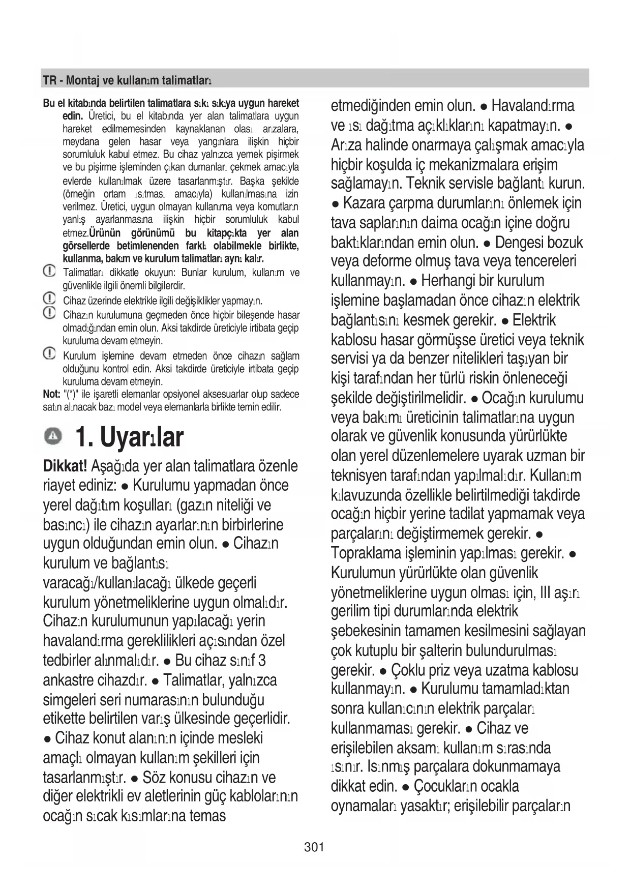 - serijski broj (S/N) Posljednji podatci nalaze se na pločici s karakteristikama na uređaju i/ili na ambalaži. ! Nikada ne upotrebljavajte neovlaštene tehničare za popravak i uvijek odbijte ugradnju neoriginalnih rezervnih dijelova.301 TR - Montaj ve kullanım talimatları Bu el kitabında belirtilen talimatlara sıkı sıkıya uygun hareket edin. Üretici, bu el kitabında yer alan talimatlara uygun hareket edilmemesinden kaynaklanan olası arızalara, meydana gelen hasar veya yangınlara ilişkin hiçbir sorumluluk kabul etmez. Bu cihaz yalnızca yemek pişirmek ve bu pişirme işleminden çıkan dumanları çekmek amacıyla evlerde kullanılmak üzere tasarlanmıştır. Başka şekilde (örneğin ortam ısıtması amacıyla) kullanılmasına izin verilmez. Üretici, uygun olmayan kullanıma veya komutların yanlış ayarlanmasına ilişkin hiçbir sorumluluk kabul etmez.Ürünün görünümü bu kitapçıkta yer alan görsellerde betimlenenden farklı olabilmekle birlikte, kullanma, bakım ve kurulum talimatları aynı kalır. Talimatları dikkatle okuyun: Bunlar kurulum, kullanım ve güvenlikle ilgili önemli bilgilerdir. Cihaz üzerinde elektrikle ilgili değişiklikler yapmayın. Cihazın kurulumuna geçmeden önce hiçbir bileşende hasar olmadığından emin olun. Aksi takdirde üreticiyle irtibata geçip kuruluma devam etmeyin. Kurulum işlemine devam etmeden önce cihazın sağlam olduğunu kontrol edin. Aksi takdirde üreticiyle irtibata geçip kuruluma devam etmeyin. Not: "(*)" ile işaretli elemanlar opsiyonel aksesuarlar olup sadece satın alınacak bazı model veya elemanlarla birlikte temin edilir.
