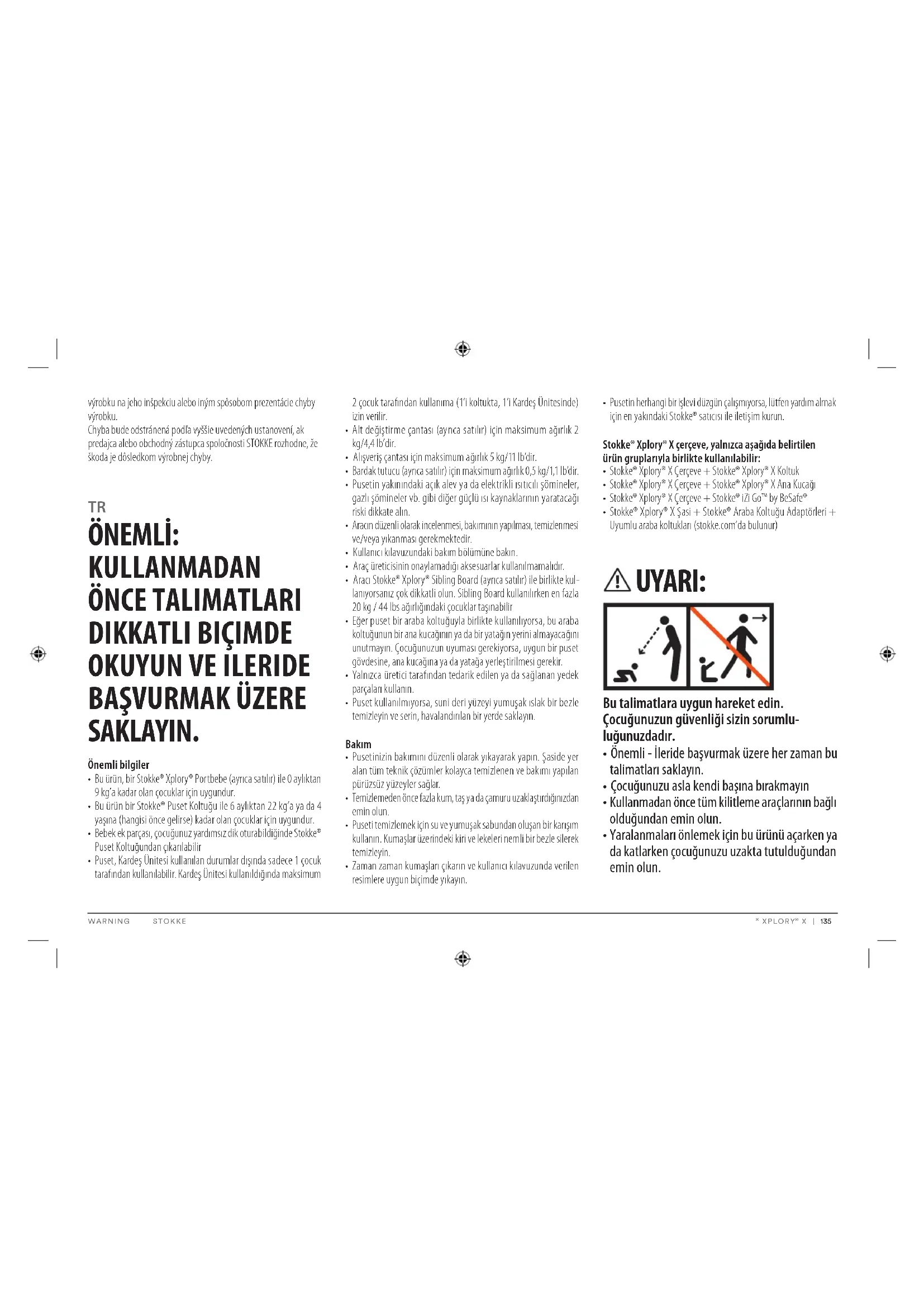 Stokke® Xplory® X Şasi + Stokke® Araba Koltuğu Adaptörleri + Uyumlu araba koltukları (stokke.com’da bulunur) UYARI: Bu talimatlara uygun hareket edin. Çocuğunuzun güvenliği sizin sorumlu- luğunuzdadır.