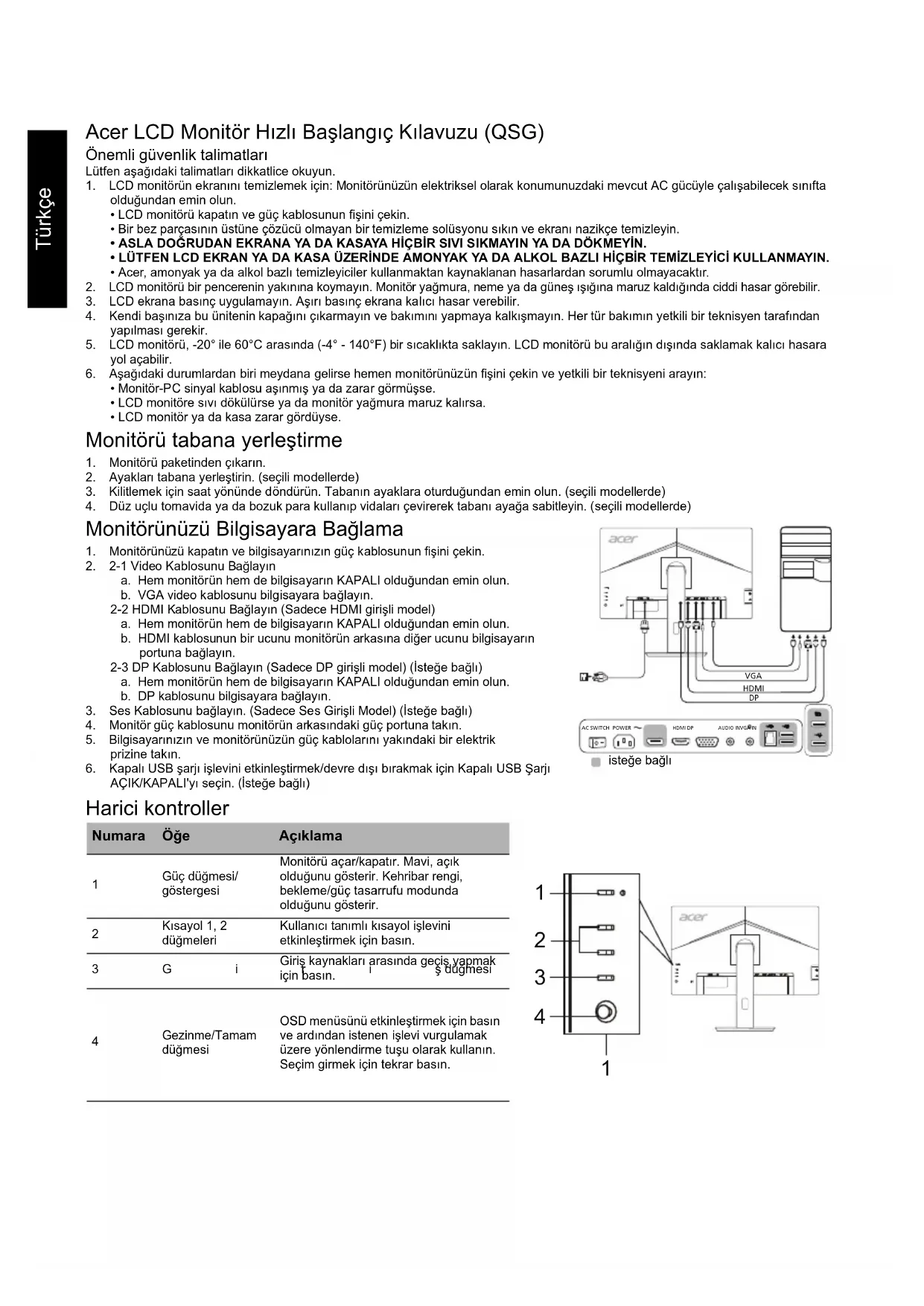 Süper Netlik Yatay Konum (sadece Analog girişli model) Dikey Konum (sadece Analog girişli model) Saat (sadece Analog girişli model) Odak (sadece Analog girişli model) Oto. Yapılandırma (sadece Analog girişli model) Gamma Renk Sıcaklığı Modlar sRGB Gri Tonlama Modu 6 eks. Doygun. 6 eks. Ton Ses Seviyesi Sessiz Aşırı Hız Adaptive-Sync Dil OSD Zaman Aşımı Şeffaflık Menü Kilidi Giriş Otomatik Kaynak Geniş Mod Kısayol Atama DDC/CI Açma/Kapama HDMI Siyah düzey Hızlı Başlt Modu Güç Kapalı USB Şarjı Ekran Bilgisi Tüm Ayarları Sıfırla Çıkış Teknik özellikler, modele ve/veya bölgeye göre değişiklik gösterir.Română Ghid de iniţiere rapidă pentru monitorul LCD Acer (QSG) Instrucţiuni de siguranţă importante Vă rugăm să citiţi cu atenţie instrucţiunile următoare. 1. Pentru a curăţa ecranul monitorului LCD: Verificaţi dacă monitorul are parametri electrici corespunzători alimentării cu c.a. disponibile în locaţia dvs.