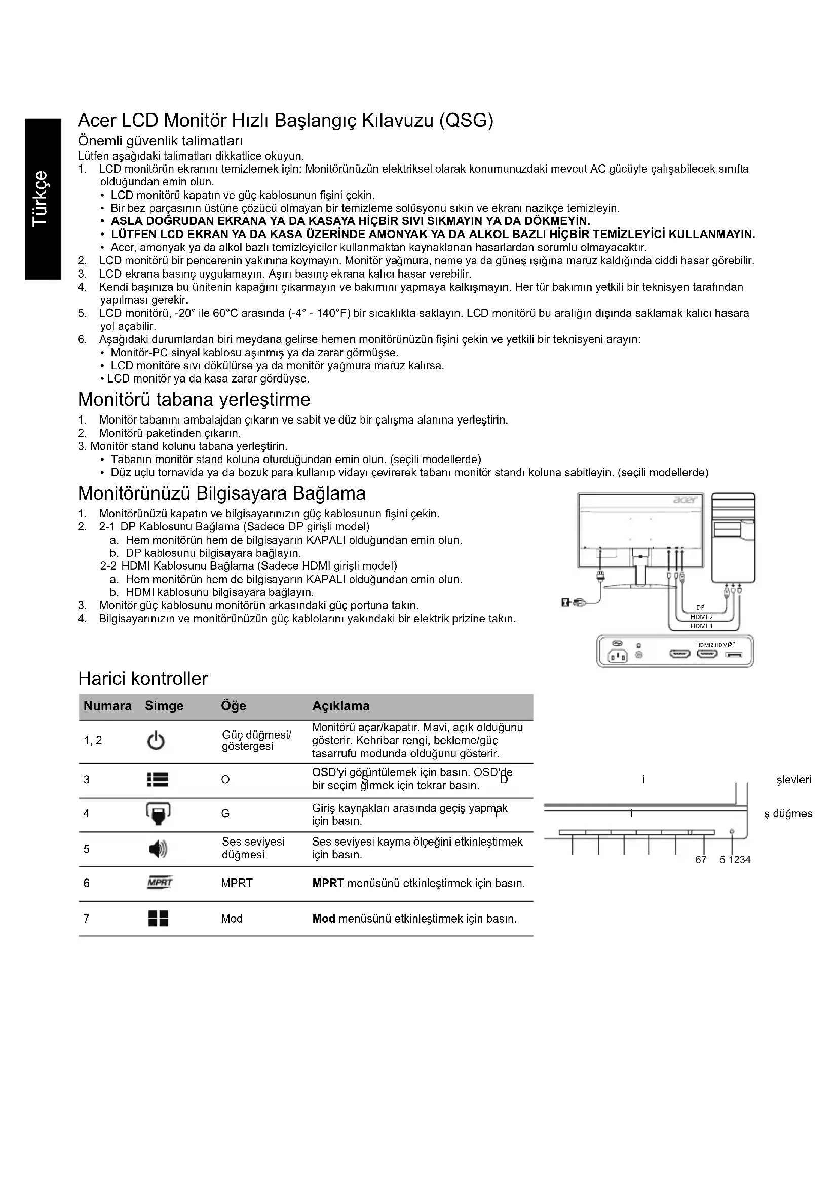Ses seviyesi düğmesi Ses seviyesi kayma ölçeğini etkinleştirmek için basın. 6MPRTMPRT menüsünü etkinleştirmek için basın. 7ModMod menüsünü etkinleştirmek için basın. HDMI 2 HDMI 1 HDMI2 HDMI1 1234567Türkçe Düzenlemeler ve güvenlik bildirimleri FCC bildirimi Bu aygıt test edilmiş ve FCC kurallarının 15. maddesi uyarınca B Sınıfı dijital aygıt olarak kabul edilmiştir. Bu sınırlar evde kurulumda meydana gelebilecek zararlı bir müdahaleye karşı koruma sağlamak için geliştirilmiştir. Bu aygıt radyo frekansı enerjisi yaratı r, kullanır ve hatta saçabilir; ayrıca, talimatlara uygun olarak kurulmaz ve kullanılmazsa radyo iletişiminde zararlı bir müdahalede bulunabilir. Bununla birlikte, bu müdahalenin talimatlara uygun kurulumda meydana gelmeyeceğinin garantisi yoktur. Aygıt, radyo ya da televizyonun sinyal alımına aygıtı kapatıp açarak tespit edilebilen zararlı bir müdahalede bulunursa kullanıcı aşağıdaki önlemlerin birini ya da birden fazlasını alarak bu müdahaleyi düzeltmeyi deneyebilir: Alıcı antenin yerini ya da yönünü değiştirin. Aygıt ile alıcıyı birbirinden biraz daha uzaklaştırın. Aygıtı, alıcının bağlı olduğundan faklı bir devrede bulunan çıkışa bağlayın. Yardım için satıcınıza ya da tecrübeli bir radyo/televizyon teknisyenine danışın. CE Uygunluk beyanı Bu belge ile Acer Inc. bu LCD monitörün EMC Yönetmeliği 2014/30/AB, Alçak Gerilim Yönetmeliği 2014/35/AB ve RoHS Yönetmeliği 2011/65/AB ile 2009/125/AT Yönetmeliği yasalarının enerji ürünleri için çevreci bir tasarım yapacak bir sistem kurmayı gerektiren temel gerekliliklerine ve diğer maddelerine uyduğunu beyan eder. Uyarı: Monitörün zarar görmesini önlemek için monitörü tabanından tutarak kaldırmayın. Uyarı: Blendajlı kablolar Diğer bilişim aygıtlarıyla yapılacak tüm bağlantılar EMC düzenlemelerine uyum sağlamak için blendajlı kablolar kullanılarak yapılmalıdır. Uyarı: Çevresel aygıtlar Bu ekipmana sadece B Sınıfı sınırlarına uygun olduğu sertifikayla belirtilmiş çevresel aygıtlar (giriş/çıkış aygıtları, terminaller, yazıcılar vb.) eklenebilir. Sertifikasız çevresel aygıtlarla çalıştırılırsa radyo ve TV alıcılarına müdahale meydana gelebilir. Dikkat Üretici tarafından açıkça onaylanmamış değişiklikler ve düzenlemeler, kullanıcının Federal İletişim Komisyonu tarafından verilen bu ürünü çalıştırma hakkının feshedilmesine neden olabilir. Çalışma koşulları Bu aygıt FCC Hükümlerinin 15. maddesine uygundur. Çalışma şu iki şarta uygunluk gerektirir: (1) bu aygıt zararlı bir müdahaleye neden olmamalıdır ve (2) istem dışı çalıştırma da dahil olmak üzere bu aygıt alınan her müdahaleyi üstlenmek durumundadır. Uyarı: Kanadalı kullanıcılar Bu B Sınıfı tertibat, Kanada ICES-003 yasasına uygundur. Remarque à l'intention des utilisateurs canadiens Cet appareil numérique de la classe B est conforme à la norme NMB-003 du Canada. Atılacak Ekipmanın Avrupa Birliği Üyesi Ülkelerde Özel Mekanda Kullanıcılarca Atılması Üründe ve ürünün paketinde bulunan bu simge, bu ürünün diğer ev atıklarınızla atılmaması gerektiğini gösterir. Bunun yerine, atılacak ekipmanınızı atık elektrikli cihaz toplama noktasına teslim etmek sizin sorumluluğunuzdur. Ürününüzün bu şekilde ayrı atılması ve geri dönüştürülmesi doğal kaynakları koruyacak ve ürünün insan sağlığını ve çevreyi koruyacak şekilde geri dönüştürülmesini sağlayacaktır. Atık ürününüzü nereye teslim edebileceğiniz hakkında daha fazla bilgi alabilmek için lütfen yerel belediyeyle, çöp hizmetlerinizi sunan birimle ya da ürünü aldığınız mağazayla iletişime geçin.Türkçe