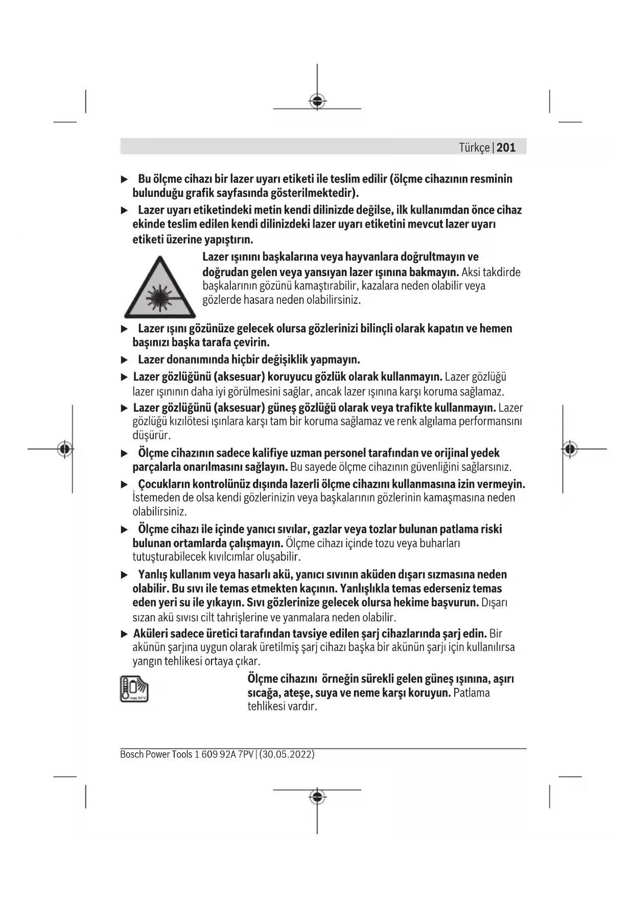 Τα όργανα μέτρησης οι φορτιστές, οι μπαταρίες, τα εξαρτήματα και οι συσκευασί- ες πρέπει να ανακυκλώνονται με τρόπο φιλικό προς το περιβάλλον. Μη ρίχνετε τα όργανα μέτρησης, τους φορτιστές και τις μπαταρίες στα οικιακά απορρίμματα! Μόνο για χώρες τηςΕΕ: Σύμφωνα με την Ευρωπαϊκή οδηγία 2012/19/ΕΕ σχετικά με τις παλιές ηλεκτρικές και ηλε- κτρονικές συσκευές και τη μεταφορά της οδηγίας αυτής σε εθνικό δίκαιο τα άχρηστα όργανα μέτρησης και φορτιστές και σύμφωνα με την Ευρωπαϊκή οδηγία 2006/66/ΕΚ οι χαλασμένες Bosch Power Tools 1 609 92A 7PV | (30.05.2022)200 | Türkçe ή χρησιμοποιημένες μπαταρίες πρέπει να συλλέγονται ξεχωριστά, για να ανακυκλωθούν με τρόπο φιλικό προς το περιβάλλον. Σε περίπτωση μη ενδεδειγμένης απόσυρσης οι ηλεκτρικές και ηλεκτρονικές συσκευές λόγω ενδεχομένης παρουσίας επικίνδυνων ουσιών μπορούν να έχουν επιβλαβείς επιπτώσεις στο περιβάλλον και στην ανθρώπινη υγεία. Επαναφορτιζόμενες μπαταρίες/Μπαταρίες: Li-Ion: Προσέξτε παρακαλώ τις υποδείξεις στην ενότητα Μεταφορά (βλέπε «Μεταφορά», Σελί- δα199). u Οι ενσωματωμένες μπαταρίες επιτρέπεται να αφαιρεθούν για την απόσυρση μόνο από ειδικευμένο προσωπικό. Με το άνοιγμα του κελύφους του περιβλήματος μπορεί να καταστραφεί το όργανο μέτρησης. Για την αφαίρεση της μπαταρίας από το όργανο μέτρησης, ενεργοποιήστε το όργανο μέτρη- σης τόσο, μέχρι να αδειάσει εντελώς η μπαταρία. Ξεβιδώστε τις βίδες στο περίβλημα και αφαιρέστε το κέλυφος του περιβλήματος, για να αφαιρέσετε την μπαταρία. Για την αποφυγή ενός βραχυκυκλώματος, αποσυνδέστε τις συνδέσεις στην μπαταρία ξεχωριστά τη μια μετά την άλλη και μονώστε στη συνέχεια τους πόλους. Επίσης και σε πλήρη αποφόρτιση υπάρχει ακόμα μια υπόλοιπη χωρητικότητα (φορτίο) στην μπαταρία, που σε περίπτωση βραχυκυκ- κλώματος μπορεί να ελευθερωθεί. Türkçe Güvenlik talimatı Ölçme cihazı ile tehlikesiz ve güvenli biçimde çalışabilmek için bütün güvenlik talimatı ve uyarılar okunmalıdır. Ölçme cihazı bu güvenlik talimatına uygun olarak kullanılmazsa, ölçme cihazına entegre koruyucu donanımların işlevi kısıtlanabilir. Ölçme cihazı üzerindeki uyarı etiketlerini hiçbir zaman görünmez duruma getirmeyin. BU TALİMATLARI İYİ VE GÜVENLİ BİR YERDE SAKLAYIN VE ÖLÇME CİHAZINI BAŞKASINA VERDİĞİNİZDE BUNLARI DA BİRLİKTE VERİN. u Dikkat – Burada anılan kullanım ve ayar donanımlarından farklı donanımlar veya farklı yöntemler kullanıldığı takdirde, tehlikeli ışın yayılımına neden olunabilir. 1 609 92A 7PV | (30.05.2022) Bosch Power ToolsTürkçe | 201 u Bu ölçme cihazı bir lazer uyarı etiketi ile teslim edilir (ölçme cihazının resminin bulunduğu grafik sayfasında gösterilmektedir). u Lazer uyarı etiketindeki metin kendi dilinizde değilse, ilk kullanımdan önce cihaz ekinde teslim edilen kendi dilinizdeki lazer uyarı etiketini mevcut lazer uyarı etiketi üzerine yapıştırın. Lazer ışınını başkalarına veya hayvanlara doğrultmayın ve doğrudan gelen veya yansıyan lazer ışınına bakmayın. Aksi takdirde başkalarının gözünü kamaştırabilir, kazalara neden olabilir veya gözlerde hasara neden olabilirsiniz. u Lazer ışını gözünüze gelecek olursa gözlerinizi bilinçli olarak kapatın ve hemen başınızı başka tarafa çevirin. u Lazer donanımında hiçbir değişiklik yapmayın. u Lazer gözlüğünü (aksesuar) koruyucu gözlük olarak kullanmayın. Lazer gözlüğü lazer ışınının daha iyi görülmesini sağlar, ancak lazer ışınına karşı koruma sağlamaz. u Lazer gözlüğünü (aksesuar) güneş gözlüğü olarak veya trafikte kullanmayın. Lazer gözlüğü kızılötesi ışınlara karşı tam bir koruma sağlamaz ve renk algılama performansını düşürür. u Ölçme cihazının sadece kalifiye uzman personel tarafından ve orijinal yedek parçalarla onarılmasını sağlayın. Bu sayede ölçme cihazının güvenliğini sağlarsınız. u Çocukların kontrolünüz dışında lazerli ölçme cihazını kullanmasına izin vermeyin. İstemeden de olsa kendi gözlerinizin veya başkalarının gözlerinin kamaşmasına neden olabilirsiniz. u Ölçme cihazı ile içinde yanıcı sıvılar, gazlar veya tozlar bulunan patlama riski bulunan ortamlarda çalışmayın. Ölçme cihazı içinde tozu veya buharları tutuşturabilecek kıvılcımlar oluşabilir. u Yanlış kullanım veya hasarlı akü, yanıcı sıvının aküden dışarı sızmasına neden olabilir. Bu sıvı ile temas etmekten kaçının. Yanlışlıkla temas ederseniz temas eden yeri su ile yıkayın. Sıvı gözlerinize gelecek olursa hekime başvur