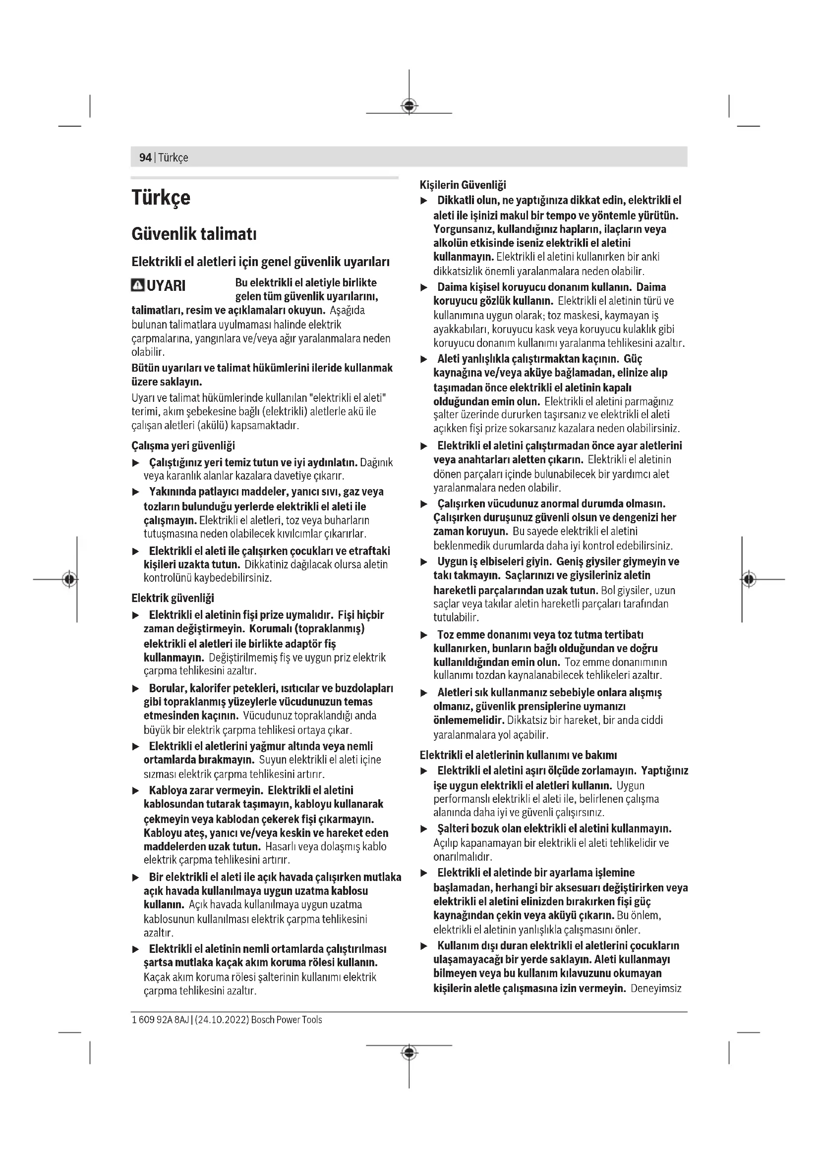Τα ηλεκτρικά εργαλεία, οι μπαταρίες, τα εξαρτή- ματα και οι συσκευασίες πρέπει να ανακυκλώνο- νται με τρόπο φιλικό προς το περιβάλλον. Μην ρίχνετε τα ηλεκτρικά εργαλεία και τις μπατα- ρίες στα απορρίμματα του σπιτιού σας! Μόνο για χώρες τηςΕΕ: Σύμφωνα με την Ευρωπαϊκή οδηγία 2012/19/ΕΕ σχετικά με τις παλιές ηλεκτρικές και ηλεκτρονικές συσκευές και τη μετα- φορά της οδηγίας αυτής σε εθνικό δίκαιο τα άχρηστα ηλεκτρι- κά εργαλεία και σύμφωνα με την Ευρωπαϊκή οδηγία 2006/66/ΕΚ οι χαλασμένες ή χρησιμοποιημένες μπαταρίες πρέπει να συλλέγονται ξεχωριστά, για να ανακυκλωθούν με τρόπο φιλικό προς το περιβάλλον. Σε περίπτωση μη ενδεδειγμένης απόσυρσης οι ηλεκτρικές και ηλεκτρονικές συσκευές λόγω ενδεχομένης παρουσίας επικίν- δυνων ουσιών μπορούν να έχουν επιβλαβείς επιπτώσεις στο περιβάλλον και στην ανθρώπινη υγεία. Μπαταρίες/Επαναφορτιζόμενες μπαταρίες: Li-Ion: Προσέξτε παρακαλώ τις υποδείξεις στην ενότητα Μεταφορά (βλέπε «Μεταφορά», Σελίδα93). Bosch Power Tools 1 609 92A 8AJ | (24.10.2022)94 | Türkçe Türkçe Güvenlik talimatı Elektrikli el aletleri için genel güvenlik uyarıları UYARI Bu elektrikli el aletiyle birlikte gelen tüm güvenlik uyarılarını, talimatları, resim ve açıklamaları okuyun. Aşağıda bulunan talimatlara uyulmaması halinde elektrik çarpmalarına, yangınlara ve/veya ağır yaralanmalara neden olabilir. Bütün uyarıları ve talimat hükümlerini ileride kullanmak üzere saklayın. Uyarı ve talimat hükümlerinde kullanılan "elektrikli el aleti" terimi, akım şebekesine bağlı (elektrikli) aletlerle akü ile çalışan aletleri (akülü) kapsamaktadır. Çalışma yeri güvenliği u Çalıştığınız yeri temiz tutun ve iyi aydınlatın. Dağınık veya karanlık alanlar kazalara davetiye çıkarır. u Yakınında patlayıcı maddeler, yanıcı sıvı, gaz veya tozların bulunduğu yerlerde elektrikli el aleti ile çalışmayın. Elektrikli el aletleri, toz veya buharların tutuşmasına neden olabilecek kıvılcımlar çıkarırlar. u Elektrikli el aleti ile çalışırken çocukları ve etraftaki kişileri uzakta tutun. Dikkatiniz dağılacak olursa aletin kontrolünü kaybedebilirsiniz. Elektrik güvenliği u Elektrikli el aletinin fişi prize uymalıdır. Fişi hiçbir zaman değiştirmeyin. Korumalı (topraklanmış) elektrikli el aletleri ile birlikte adaptör fiş kullanmayın. Değiştirilmemiş fiş ve uygun priz elektrik çarpma tehlikesini azaltır. u Borular, kalorifer petekleri, ısıtıcılar ve buzdolapları gibi topraklanmış yüzeylerle vücudunuzun temas etmesinden kaçının. Vücudunuz topraklandığı anda büyük bir elektrik çarpma tehlikesi ortaya çıkar. u Elektrikli el aletlerini yağmur altında veya nemli ortamlarda bırakmayın. Suyun elektrikli el aleti içine sızması elektrik çarpma tehlikesini artırır. u Kabloya zarar vermeyin. Elektrikli el aletini kablosundan tutarak taşımayın, kabloyu kullanarak çekmeyin veya kablodan çekerek fişi çıkarmayın. Kabloyu ateş, yanıcı ve/veya keskin ve hareket eden maddelerden uzak tutun. Hasarlı veya dolaşmış kablo elektrik çarpma tehlikesini artırır. u Bir elektrikli el aleti ile açık havada çalışırken mutlaka açık havada kullanılmaya uygun uzatma kablosu kullanın. Açık havada kullanılmaya uygun uzatma kablosunun kullanılması elektrik çarpma tehlikesini azaltır. u Elektrikli el aletinin nemli ortamlarda çalıştırılması şartsa mutlaka kaçak akım koruma rölesi kullanın. Kaçak akım koruma rölesi şalterinin kullanımı elektrik çarpma tehlikesini azaltır. Kişilerin Güvenliği u Dikkatli olun, ne yaptığınıza dikkat edin, elektrikli el aleti ile işinizi makul bir tempo ve yöntemle yürütün. Yorgunsanız, kullandığınız hapların, ilaçların veya alkolün etkisinde iseniz elektrikli el aletini kullanmayın. Elektrikli el aletini kullanırken bir anki dikkatsizlik önemli yaralanmalara neden olabilir. u Daima kişisel koruyucu donanım kullanın. Daima koruyucu gözlük kullanın. Elektrikli el aletinin türü ve kullanımına uygun olarak; toz maskesi, kaymayan iş ayakkabıları, koruyucu kask veya koruyucu kulaklık gibi koruyucu donanım kullanımı yaralanma tehlikesini azaltır. u Aleti yanlışlıkla çalıştırmaktan kaçının. Güç kaynağına ve/veya aküye bağlamadan, elinize alıp taşımadan önce elektrikli el aletinin kapalı olduğundan emin olun. Elektrikli el aletini parmağınız şalter üzerinde dururken taşırsanız ve elektrikli el aleti açıkken fişi prize sokarsanız kazalara neden olabilirsiniz. u Elektrikli el aletini çalıştırmadan önce ayar aletlerini veya anahtarları aletten çıkarın. Elektrikli el aletinin dönen parçaları içinde bulunabilecek bir yardımcı alet yaralanmalara neden olabilir. u Çalışırken vücudunuz anormal durumda olmasın. Çalışırken duruşunuz güvenli olsun ve dengenizi her zaman koruyun. Bu sayede elektrikli el aletini beklenmedik durumlarda daha iyi kontrol edebilirsiniz. u Uygun iş elbiseleri giyin. Geniş giysiler giymeyin ve takı takmayın. Saçlarınızı ve giysileriniz aletin hareketli parçalarından uzak tutun. Bol giysiler, uzun saçlar veya takılar aletin hareketli parçalar