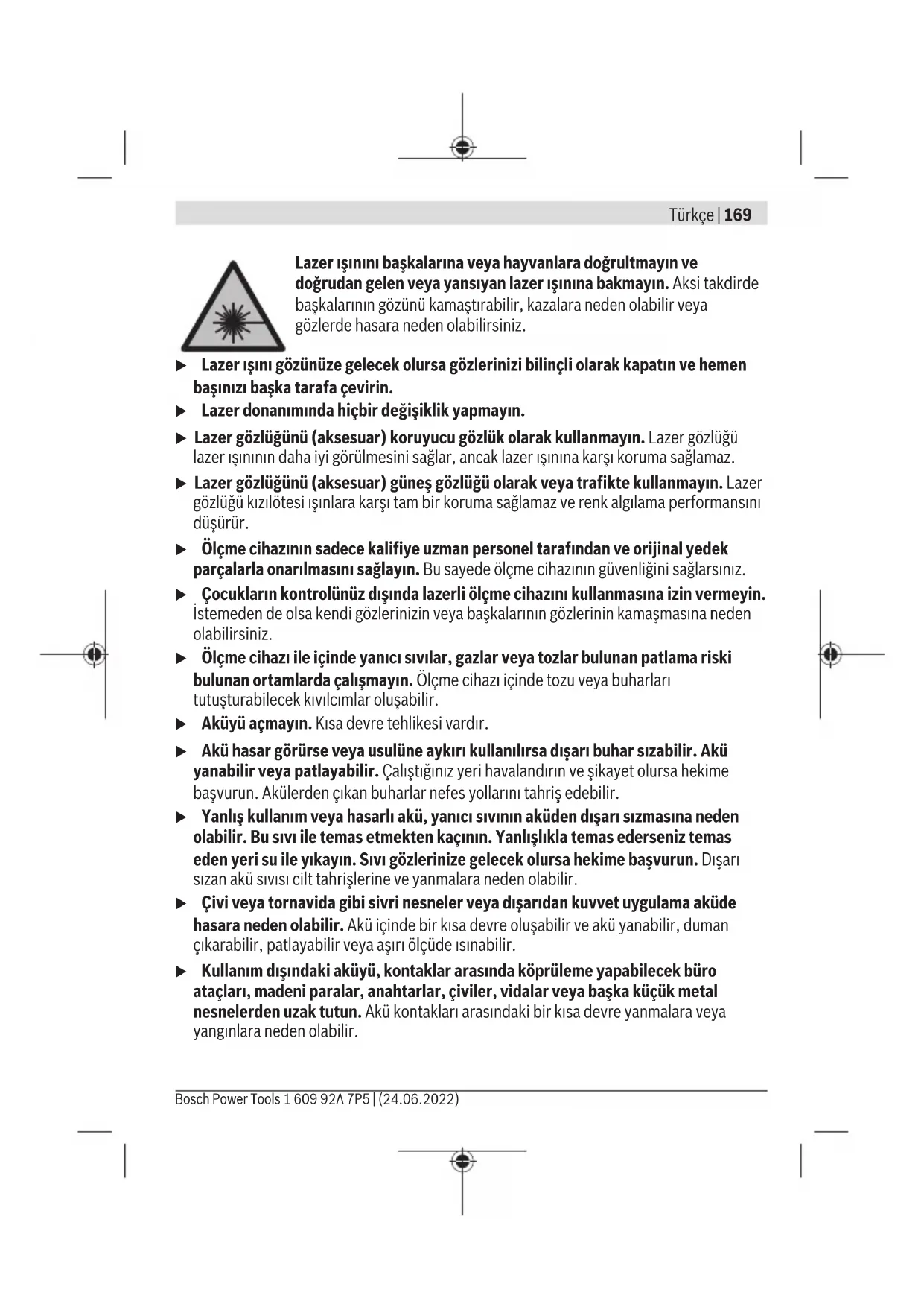Μη ρίχνετε τα όργανα μέτρησης και τις μπαταρίες στα οικιακά απορρίμματα! Μόνο για χώρες τηςΕΕ: Σύμφωνα με την Ευρωπαϊκή οδηγία 2012/19/ΕΕ σχετικά με τις παλιές ηλεκτρικές και ηλε- κτρονικές συσκευές και τη μεταφορά της οδηγίας αυτής σε εθνικό δίκαιο τα άχρηστα όργανα Bosch Power Tools 1 609 92A 7P5 | (24.06.2022)168 | Türkçe μέτρησης και σύμφωνα με την Ευρωπαϊκή οδηγία 2006/66/ΕΚ οι χαλασμένες ή χρησιμοποι- ημένες μπαταρίες πρέπει να συλλέγονται ξεχωριστά, για να ανακυκλωθούν με τρόπο φιλικό προς το περιβάλλον. Σε περίπτωση μη ενδεδειγμένης απόσυρσης οι ηλεκτρικές και ηλεκτρονικές συσκευές λόγω ενδεχομένης παρουσίας επικίνδυνων ουσιών μπορούν να έχουν επιβλαβείς επιπτώσεις στο περιβάλλον και στην ανθρώπινη υγεία. Επαναφορτιζόμενες μπαταρίες/Μπαταρίες: Li-Ion: Προσέξτε παρακαλώ τις υποδείξεις στην ενότητα Μεταφορά (βλέπε «Μεταφορά», Σελί- δα167). Türkçe Güvenlik talimatı Ölçme cihazı ile tehlikesiz ve güvenli biçimde çalışabilmek için bütün güvenlik talimatı ve uyarılar okunmalıdır. Ölçme cihazı bu güvenlik talimatına uygun olarak kullanılmazsa, ölçme cihazına entegre koruyucu donanımların işlevi kısıtlanabilir. Ölçme cihazı üzerindeki uyarı etiketlerini hiçbir zaman görünmez duruma getirmeyin. BU TALİMATLARI İYİ VE GÜVENLİ BİR YERDE SAKLAYIN VE ÖLÇME CİHAZINI BAŞKASINA VERDİĞİNİZDE BUNLARI DA BİRLİKTE VERİN. u Dikkat – Burada anılan kullanım ve ayar donanımlarından farklı donanımlar veya farklı yöntemler kullanıldığı takdirde, tehlikeli ışın yayılımına neden olunabilir. u Bu ölçme cihazı bir lazer uyarı etiketi ile teslim edilir (ölçme cihazının resminin bulunduğu grafik sayfasında gösterilmektedir). u Lazer uyarı etiketindeki metin kendi dilinizde değilse, ilk kullanımdan önce cihaz ekinde teslim edilen kendi dilinizdeki lazer uyarı etiketini mevcut lazer uyarı etiketi üzerine yapıştırın. 1 609 92A 7P5 | (24.06.2022) Bosch Power ToolsTürkçe | 169 Lazer ışınını başkalarına veya hayvanlara doğrultmayın ve doğrudan gelen veya yansıyan lazer ışınına bakmayın. Aksi takdirde başkalarının gözünü kamaştırabilir, kazalara neden olabilir veya gözlerde hasara neden olabilirsiniz. u Lazer ışını gözünüze gelecek olursa gözlerinizi bilinçli olarak kapatın ve hemen başınızı başka tarafa çevirin. u Lazer donanımında hiçbir değişiklik yapmayın. u Lazer gözlüğünü (aksesuar) koruyucu gözlük olarak kullanmayın. Lazer gözlüğü lazer ışınının daha iyi görülmesini sağlar, ancak lazer ışınına karşı koruma sağlamaz. u Lazer gözlüğünü (aksesuar) güneş gözlüğü olarak veya trafikte kullanmayın. Lazer gözlüğü kızılötesi ışınlara karşı tam bir koruma sağlamaz ve renk algılama performansını düşürür. u Ölçme cihazının sadece kalifiye uzman personel tarafından ve orijinal yedek parçalarla onarılmasını sağlayın. Bu sayede ölçme cihazının güvenliğini sağlarsınız. u Çocukların kontrolünüz dışında lazerli ölçme cihazını kullanmasına izin vermeyin. İstemeden de olsa kendi gözlerinizin veya başkalarının gözlerinin kamaşmasına neden olabilirsiniz. u Ölçme cihazı ile içinde yanıcı sıvılar, gazlar veya tozlar bulunan patlama riski bulunan ortamlarda çalışmayın. Ölçme cihazı içinde tozu veya buharları tutuşturabilecek kıvılcımlar oluşabilir. u Aküyü açmayın. Kısa devre tehlikesi vardır. u Akü hasar görürse veya usulüne aykırı kullanılırsa dışarı buhar sızabilir. Akü yanabilir veya patlayabilir. Çalıştığınız yeri havalandırın ve şikayet olursa hekime başvurun. Akülerden çıkan buharlar nefes yollarını tahriş edebilir. u Yanlış kullanım veya hasarlı akü, yanıcı sıvının aküden dışarı sızmasına neden olabilir. Bu sıvı ile temas etmekten kaçının. Yanlışlıkla temas ederseniz temas eden yeri su ile yıkayın. Sıvı gözlerinize gelecek olursa hekime başvurun. Dışarı sızan akü sıvısı cilt tahrişlerine ve yanmalara neden olabilir. u Çivi veya tornavida gibi sivri nesneler veya dışarıdan kuvvet uygulama aküde hasara neden olabilir. Akü içinde bir kısa devre oluşabilir ve akü yanabilir, duman çıkarabilir, patlayabilir veya aşırı ölçüde ısınabilir. u Kullanım dışındaki aküyü, kontaklar arasında köprüleme yapabilecek büro ataçları, madeni paralar, anahtarlar, çiviler, vidalar veya başka küçük metal nesnelerden uzak tutun. Akü kontakları arasındaki bir kısa devre yanmalara veya yangınlara neden olabilir. Bosch Power Tools 1 609 92A 7P5 | (24.06.2022)170 | Türkçe u Aküyü sadece üreticinin ürünlerinde kullanın. Ancak bu yolla akü tehlikeli zorlanmalara karşı korunur. u Aküleri sadece üretici tarafından tavsiye edilen şarj cihazlarında şarj edin. Bir akünün şarjına uygun olarak üretilmiş şarj cihazı başka bir akünün şarjı için kullanılırsa yangın tehlikesi ortaya çıkar. Aküyü sıcaktan, sürekli gelen güneş ışınından, ateşten, kirden, sudan ve nemden koruyun. Patlama ve kısa devre tehlikesi vardır. Soket şebeke parçası için geçerli güvenlik uyarıları u Bu soket şebeke parçası çocukların ve fiziksel, duyusal veya zihinsel yetenekleri sınırlı veya yeterli deneyim ve bilgi