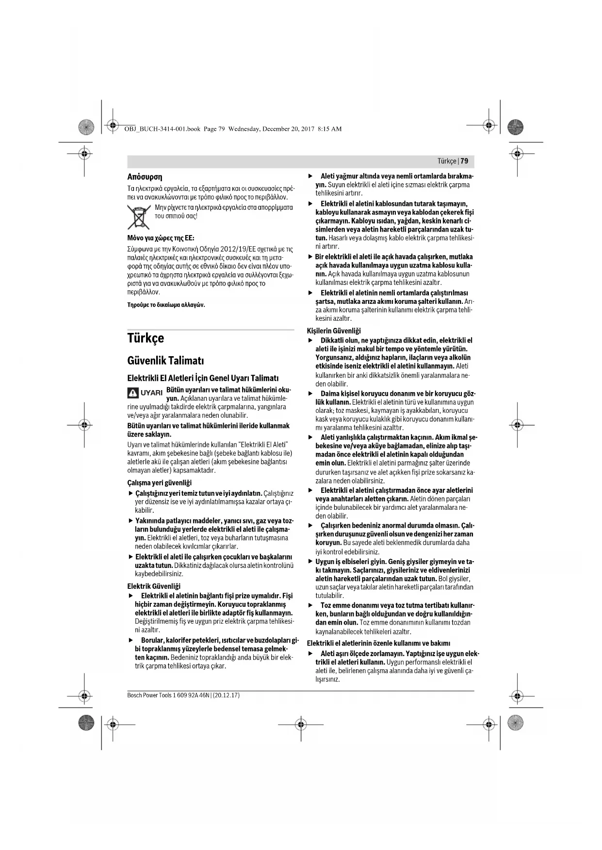 Τα ηλεκτρικά εργαλεία, τα εξαρτήματα και οι συσκευασίες πρέ- πει να ανακυκλώνονται με τρόπο φιλικό προς το περιβάλλον. Μην ρίχνετε τα ηλεκτρικά εργαλεία στα απορρίμματα του σπιτιού σας! Μόνο για χώρες της ΕΕ: Σύμφωνα με την Κοινοτική Οδηγία 2012/19/EE σχετικά με τις παλαιές ηλεκτρικές και ηλεκτρονικές συσκευές και τη μετα- φορά της οδηγίας αυτής σε εθνικό δίκαιο δεν είναι πλέον υπο- χρεωτικό τα άχρηστα ηλεκτρικά εργαλεία να συλλέγονται ξεχω- ριστά για να ανακυκλωθούν με τρόπο φιλικό προς το περιβάλλον. Τηρούμε το δικαίωμα αλλαγών. Türkçe Güvenlik Talimatı Elektrikli El Aletleri İçin Genel Uyarı Talimatı Bütün uyarıları ve talimat hükümlerini oku- yun. Açıklanan uyarılara ve talimat hükümle- rine uyulmadığı takdirde elektrik çarpmalarına, yangınlara ve/veya ağır yaralanmalara neden olunabilir. Bütün uyarıları ve talimat hükümlerini ileride kullanmak üzere saklayın. Uyarı ve talimat hükümlerinde kullanılan “Elektrikli El Aleti” kavramı, akım şebekesine bağlı (şebeke bağlantı kablosu ile) aletlerle akü ile çalışan aletleri (akım şebekesine bağlantısı olmayan aletler) kapsamaktadır. Çalışma yeri güvenliği Çalıştığınız yeri temiz tutun ve iyi aydınlatın. Çalıştığınız yer düzensiz ise ve iyi aydınlatılmamışsa kazalar ortaya çı- kabilir. Yakınında patlayıcı maddeler, yanıcı sıvı, gaz veya toz- ların bulunduğu yerlerde elektrikli el aleti ile çalışma- yın. Elektrikli el aletleri, toz veya buharların tutuşmasına neden olabilecek kıvılcımlar çıkarırlar. Elektrikli el aleti ile çalışırken çocukları ve başkalarını uzakta tutun. Dikkatiniz dağılacak olursa aletin kontrolünü kaybedebilirsiniz. Elektrik Güvenliği Elektrikli el aletinin bağlantı fişi prize uymalıdır. Fişi hiçbir zaman değiştirmeyin. Koruyucu topraklanmış elektrikli el aletleri ile birlikte adaptör fiş kullanmayın. Değiştirilmemiş fiş ve uygun priz elektrik çarpma tehlikesi- ni azaltır. Borular, kalorifer petekleri, ısıtıcılar ve buzdolapları gi- bi topraklanmış yüzeylerle bedensel temasa gelmek- ten kaçının. Bedeniniz topraklandığı anda büyük bir elek- trik çarpma tehlikesi ortaya çıkar. Aleti yağmur altında veya nemli ortamlarda bırakma- yın. Suyun elektrikli el aleti içine sızması elektrik çarpma tehlikesini artırır. Elektrikli el aletini kablosundan tutarak taşımayın, kabloyu kullanarak asmayın veya kablodan çekerek fişi çıkarmayın. Kabloyu ısıdan, yağdan, keskin kenarlı ci- simlerden veya aletin hareketli parçalarından uzak tu- tun. Hasarlı veya dolaşmış kablo elektrik çarpma tehlikesi- ni artırır. Bir elektrikli el aleti ile açık havada çalışırken, mutlaka açık havada kullanılmaya uygun uzatma kablosu kulla- nın. Açık havada kullanılmaya uygun uzatma kablosunun kullanılması elektrik çarpma tehlikesini azaltır. Elektrikli el aletinin nemli ortamlarda çalıştırılması şartsa, mutlaka arıza akımı koruma şalteri kullanın. Arı- za akımı koruma şalterinin kullanımı elektrik çarpma tehli- kesini azaltır. Kişilerin Güvenliği Dikkatli olun, ne yaptığınıza dikkat edin, elektrikli el aleti ile işinizi makul bir tempo ve yöntemle yürütün. Yorgunsanız, aldığınız hapların, ilaçların veya alkolün etkisinde iseniz elektrikli el aletini kullanmayın. Aleti kullanırken bir anki dikkatsizlik önemli yaralanmalara ne- den olabilir. Daima kişisel koruyucu donanım ve bir koruyucu göz- lük kullanın. Elektrikli el aletinin türü ve kullanımına uygun olarak; toz maskesi, kaymayan iş ayakkabıları, koruyucu kask veya koruyucu kulaklık gibi koruyucu donanım kullanı- mı yaralanma tehlikesini azalttır. Aleti yanlışlıkla çalıştırmaktan kaçının. Akım ikmal şe- bekesine ve/veya aküye bağlamadan, elinize alıp taşı- madan önce elektrikli el aletinin kapalı olduğundan emin olun. Elektrikli el aletini parmağınız şalter üzerinde dururken taşırsanız ve alet açıkken fişi prize sokarsanız ka- zalara neden olabilirsiniz. Elektrikli el aletini çalıştırmadan önce ayar aletlerini veya anahtarları aletten çıkarın. Aletin dönen parçaları içinde bulunabilecek bir yardımcı alet yaralanmalara ne- den olabilir. Çalışırken bedeniniz anormal durumda olmasın. Çalı- şırken duruşunuz güvenli olsun ve dengenizi her zaman koruyun. Bu sayede aleti beklenmedik durumlarda daha iyi kontrol edebilirsiniz.