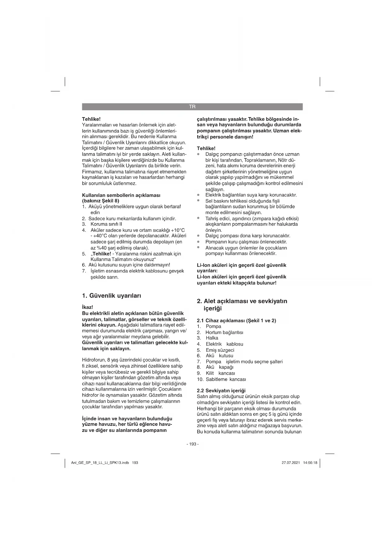 Alınacak uygun önlemler ile çocukların pompayı kullanması önlenecektir. Li-Ion aküleri için geçerli özel güvenlik uyarıları: Li-Ion aküleri için geçerli özel güvenlik uyarıları ekteki kitapçıkta bulunur!