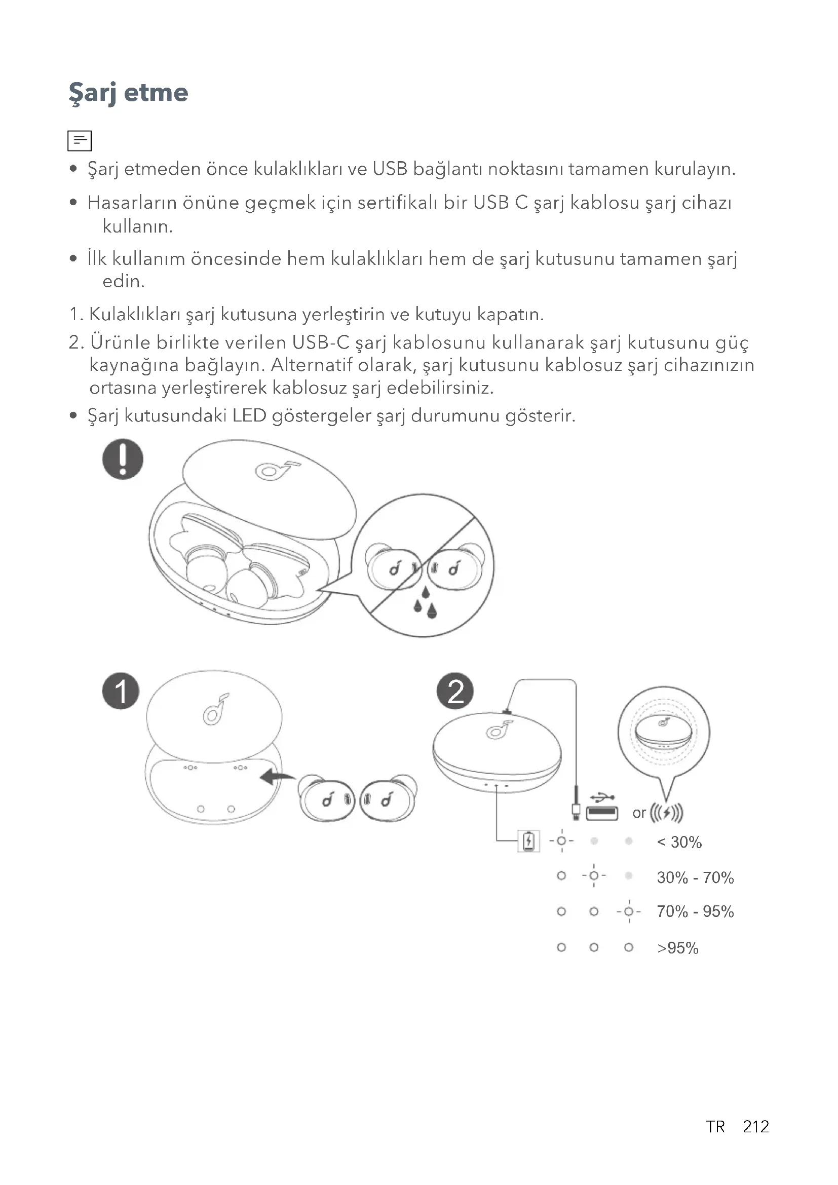 - Şarj etmeden önce kulaklıkları ve USB bağlantı noktasını tamamen kurulayın.