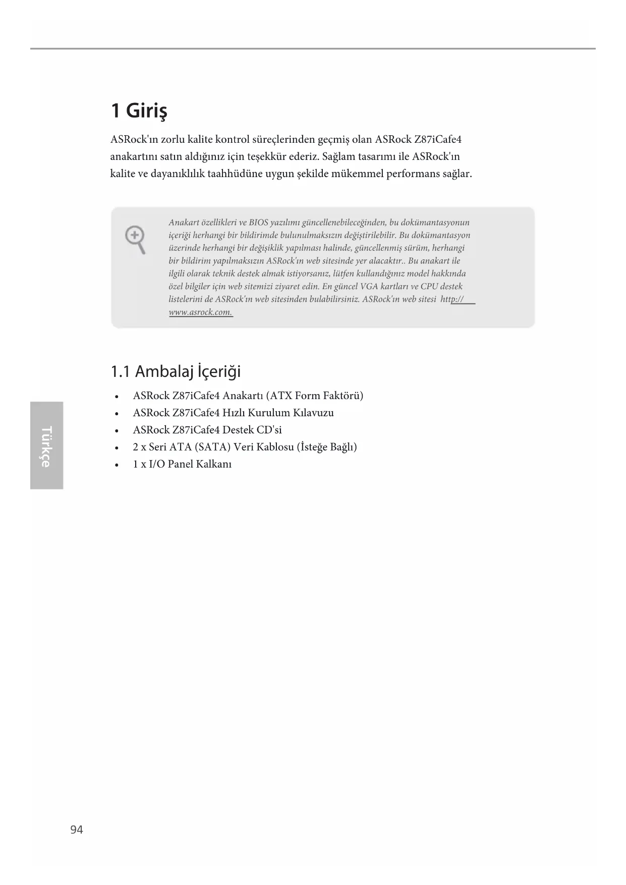 - 1 x I/O Panel Kalkanı Anakart özellikleri ve BIOS yazılımı güncellenebileceğinden, bu dokümantasyonun içeriği herhangi bir bildirimde bulunulmaksızın değiştirilebilir. Bu dokümantasyon üzerinde herhangi bir değişiklik yapılması halinde, güncellenmiş sürüm, herhangi bir bildirim yapılmaksızın ASRock'ın web sitesinde yer alacaktır.. Bu anakart ile ilgili olarak teknik destek almak istiyorsanız, lütfen kullandığınız model hakkında özel bilgiler için web sitemizi ziyaret edin. En güncel VGA kartları ve CPU destek listelerini de ASRock'ın web sitesinden bulabilirsiniz. ASRock'ın web sitesi http://www.asrock.com.Z87iCafe4