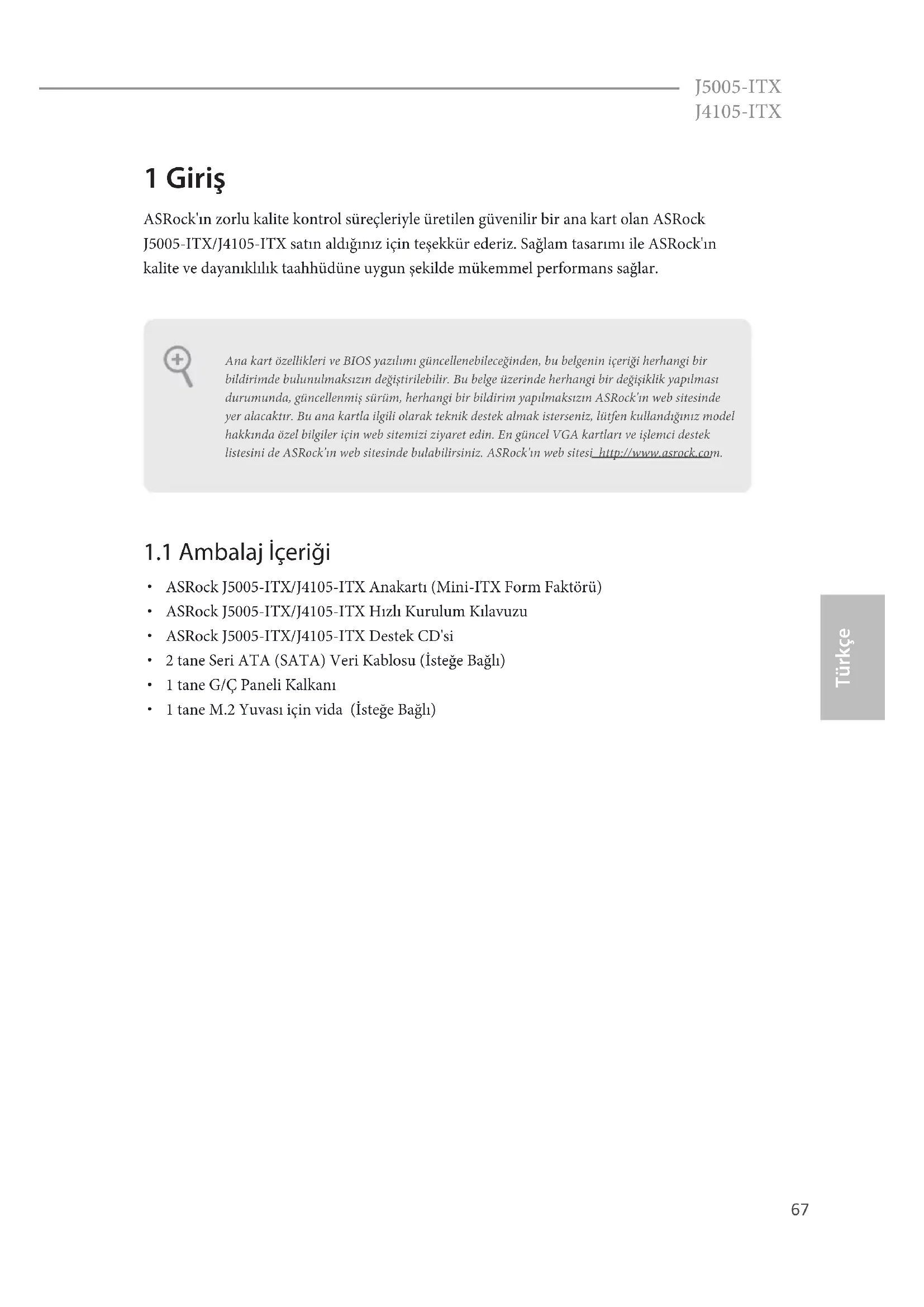 AN_VOLTAGE67 J5005-ITX J4105-ITX Türkçe Türkçe 1 Giriş ASRock'ın zorlu kalite kontrol süreçleriyle üretilen güvenilir bir ana kart olan ASRock J5005-ITX/J4105-ITX satın aldığınız için teşekkür ederiz. Sağlam tasarımı ile ASRock'ın kalite ve dayanıklılık taahhüdüne uygun şekilde mükemmel performans sağlar.