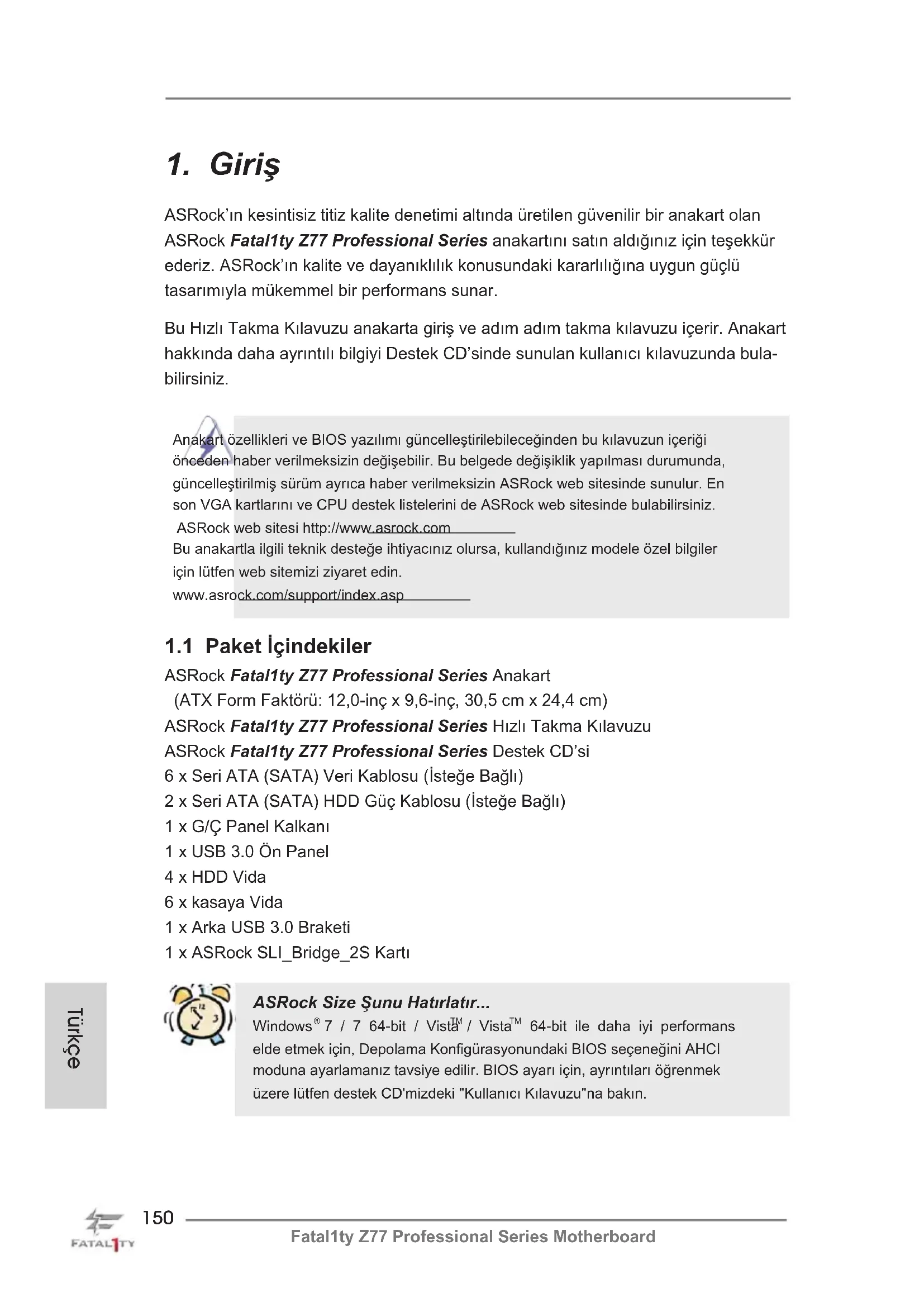 ASRock’ın kesintisiz titiz kalite denetimi altında üretilen güvenilir bir anakart olan ASRock Fatal1ty Z77 Professional Series anakartını satın aldığınız için teşekkür ederiz. ASRock’ın kalite ve dayanıklılık konusundaki kararlılığına uygun güçlü tasarımıyla mükemmel bir performans sunar. Bu Hızlı Takma Kılavuzu anakarta giriş ve adım adım takma kılavuzu içerir. Anakart hakkında daha ayrıntılı bilgiyi Destek CD’sinde sunulan kullanıcı kılavuzunda bula- bilirsiniz. Anakart özellikleri ve BIOS yazılımı güncelleştirilebileceğinden bu kılavuzun içeriği önceden haber verilmeksizin değişebilir. Bu belgede değişiklik yapılması durumunda, güncelleştirilmiş sürüm ayrıca haber verilmeksizin ASRock web sitesinde sunulur. En son VGA kartlarını ve CPU destek listelerini de ASRock web sitesinde bulabilirsiniz. ASRock web sitesi http://www.asrock.com Bu anakartla ilgili teknik desteğe ihtiyacınız olursa, kullandığınız modele özel bilgiler için lütfen web sitemizi ziyaret edin. www.asrock.com/support/index.asp