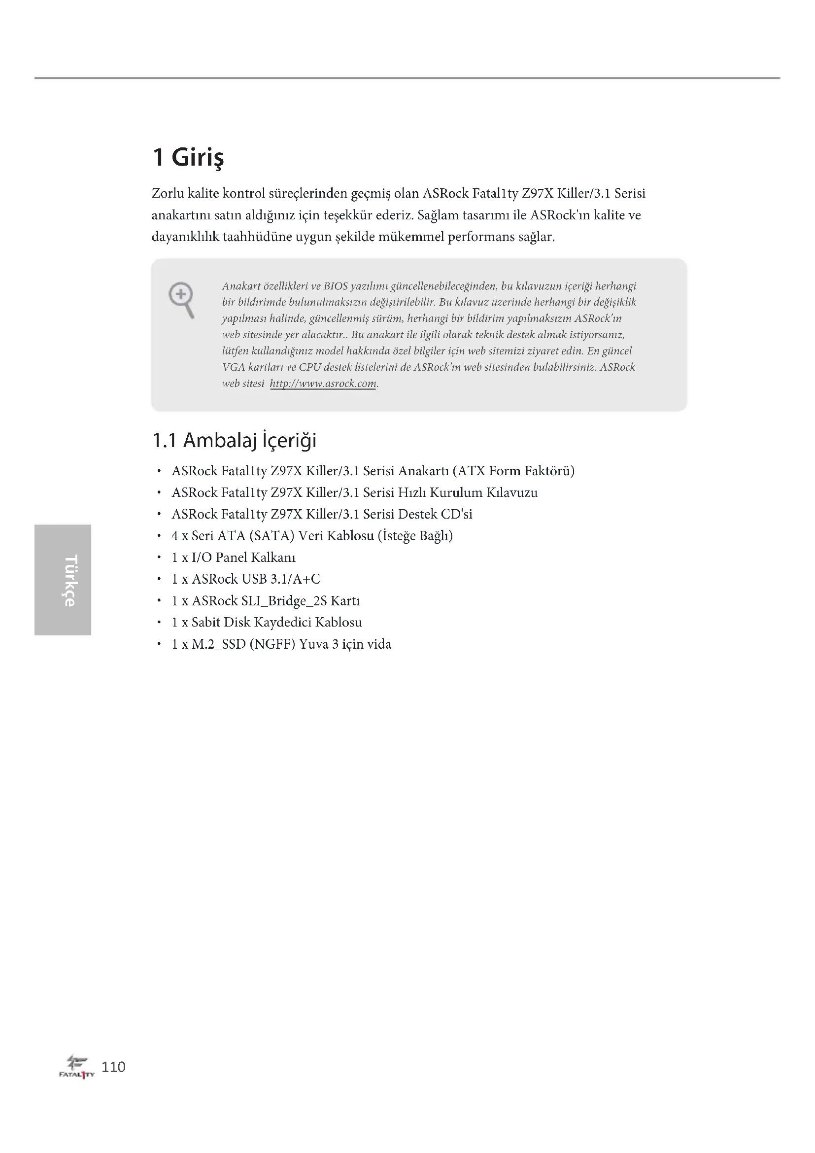Fatal1ty Z97X Killer/3.1 Series 1 Giriş Zorlu kalite kontrol süreçlerinden geçmiş olan ASRock Fatal1ty Z97X Killer/3.1 Serisi anakartını satın aldığınız için teşekkür ederiz. Sağlam tasarımı ile ASRock'ın kalite ve dayanıklılık taahhüdüne uygun şekilde mükemmel performans sağlar.
