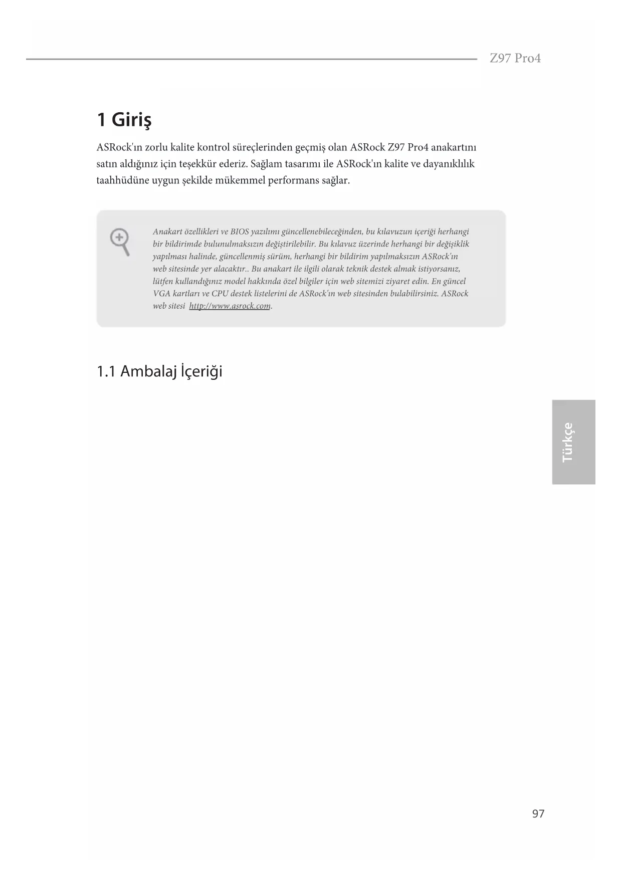 1 Giriş ASRock'ın zorlu kalite kontrol süreçlerinden geçmiş olan ASRock Z97 Pro4 anakartını satın aldığınız için teşekkür ederiz. Sağlam tasarımı ile ASRock'ın kalite ve dayanıklılık taahhüdüne uygun şekilde mükemmel performans sağlar.