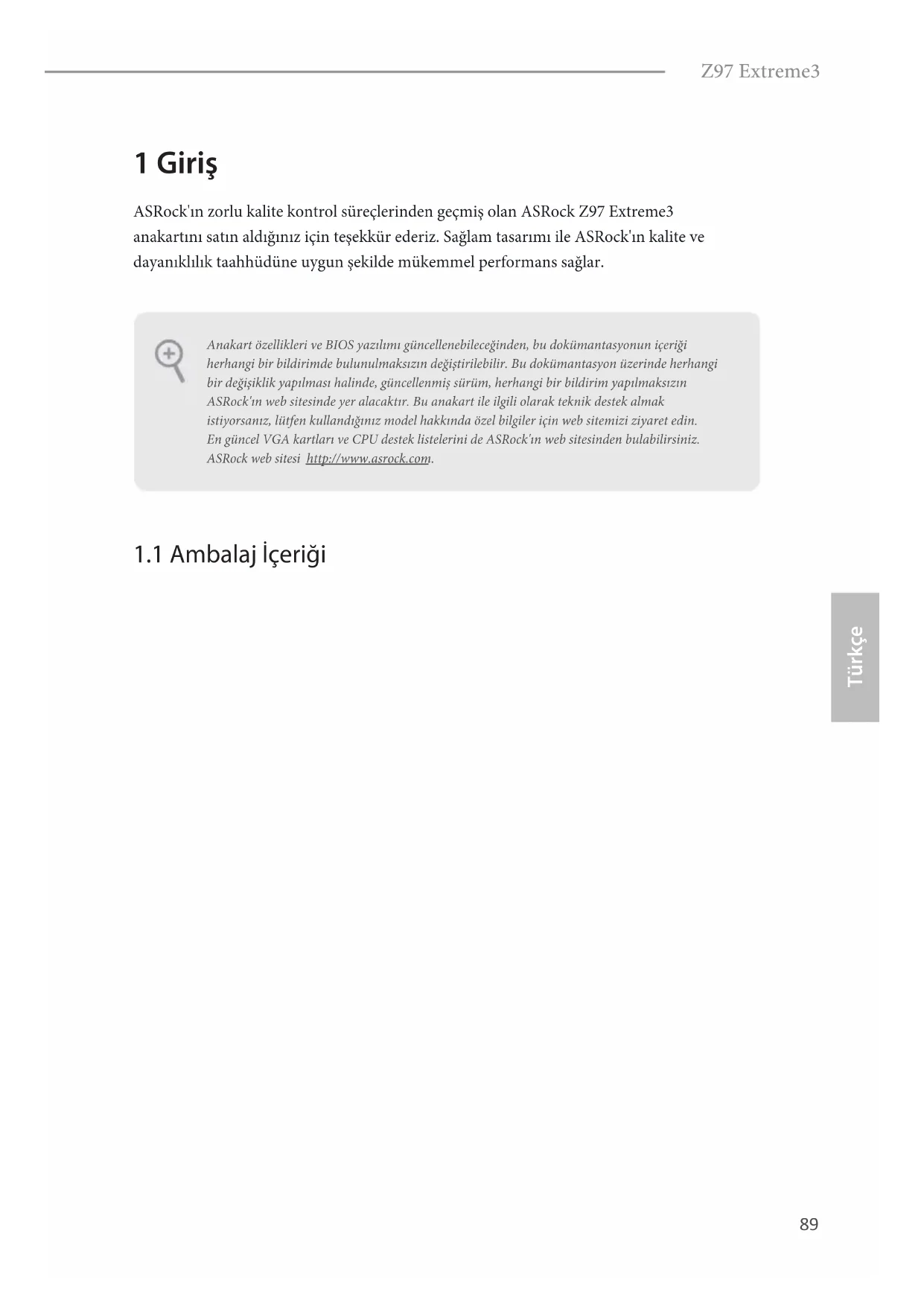 RRI#1 Este suporte COM1 recebe um módulo da porta serial.89 Türkçe Z97 Extreme3 1 Giriş ASRock'ın zorlu kalite kontrol süreçlerinden geçmiş olan ASRock Z97 Extreme3 anakartını satın aldığınız için teşekkür ederiz. Sağlam tasarımı ile ASRock'ın kalite ve dayanıklılık taahhüdüne uygun şekilde mükemmel performans sağlar.