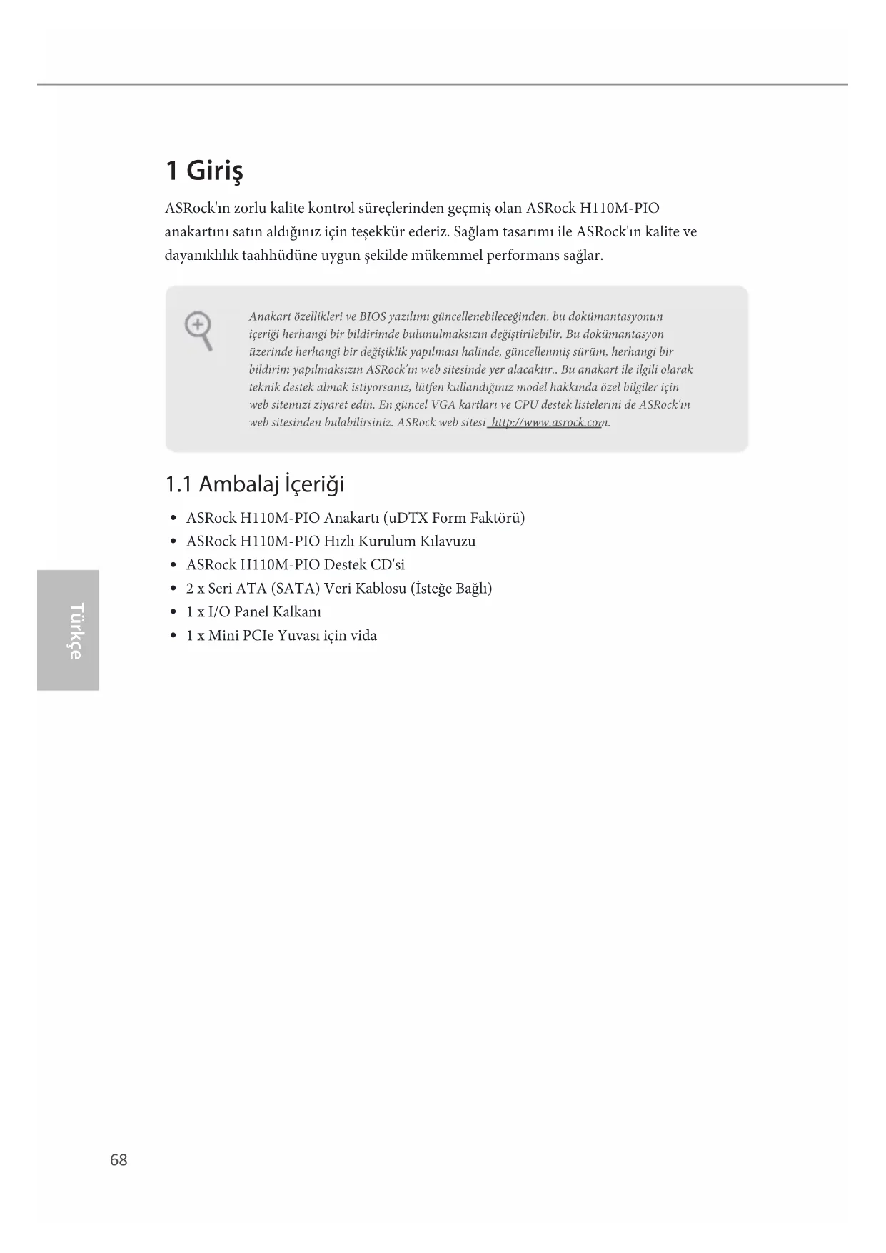 Türkçe 1 Giriş ASRock'ın zorlu kalite kontrol süreçlerinden geçmiş olan ASRock H110M-PIO anakartını satın aldığınız için teşekkür ederiz. Sağlam tasarımı ile ASRock'ın kalite ve dayanıklılık taahhüdüne uygun şekilde mükemmel performans sağlar.