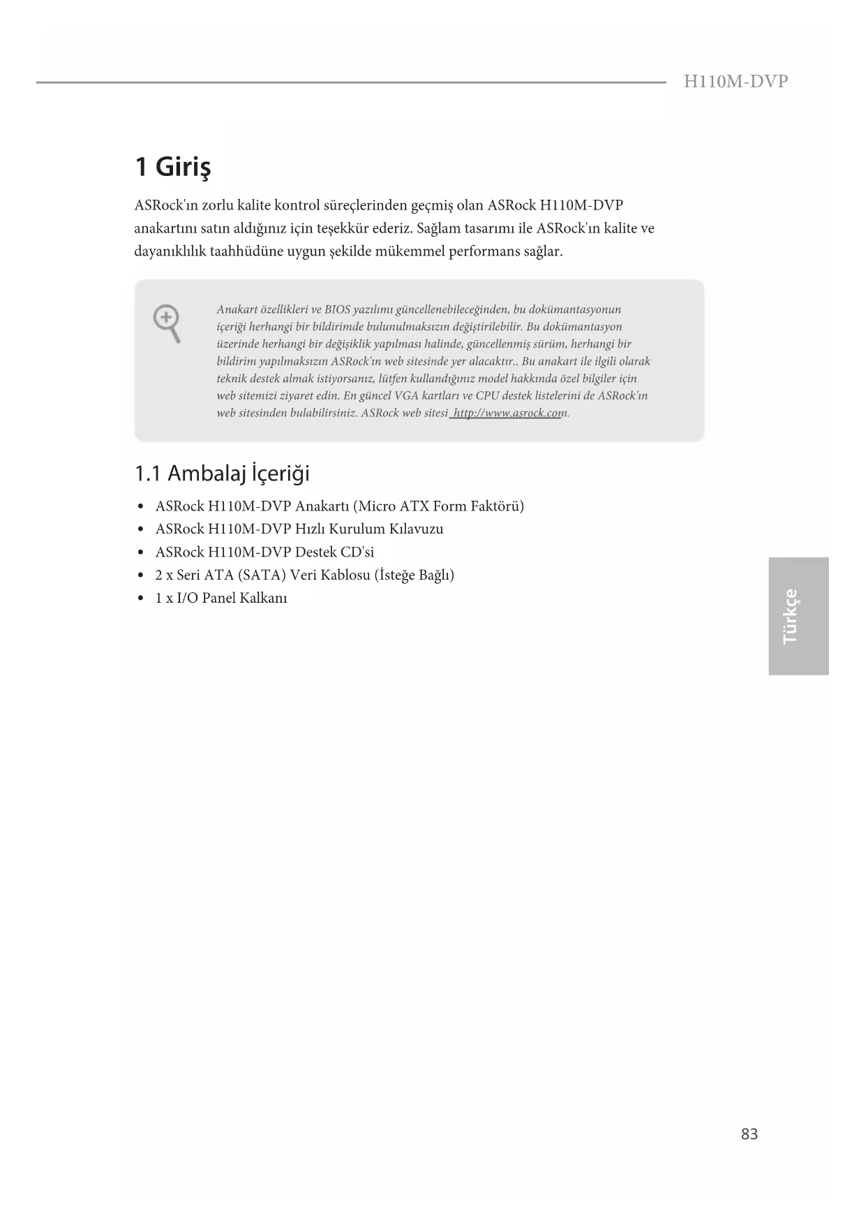 Türkçe H110M-DVP 1 Giriş ASRock'ın zorlu kalite kontrol süreçlerinden geçmiş olan ASRock H110M-DVP anakartını satın aldığınız için teşekkür ederiz. Sağlam tasarımı ile ASRock'ın kalite ve dayanıklılık taahhüdüne uygun şekilde mükemmel performans sağlar.