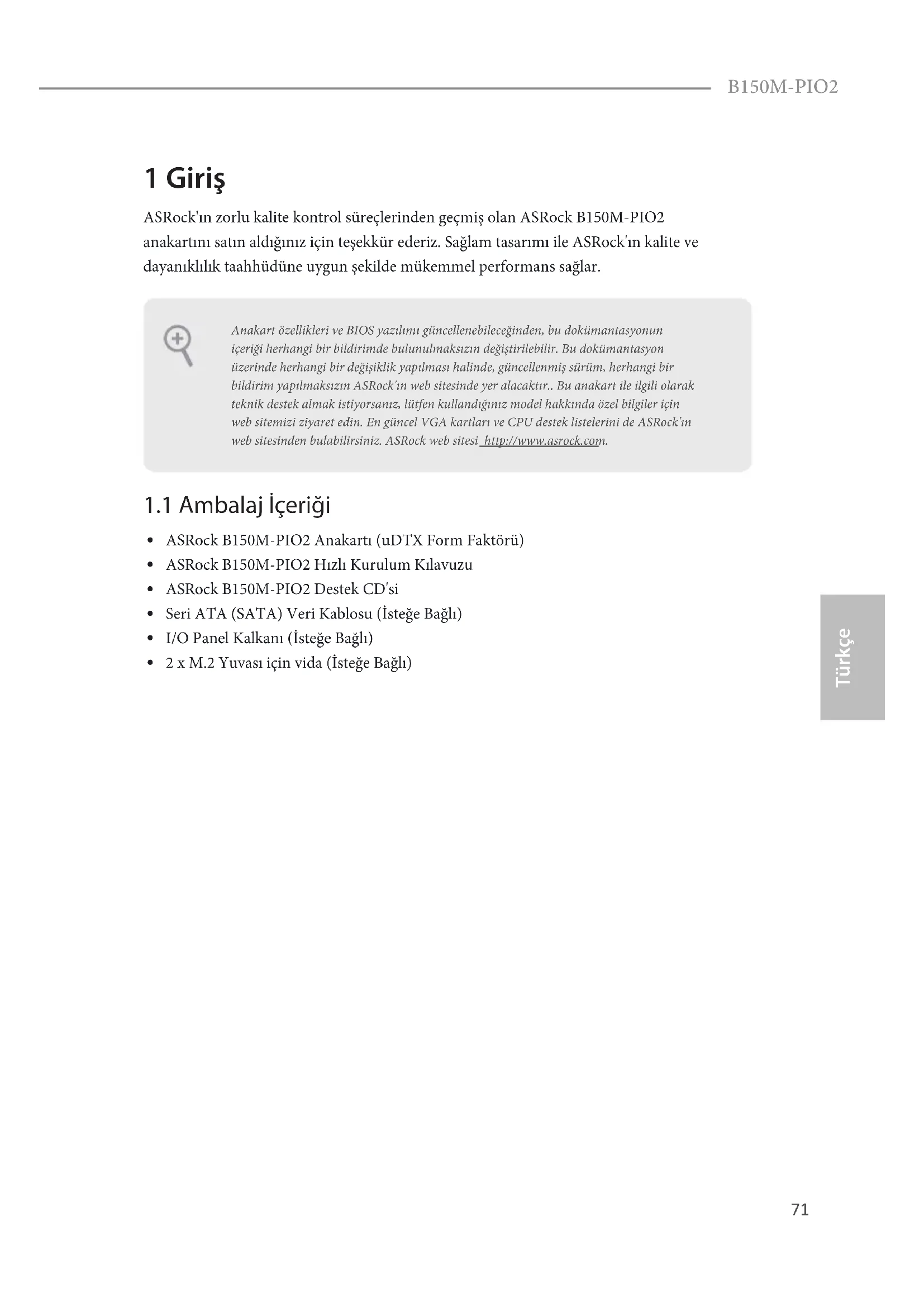 2 x M.2 Yuvası için vida (İsteğe Bağlı) Anakart özellikleri ve BIOS yazılımı güncellenebileceğinden, bu dokümantasyonun içeriği herhangi bir bildirimde bulunulmaksızın değiştirilebilir. Bu dokümantasyon üzerinde herhangi bir değişiklik yapılması halinde, güncellenmiş sürüm, herhangi bir bildirim yapılmaksızın ASRock'ın web sitesinde yer alacaktır.. Bu anakart ile ilgili olarak teknik destek almak istiyorsanız, lütfen kullandığınız model hakkında özel bilgiler için web sitemizi ziyaret edin. En güncel VGA kartları ve CPU destek listelerini de ASRock'ın web sitesinden bulabilirsiniz. ASRock web sitesi http://www.asrock.com.72 Türkçe