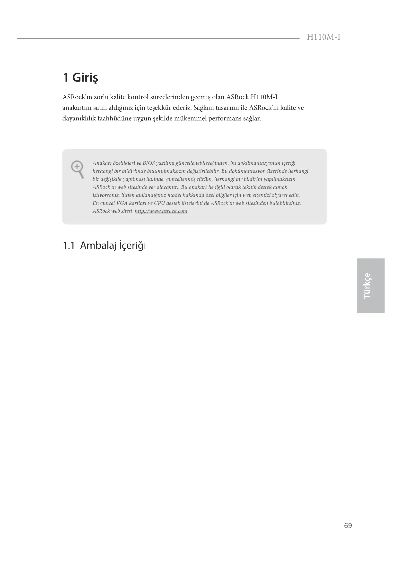 H110M-I Türkçe 1 Giriş ASRock'ın zorlu kalite kontrol süreçlerinden geçmiş olan ASRock H110M-I anakartını satın aldığınız için teşekkür ederiz. Sağlam tasarımı ile ASRock'ın kalite ve dayanıklılık taahhüdüne uygun şekilde mükemmel performans sağlar.