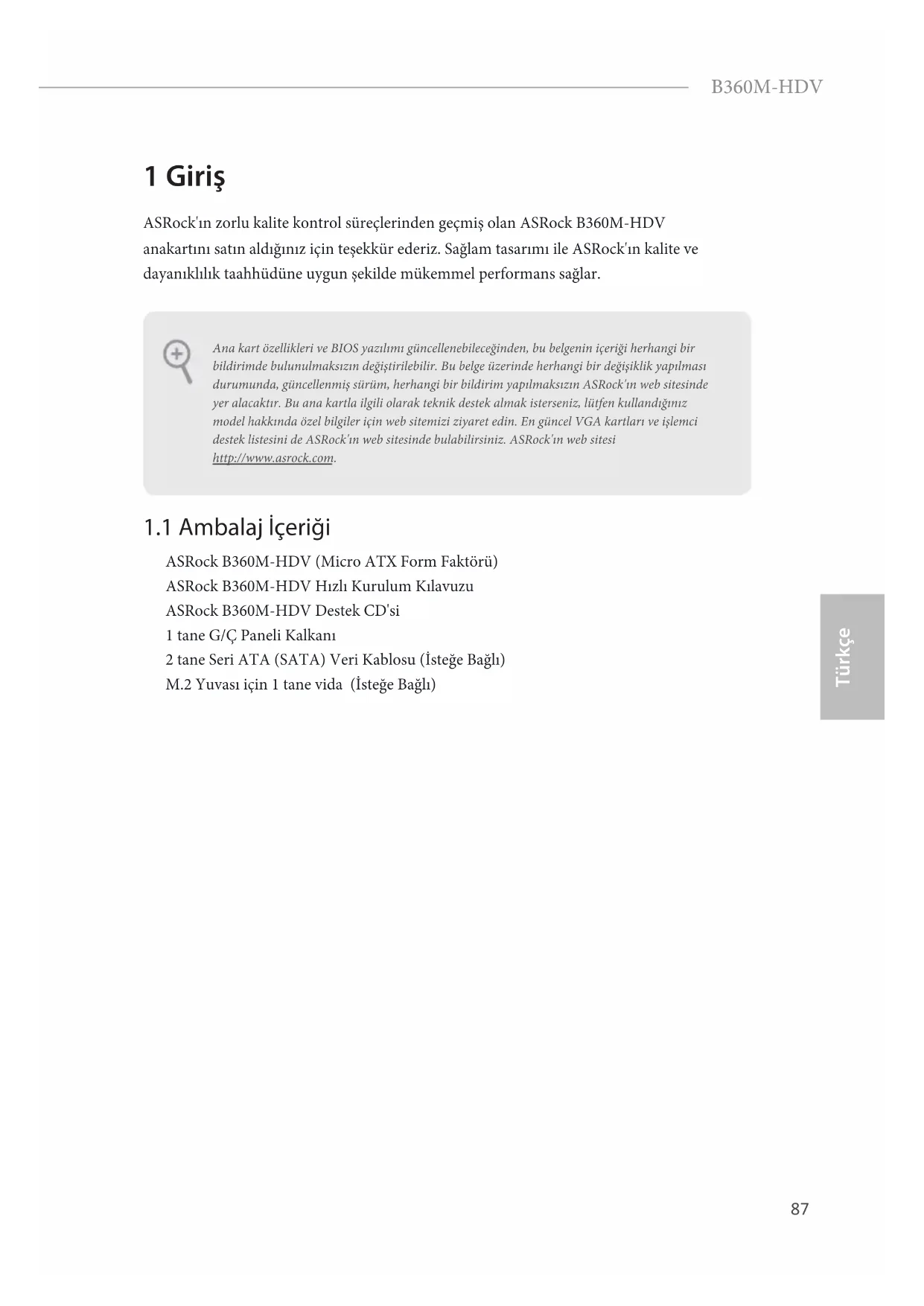 SLCT87 B360M-HDV Türkçe 1 Giriş ASRock'ın zorlu kalite kontrol süreçlerinden geçmiş olan ASRock B360M-HDV anakartını satın aldığınız için teşekkür ederiz. Sağlam tasarımı ile ASRock'ın kalite ve dayanıklılık taahhüdüne uygun şekilde mükemmel performans sağlar.