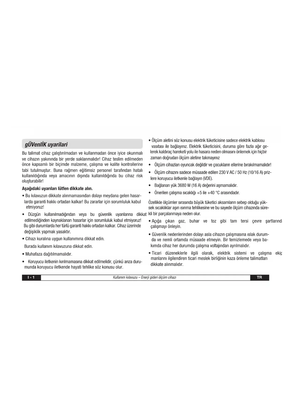- Ticari düzeneklerle ilgili olarak, elektrik sistemi ve çalışma ekip- manlarını ilgilendiren ticari meslek birliğinin kaza önleme talimatları dikkate alınmalıdır.TR Kullanım kılavuzu – Enerji gideri ölçüm cihazı I - 2
