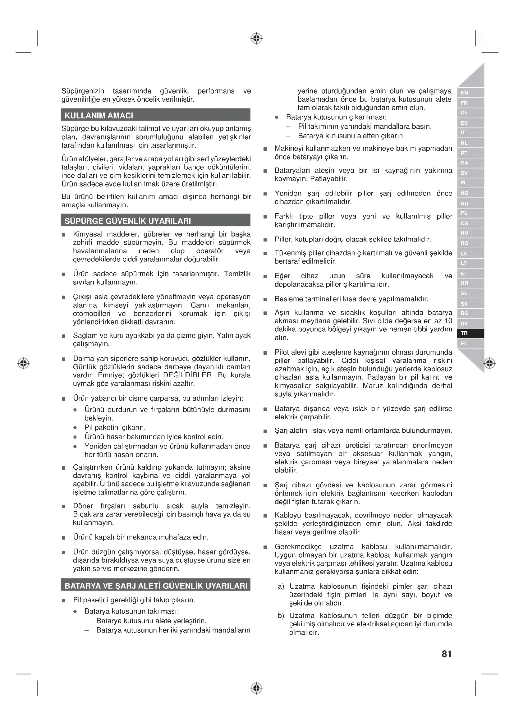 ɍȼȺȽȺ (Ȼɟɡ ɋɢɦɜɨɥɭ ɩɨɩɟɪɟɞɠɟɧɧɹ ɩɪɨ ɧɟɛɟɡɩɟɤɭ) ȼɤɚɡɭɽ ɧɚ ɫɢɬɭɚɰɿɸ, ɹɤɚ ɦɨɠɟ ɩɪɢɜɟɫɬɢ ɞɨ ɦɚɬɟɪɿɚɥɶɧɢɯ ɡɛɢɬɤɿɜ. 80 | ɭɤɪɚʀɧɫɶɤɚ ɦɨɜɚSüpürgenizin tasarÕmÕnda güvenlik, performans ve güvenilirli÷e en yüksek öncelik verilmiútir. KULLANIM AMACI Süpürge bu kÕlavuzdaki talimat ve uyarÕlarÕ okuyup anlamÕú olan, davranÕúlarÕnÕn sorumlulu÷unu alabilen yetiúkinler tarafÕndan kullanÕlmasÕ için tasarlanmÕútÕr. Ürün atölyeler, garajlar ve araba yollarÕ gibi sert yüzeylerdeki talaúlarÕ, çivileri, vidalarÕ, yapraklarÕ bahçe döküntülerini, ince dallarÕ ve çim kesiklerini temizlemek için kullanÕlabilir. Ürün sadece evde kullanÕlmak üzere üretilmiútir. Bu ürünü belirtilen kullanÕm amacÕ dÕúÕnda herhangi bir amaçla kullanmayÕn. SÜPÜRGE GÜVENLøK UYARILARI Ŷ Kimyasal maddeler, gübreler ve herhangi bir baúka zehirli madde süpürmeyin. Bu maddeleri süpürmek havalanmalarÕna neden olup operatör veya çevredekilerde ciddi yaralanmalar do÷urabilir. Ŷ Ürün sadece süpürmek için tasarlanmÕútÕr. Temizlik sÕvÕlarÕ kullanmayÕn. Ŷ ÇÕkÕúÕ asla çevredekilere yöneltmeyin veya operasyon alanÕna kimseyi yaklaútÕrmayÕn. CamlÕ mekanlarÕ, otomobilleri ve benzerlerini korumak için çÕkÕúÕ yönlendirirken dikkatli davranÕn. Ŷ Sa÷lam ve kuru ayakkabÕ ya da çizme giyin. YalÕn ayak çalÕúmayÕn. Ŷ Daima yan siperlere sahip koruyucu gözlükler kullanÕn. Günlük gözlüklerin sadece darbeye dayanÕklÕ camlarÕ vardÕr. Emniyet gözlükleri DEöøLDøRLER. Bu kurala uymak göz yaralanmasÕ riskini azaltÕr. Ŷ Ürün yabancÕ bir cisme çarparsa, bu adÕmlarÕ izleyin: Ɣ Ürünü durdurun ve fÕrçalarÕn bütünüyle durmasÕnÕ bekleyin. Ɣ Pil paketini çÕkarÕn. Ɣ Ürünü hasar bakÕmÕndan iyice kontrol edin. Ɣ Yeniden çalÕútÕrmadan ve ürünü kullanmadan önce her türlü hasarÕ onarÕn. Ŷ ÇalÕútÕrÕrken ürünü kaldÕrÕp yukarÕda tutmayÕn; aksine davranÕú kontrol kaybÕna ve ciddi yaralanmaya yol açabilir. Ürünü sadece bu iúletme kÕlavuzunda sa÷lanan iúletme talimatlarÕna göre çalÕútÕrÕn. Ŷ Döner fÕrçalarÕ sabunlu sÕcak suyla temizleyin. BÕçaklara zarar verebilece÷i için basÕnçlÕ hava ya da su kullanmayÕn. Ŷ Ürünü kapalÕ bir mekanda muhafaza edin. Ŷ Ürün düzgün çalÕúmÕyorsa, düútüyse, hasar gördüyse, dÕúarÕda bÕrakÕldÕysa veya suya düútüyse ürünü size en yakÕn servis merkezine gönderin. BATARYA VE ùARJ ALETø GÜVENLøK UYARILARI Ŷ Pil paketini gerekti÷i gibi takÕp çÕkarÕn. Ɣ Batarya kutusunun takÕlmasÕ: – Batarya kutusunu alete yerleútirin. – Batarya kutusunun her iki yanÕndaki mandallarÕn yerine oturdu÷undan emin olun ve çalÕúmaya baúlamadan önce bu batarya kutusunun alete tam olarak takÕlÕ oldu÷undan emin olun. Ɣ Batarya kutusunun çÕkarÕlmasÕ: – Pil takÕmÕnÕn yanÕndaki mandallara basÕn. – Batarya kutusunu aletten çÕkarÕn. Ŷ Makineyi kullanmazken ve makineye bakÕm yapmadan önce bataryayÕ çÕkarÕn. Ŷ BataryalarÕ ateúin veya bir ÕsÕ kayna÷ÕnÕn yakÕnÕna koymayÕn. Patlayabilir. Ŷ Yeniden úarj edilebilir piller úarj edilmeden önce cihazdan çÕkartÕlmalÕdÕr. Ŷ FarklÕ tipte piller veya yeni ve kullanÕlmÕú piller karÕútÕrÕlmamalÕdÕr. Ŷ Piller, kutuplarÕ do÷ru olacak úekilde takÕlmalÕdÕr. Ŷ Tükenmiú piller cihazdan çÕkartÕlmalÕ ve güvenli úekilde bertaraf edilmelidir. Ŷ E÷er cihaz uzun süre kullanÕlmayacak ve depolanacaksa piller çÕkartÕlmalÕdÕr. Ŷ Besleme terminalleri kÕsa devre yapÕlmamalÕdÕr. Ŷ AúÕrÕ kullanma ve sÕcaklÕk koúullarÕ altÕnda batarya akmasÕ meydana gelebilir. SÕvÕ cilde de÷erse en az 10 dakika boyunca bölgeyi yÕkayÕn ve hemen tÕbbi yardÕm alÕn. Ŷ Pilot alevi gibi ateúleme kayna÷ÕnÕn olmasÕ durumunda piller patlayabilir. Ciddi kiúisel yaralanma riskini azaltmak için, açÕk ateúin bulundu÷u yerlerde kablosuz cihazlarÕ asla kullanmayÕn. Patlayan bir pil kalÕntÕ ve kimyasallar salgÕlayabilir. Maruz kalÕndÕ÷Õnda derhal suyla yÕkanmalÕdÕr. Ŷ Batarya dÕúarÕda veya Õslak bir yüzeyde úarj edilirse elektrik çarpabilir. Ŷ ùarj aletini Õslak veya nemli ortamlarda bulundurmayÕn. Ŷ Batarya úarj cihazÕ üreticisi tarafÕndan önerilmeyen veya satÕlmayan bir aksesuar kullanmak yangÕn, elektrik çarpmasÕ veya bireysel yaralanmalara neden olabilir. Ŷ ùarj cihazÕ gövdesi ve kablosunun zarar görmesini önlemek için elektrik ba÷lantÕsÕnÕ keserken kablodan de÷il fiúten tutarak çÕkarÕn. Ŷ Kabloyu basÕlmayacak, devrilmeye neden olmayacak úekilde yerleútirdi÷inizden emin olun. Aksi takdirde hasar veya gerilme olabilir. Ŷ Gerekmedikçe uzatma kablosu kullanÕlmamalÕdÕr. Uygun olmayan bir uzatma kablosu kullanmak yangÕn veya elektrik çarpmasÕ tehlikesi yaratÕr. Uzatma kablosu kullanmanÕz gerekiyorsa úunlara dikkat edin: a) Uzatma kablosunun fiúindeki pimler úarj cihazÕ üzerindeki fiúin pimleri ile aynÕ sayÕ, boyut ve úekilde olmalÕdÕr. b) Uzatma kablosunun telleri düzgün bir biçimde çekilmiú olmalÕdÕr ve elektriksel açÕdan iyi durumda olmalÕdÕr. 81 Türkçe |