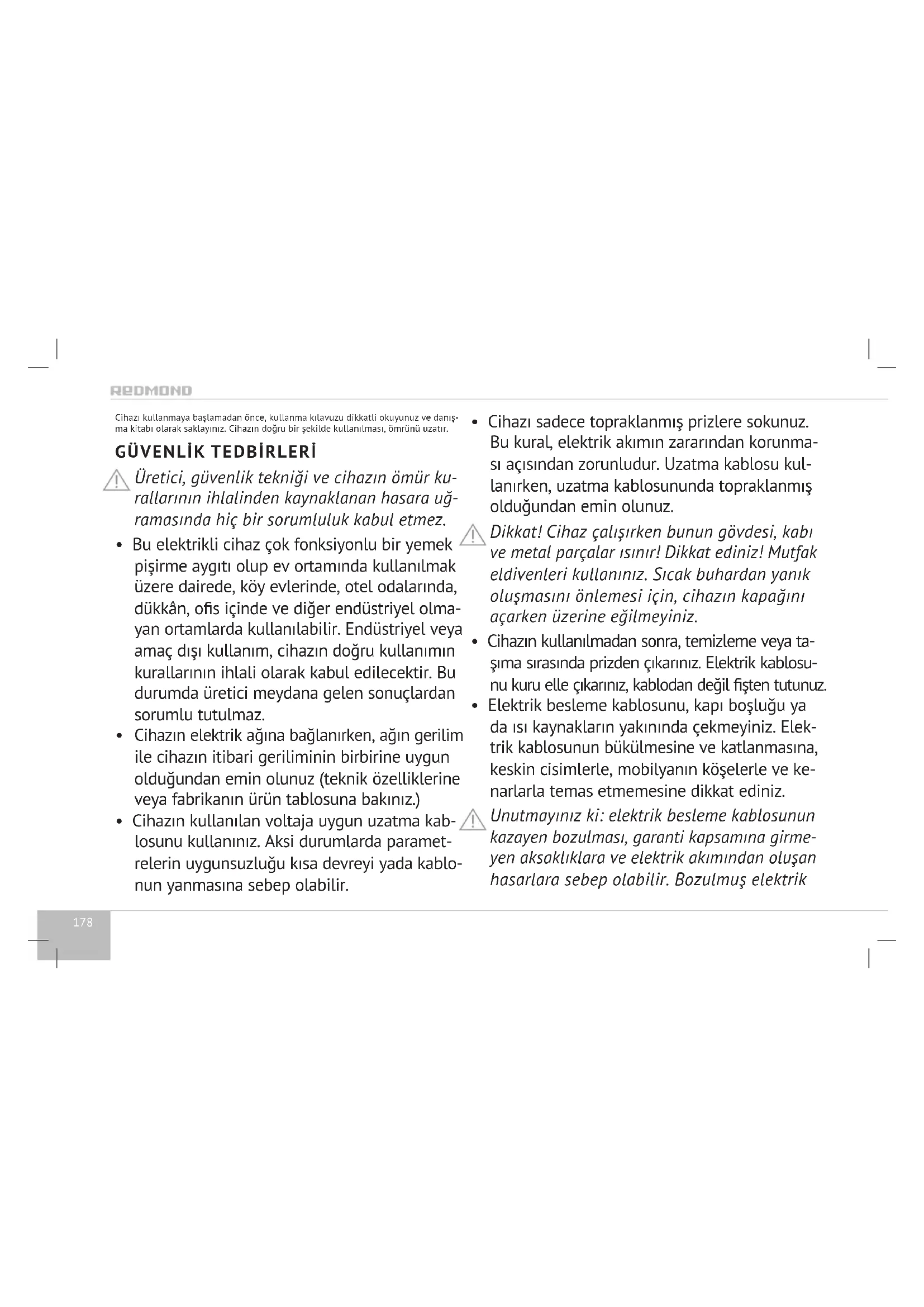 Fonksiyonlar Hazır yemeklerin sıcaklığının sürdürülmesi (otomatik ısıtma) .................................................................mevcut, 24 saate kadar Ön ısıtmanın kapatılması ............................................................................... mevcut Yemeklerin ısıtılması .........................................................mevcut, 24 saate kadar Ertelenen start ...................................................................mevcut, 24 saate kadar Paket içeriği Multi pişirici .........................................................................................................1 adet Kap RB-С512 ........................................................................................................ 1 adet Buharda pişirme konteyner ............................................................................ 1 adet Derin kızartma tenceresinde pişirmesi için kollu kap ............................. 1 adet Muttarit bardağı .................................................................................................. 1 adet Kepçe ...................................................................................................................... 1 adet Düz kaşığı .............................................................................................................1 adet “100 reçete” kitabı .............................................................................................1 adet Kepçe/kaşık tutucu ............................................................................................ 1 adet Kullanma kılavuzu ............................................................................................ 1 adet Servis kitabı .......................................................................................................... 1 adet Elektrik besleme kablosu ................................................................................. 1 adet Üretici; dizayn, paket içeriği ve ürün teknik özelliklerine ilave bildirme yapmadan üretimin iyileştirilmesi sırasında değişiklikler yapma hakkına sahiptir. tarafından yapılmalıdır. Pro- fesyonel olmayan işler ciha- zın bozulmasına, travm oluş- masına ve ürünün zarar görmesine yol açabilir.180 neme ve sıcağa dayanıklı olmayan eşyaların üzerine sıçramaması için dikkat ediniz. Pişirmeden önce, multi pişiricinin dış ve görünür iç parçaların hasar- lı ve kusurlu olmadığından emin olunuz. Kap ile ısıtıcı unsurların arasında hiç bir yabancı cisim bulunmamalıdır. Pişirme zamanın ayarlanması REDMOND RMC-M90E multi pişiricide her program için (“QUICK COOK” programı hariç olmak üzere) ayrı pişirme zamanını ayarlayabilirsiniz. Ayar- lanan zamanın değiştirilmesi ve olabilecek diyapazon, seçilen pişirme zama- nına bağlıdır. Zamanı değiştirmek için: