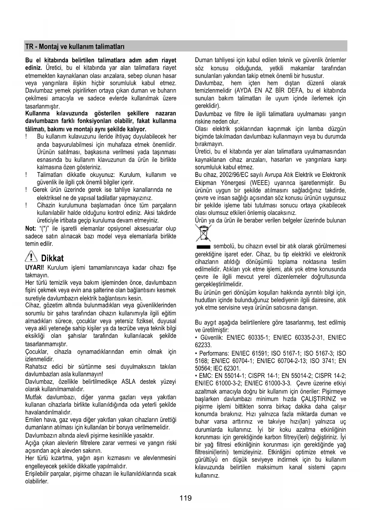 - EMC: EN 55014-1; CISPR 14-1; EN 55014-2; CISPR 14-2; EN/IEC 61000-3-2; EN/IEC 61000-3-3. Çevre üzerine etkiyi azaltmak amacıyla doğru bir kullanım için öneriler: Pişirmeye baş larken davlumbazı minimum hızda ÇALIŞTIRINIZ ve pişirme işlemi bittikten sonra birkaç dakika daha çalışır konumda bırakınız. Hızı yalnızca fazla miktarda duman ve buhar varsa arttırınız ve takviye hızı(ları) yalnızca uç durumlarda kullanınız. İyi bir koku azaltma etkinliğinin korunması için gerektiğinde karbon filtreyi(leri) değiştiriniz. İyi bir yağ filtresi etkinliğinin korunması için gerektiğinde yağ filtresini(lerini) temizleyiniz. Etkinliğini optimize etmek ve gürültüyü en düşük seviyeye indirmek için bu kullanım kılavuzunda belirtilen maksimum kanal sistemi çapını kullanınız.120 DIKKAT! Bu talimatlara uygun olarak, montaj için vida ve diğer parçaların yerleştirilmemesi elektrik sisteminde tehlikeye yol açabilir. Kullanım Davlumbaz, havayı dışarı atıcı veya filtre edici model olarak tasarlanmıştır. Aspiratörlü model Yemek buharları, bağlantı falanjına sabitlenmiş bir tahliye borusu sayesinde dışarıya atılırlar. Tahliye borusunun çapı bağlantı halkasının çapına eşit olmalıdır. Dikkat! Tahliye borusu ürün ile birlikte tedarik edilmez. Ayrıca satın alınmalıdır. Yatay satıhda boru, havayı dışarıya kolayca taşıyabilmesi için yukarı doğru hafif bir açıya sahip olmalıdır ( yaklaşık 10°). Eğer davlumbazın karbon filtreleri var ise bunlar çıkartılmalıdır. Davlumbazı duvardaki çık ış borularına ve ağızlarına bağlayınız. Diametresi hava çıkışıyla aynı olmalıdır (bağlantı halkası). Boruların ve duvardaki az çaplı çıkış borularının emme gücünün iyi çalışmasını azaltır ve gürültüyü büyük ölçüde arttırır. Dolayısıyla bu konuyla ilgili hiçbir mesuliyet kabul edilmez. ! Mümkün olan en kısa boyda tahliye borusu kullanın ! En az sayıda dirseğe sahip boru kullanın (Maksimum dirsek açısı: 90°). ! Borunun kesitinin ( genişliğinin ) ani olarak değişmesinden kaç ının. ! İç yüzeyi mümkün olan en pürüzsüz boruyu tercih edin. ! Borunun yapıldığı malzeme yasaların onayladığı türden olmalıdır. Filtreli model Aspire edilen hava, odaya tekrar aktarılmadan önce içerdiği kokusundan ve yağdan arıtılacaktır. Bu versiyonda davlumbaz kullanmak için aktif karbon bazlı bir filtre sisteminin takılması gerekir. Kurulum Ocağın üzerindeki pişirme kapları için destek yüzeyleri ile ocak davlumbazının en alçak kısmı arasındaki minimum mesafe, elektrikli ısıtıcılardan 50 cm, gaz veya gazla-elektrikle çalışan ocaklardan 65 cm’den az olmamalıdır. Gazlı ocakların kurulumuyla ilgili olarak talimatlarda daha fazla mesafe belirtiliyorsa, buna bağlı kalınmalıdır. Elektrik bağlantısı Ana güç kaynağı davlumbazın içinde yer alan plakada belirtilen değere uygun olmalıdır. Davlumbazı varsa bir fiş ile mevcut düzenlemelere uygun bir prize takıp erişilebilir bir alana yerleştiriniz. Kurulumdan sonra da eğer cihazın fişi yok ise (doğrudan şebeke bağlantısı) veya priz erişilebilir bir yerde değilse, aşırı akım kategorisi III ile ilgili koşullar altında ana kablonun bağlantısının tamamen kesilmesini sağlayan, standartlara uygun çift kutuplu bir anahtar kullanın. Uyarı: Davlumbazı ana güç kaynağına yeniden bağlamadan ve etkin şekilde çalıştığını kontrol etmeden önce, ana güç kaynağı kablosunun düzgün takıl ıp takılmadığını denetleyin. Davlumbaz özel bir elektrik kablosuna sahiptir; Bu kablonun hasar görmesi durumunda yetkili teknik servise başvurun. Montaj Montaja başlamadan önce: