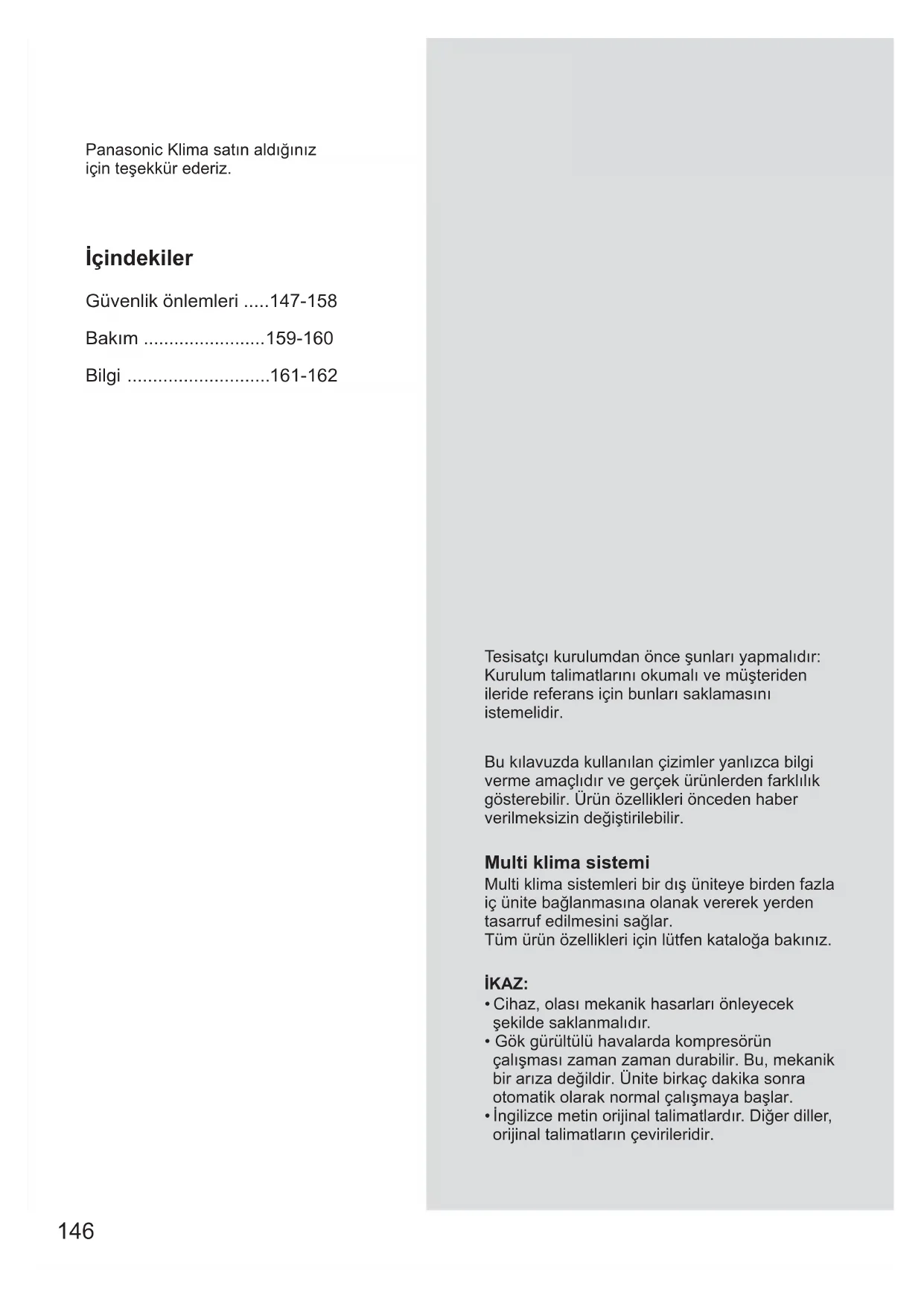 161-162 Panasonic Klima satın aldığınız için teşekkür ederiz. Tesisatçı kurulumdan önce şunları yapmalıdır: Kurulum talimatlarını okumalı ve müşteriden ileride referans için bunları saklamasını istemelidir. Bu kılavuzda kullanılan çizimler yanlızca bilgi verme amaçlıdır ve gerçek ürünlerden farklılık gösterebilir. Ürün özellikleri önceden haber verilmeksizin değiştirilebilir. Multi klima sistemi Multi klima sistemleri bir dış üniteye birden fazla iç ünite bağlanmasına olanak vererek yerden tasarruf edilmesini sağlar. Tüm ürün özellikleri için lütfen kataloğa bakınız. İKAZ: