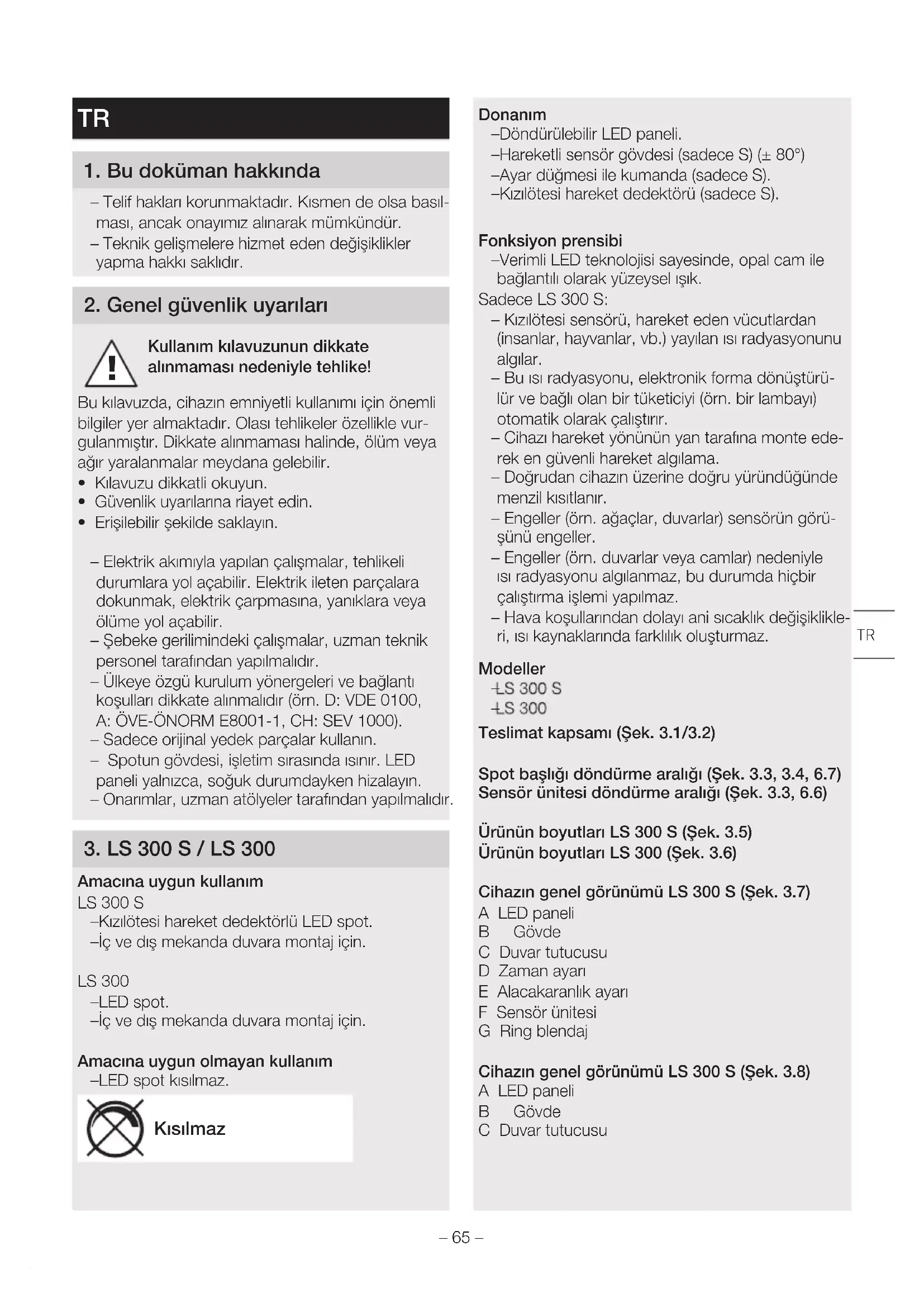 Teslimat kapsamı (Şek.3.1/3.2) Spot başlığı döndürme aralığı (Şek. 3.3, 3.4, 6.7) Sensör ünitesi döndürme aralığı (Şek. 3.3, 6.6) Ürünün boyutları LS300S (Şek. 3.5) Ürünün boyutları LS300 (Şek. 3.6) Cihazın genel görünümü LS300S (Şek. 3.7) A LED paneli B Gövde C Duvar tutucusu D Zaman ayarı E Alacakaranlık ayarı F Sensör ünitesi G Ring blendaj Cihazın genel görünümü LS300S (Şek. 3.8) A LED paneli B Gövde C Duvar tutucusu – 65 –Teknik özellikler – Boyutlar (YxGxD): LS 300 S: 241×213×186mm LS 300: 218×213×184mm – Çekilen güç (P