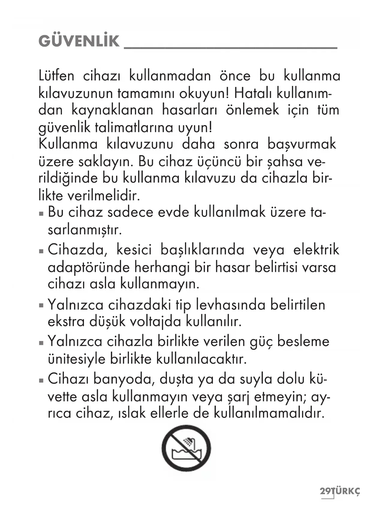 Lütfen cihazı kullanmadan önce bu kullanma kılavuzunun tamamını okuyun! Hatalı kullanım- dan kaynaklanan hasarları önlemek için tüm güvenlik talimatlarına uyun! Kullanma kılavuzunu daha sonra başvurmak üzere saklayın. Bu cihaz üçüncü bir şahsa ve- rildiğinde bu kullanma kılavuzu da cihazla bir- likte verilmelidir.