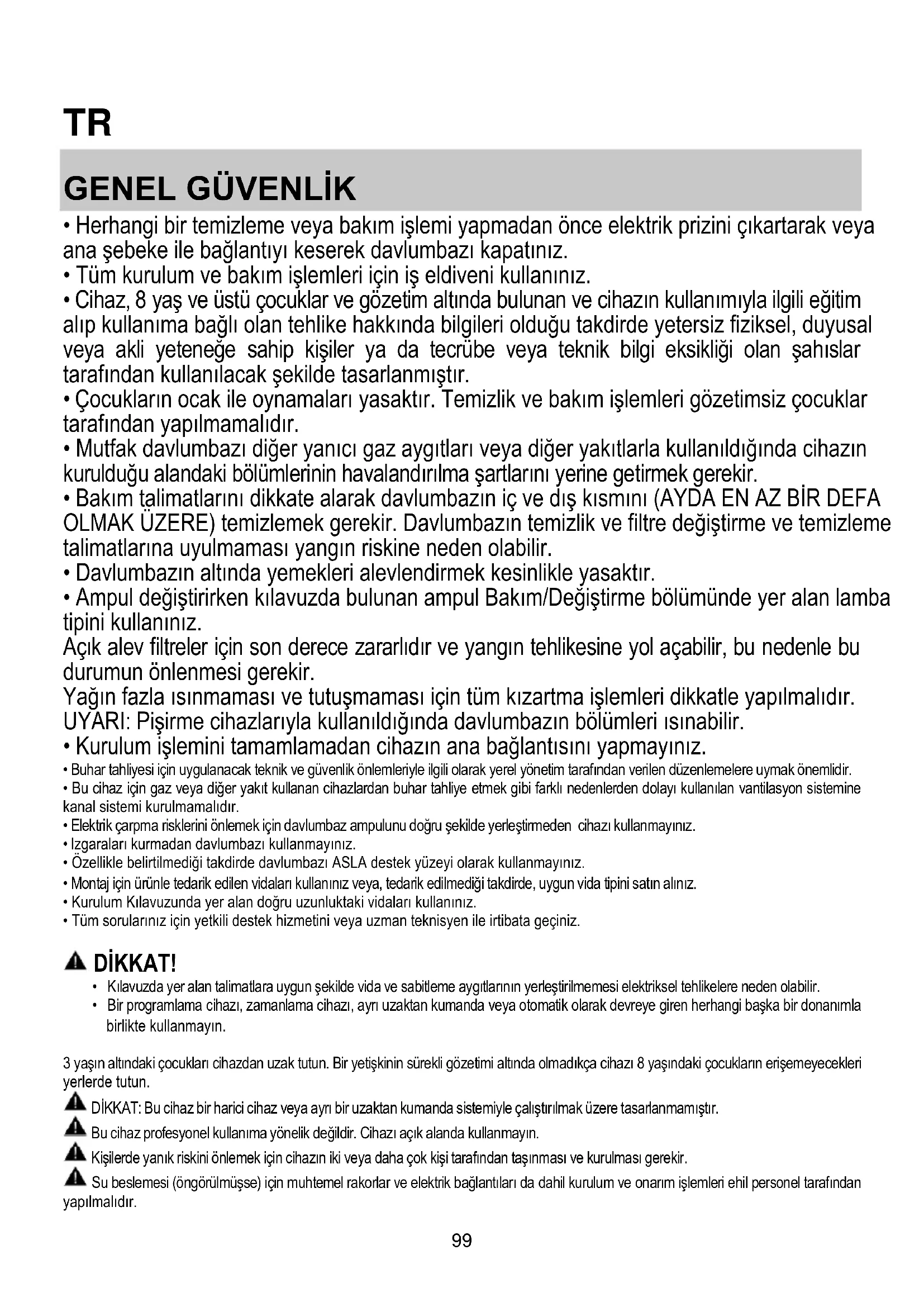- Bir programlama cihazı, zamanlama cihazı, ayrı uzaktan kumanda veya otomatik olarak devreye giren herhangi başka bir donanımla birlikte kullanmayın. 3 yaşın altındaki çocukları cihazdan uzak tutun. Bir yetişkinin sürekli gözetimi altında olmadıkça cihazı 8 yaşındaki çocukların erişemeyecekleri yerlerde tutun. DİKKAT: Bu cihaz bir harici cihaz veya ayrı bir uzaktan kumanda sistemiyle çalıştırılmak üzere tasarlanmamıştır. Bu cihaz profesyonel kullanıma yönelik değildir. Cihazı açık alanda kullanmayın. Kişilerde yanık riskini önlemek için cihazın iki veya daha çok kişi tarafından taşınması ve kurulması gerekir. Su beslemesi (öngörülmüşse) için muhtemel rakorlar ve elektrik bağlantıları da dahil kurulum ve onarım işlemleri ehil personel tarafından yapılmalıdır.100 Boğulma riskini önlemek için kurulum tamamlandıktan sonra ambalajlama malzemelerini (plastik, polistirol parçalar, vb.) çocukların erişemeyecekleri yerlerde saklayın. . Ayaklarınız ıslak veya çıplakken cihazı kullanmayın. Cihazı kesinlikle buharlı temizlik amacıyla kullanmayın: elektrik çarpması riski mevcuttur. Ambalaj malzemeleri %100 oranında geri dönüştürülebilir ve üzerlerinde geri dönüşüm simgesi bulunur Kullanma kılavuzunda gösterilen şekillere nazaran davlumbazın farklı fonksiyonları olabilir, fakat kullanma tâlimatı, bakımı ve montajı aynı şekilde kalıyor. Bu el kitabında belirtilen talimatlara adım adım riayet ediniz. Üretici, bu el kitabında yar alan talimatlara riayet etmemekten kaynaklanan olası arızalara, sebep olunan hasar veya yangınlara ilişkin hiçbir sorumluluk kabul etmez. Davlumbaz yemek pişirilirken ortaya çıkan duman ve buharın çekilmesi amacıyla ve sadece evlerde kullanılmak üzere tasarlanmıştır.