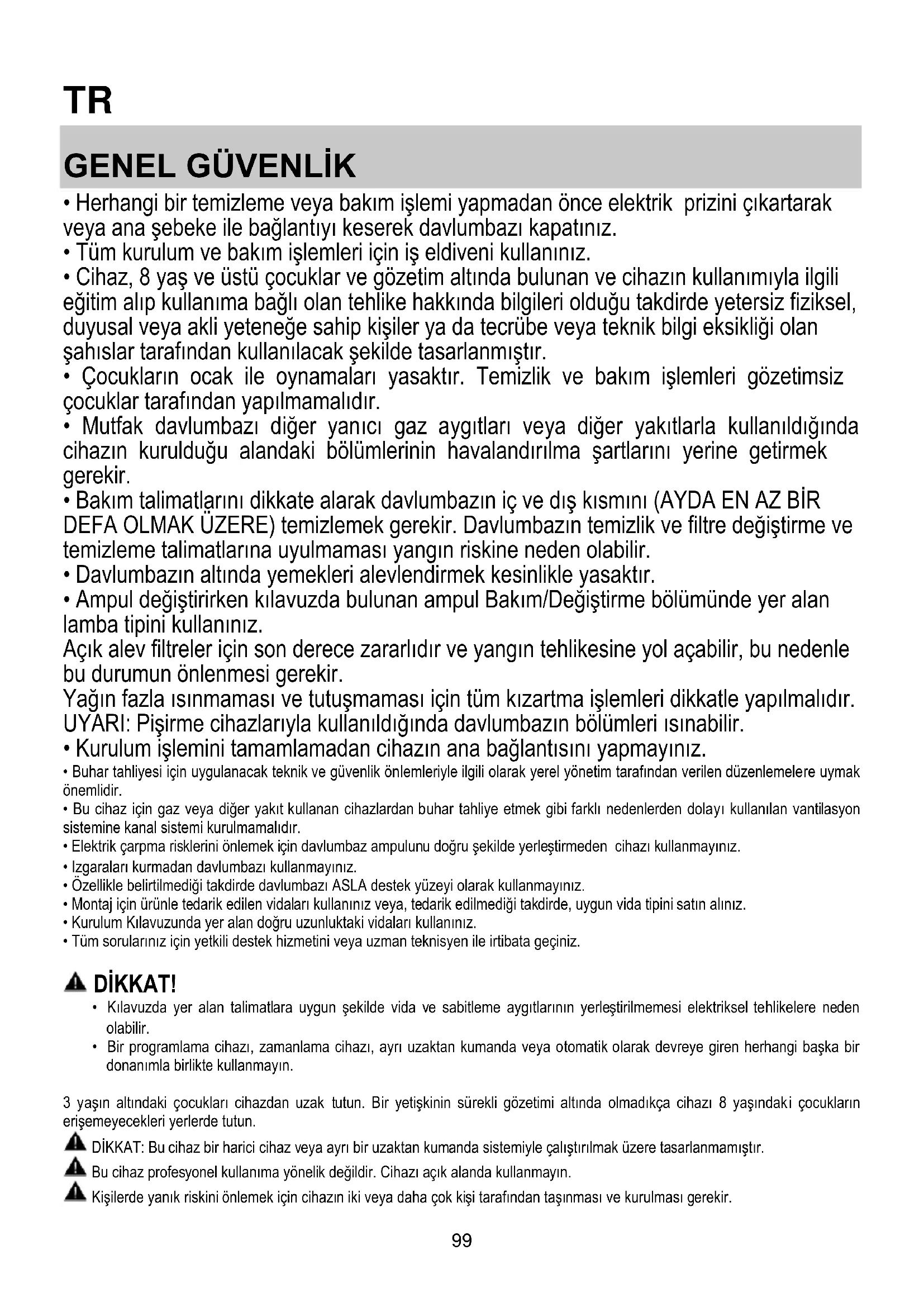 - Bir programlama cihazı, zamanlama cihazı, ayrı uzaktan kumanda veya otomatik olarak devreye giren herhangi başka bir donanımla birlikte kullanmayın. 3 yaşın altındaki çocukları cihazdan uzak tutun. Bir yetişkinin sürekli gözetimi altında olmadıkça cihazı 8 yaşındaki çocukların erişemeyecekleri yerlerde tutun. DİKKAT: Bu cihaz bir harici cihaz veya ayrı bir uzaktan kumanda sistemiyle çalıştırılmak üzere tasarlanmamıştır. Bu cihaz profesyonel kullanıma yönelik değildir. Cihazı açık alanda kullanmayın. Kişilerde yanık riskini önlemek için cihazın iki veya daha çok kişi tarafından taşınması ve kurulması gerekir.100 Su beslemesi (öngörülmüşse) için muhtemel rakorlar ve elektrik bağlantıları da dahil kurulum ve onarım işlemleri ehil personel tarafından yapılmalıdır. Boğulma riskini önlemek için kurulum tamamlandıktan sonra ambalajlama malzemelerini (plastik, polistirol parçalar, vb.) çocukların erişemeyecekleri yerlerde saklayın. . Ayaklarınız ıslak veya çıplakken cihazı kullanmayın. Cihazı kesinlikle buharlı temizlik amacıyla kullanmayın: elektrik çarpması riski mevcuttur. Ambalaj malzemeleri %100 oranında geri dönüştürülebilir ve üzerlerinde geri dönüşüm simgesi bulunur Kullanma kılavuzunda gösterilen şekillere nazaran davlumbazın farklı fonksiyonları olabilir, fakat kullanma tâlimatı, bakımı ve montajı aynı şekilde kalıyor. Bu el kitabında belirtilen talimatlara adım adım riayet ediniz. Üretici, bu el kitabında yar alan talimatlara riayet etmemekten kaynaklanan olası arızalara, sebep olunan hasar veya yangınlara ilişkin hiçbir sorumluluk kabul etmez. Davlumbaz yemek pişirilirken ortaya çıkan duman ve buharın çekilmesi amacıyla ve sadece evlerde kullanılmak üzere tasarlanmıştır.