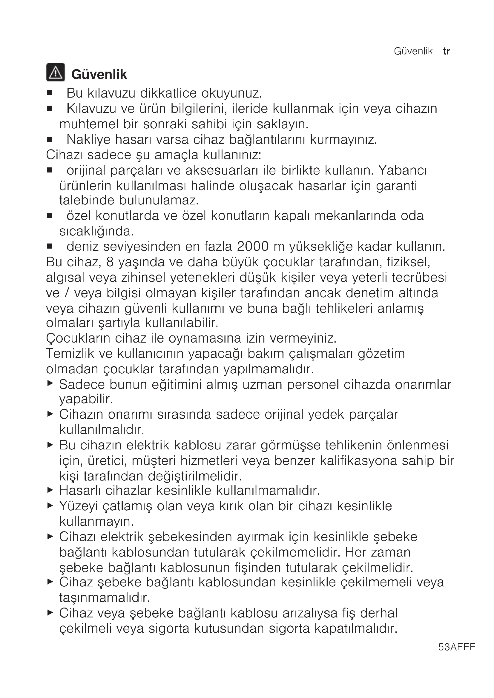 Όροι εγγύησης Όροι εγγύησης Όροι εγγύησης Έχετε για τη συσκευή σας δικαίωμα εγγύησης σύμφωνα με τους ακόλουθους όρους.el Όροι εγγύησης 52Güvenlik tr 53AEEE Yönetmeliǧine Uygundur. PCB içermez. Güvenlik ¡ Bu kılavuzu dikkatlice okuyunuz. ¡ Kılavuzu ve ürün bilgilerini, ileride kullanmak için veya cihazın muhtemel bir sonraki sahibi için saklayın. ¡ Nakliye hasarı varsa cihaz bağlantılarını kurmayınız. Cihazı sadece şu amaçla kullanınız: ¡ orijinal parçaları ve aksesuarları ile birlikte kullanın. Yabancı ürünlerin kullanılması halinde oluşacak hasarlar için garanti talebinde bulunulamaz. ¡ özel konutlarda ve özel konutların kapalı mekanlarında oda sıcaklığında. ¡ deniz seviyesinden en fazla 2000m yüksekliğe kadar kullanın. Bu cihaz, 8 yaşında ve daha büyük çocuklar tarafından, fiziksel, algısal veya zihinsel yetenekleri düşük kişiler veya yeterli tecrübesi ve / veya bilgisi olmayan kişiler tarafından ancak denetim altında veya cihazın güvenli kullanımı ve buna bağlı tehlikeleri anlamış olmaları şartıyla kullanılabilir. Çocukların cihaz ile oynamasına izin vermeyiniz. Temizlik ve kullanıcının yapacağı bakım çalışmaları gözetim olmadan çocuklar tarafından yapılmamalıdır.