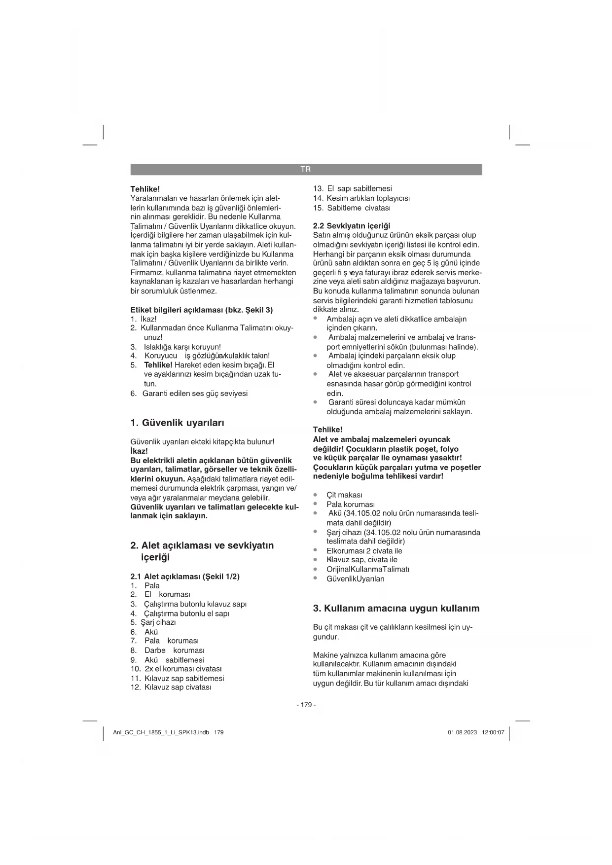 talimatlara göre kullanılmadığında veya bakımı düzgün şekilde yapılmadığında el-kol titreşiminden kaynaklanan sağlık hasarlarının oluşması. Çalışma sür enizi sınırlayın! İşletim periyotları ile ilgili tüm kademeler dikkate alınacaktır (örneğin elektrikli aletin kapalı kaldığı, açık olduğu fakat yük altında olmaksızın çalıştığı gibi). Anl_GC_CH_1855_1_Li_SPK13.indb 180Anl_GC_CH_1855_1_Li_SPK13.indb 180 01.08.2023 12:00:0701.08.2023 12:00:07TR