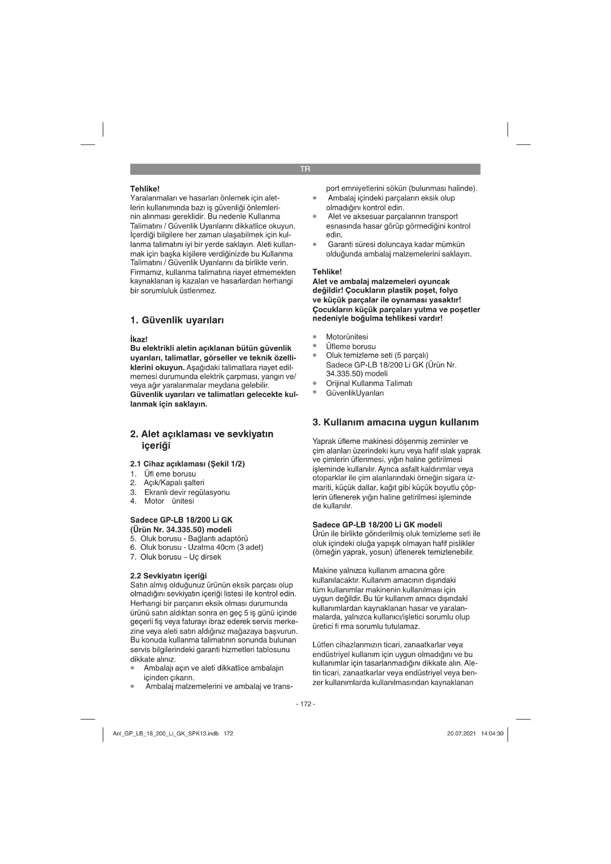 Dikkat! Yaprak üfl emenin teslimat kapsamına akü ve şarj cihazı dahil değildir! İkaz! Cihaz üzerinde ayarlama çalışmaları yapmadan önce daima aküyü sökün. Anl_GP_LB_18_200_Li_GK_SPK13.indb 173Anl_GP_LB_18_200_Li_GK_SPK13.indb 173 20.07.2021 14:04:3020.07.2021 14:04:30TR
