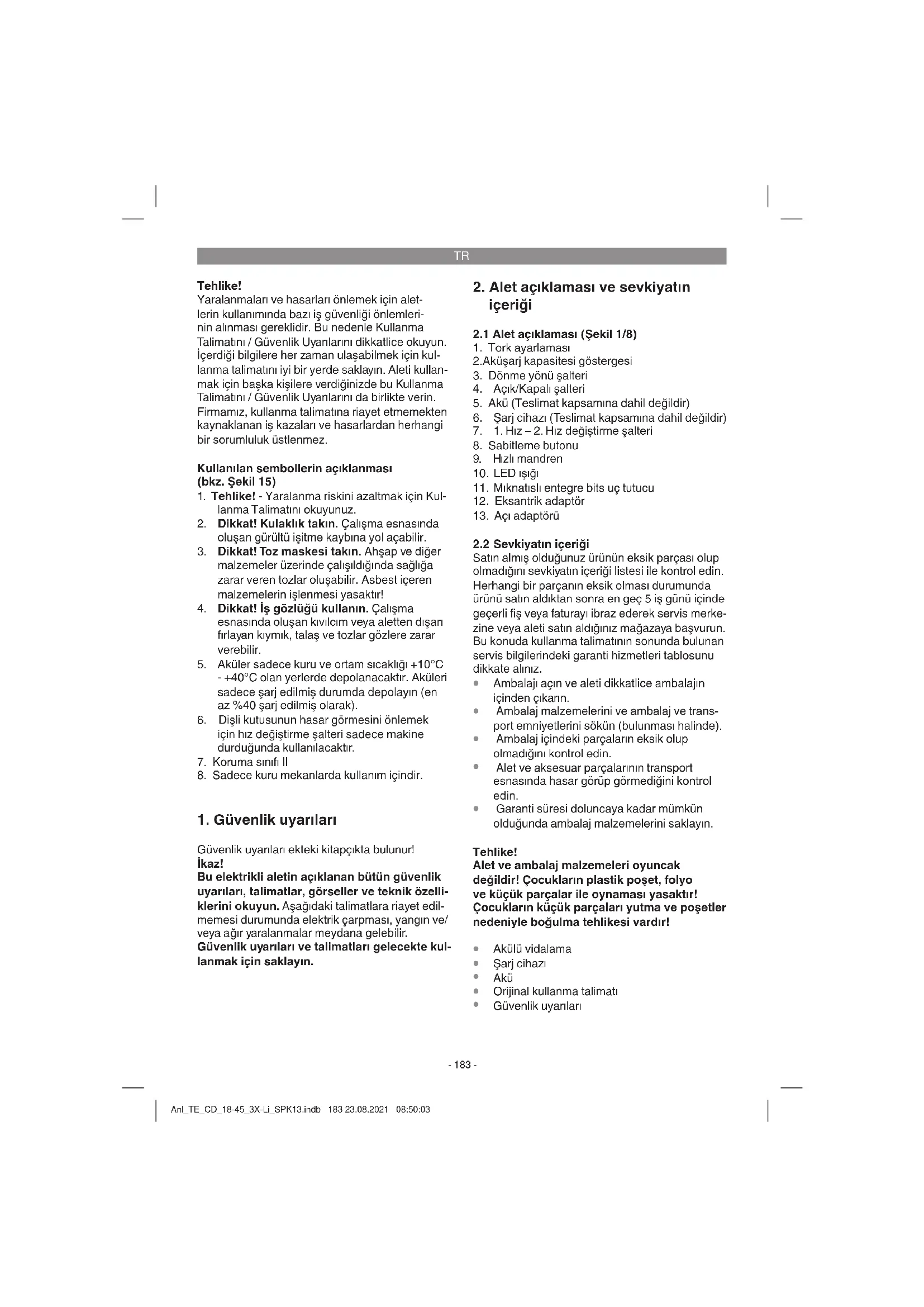 talimatlara göre kullanılmadığında veya bakımı düzgün şekilde yapılmadığında el-kol titreşiminden kaynaklanan sağlık hasarlarının Anl_TE_CD_18-45_3X-Li_SPK13.indb 184 23.08.2021 08:50:03TR