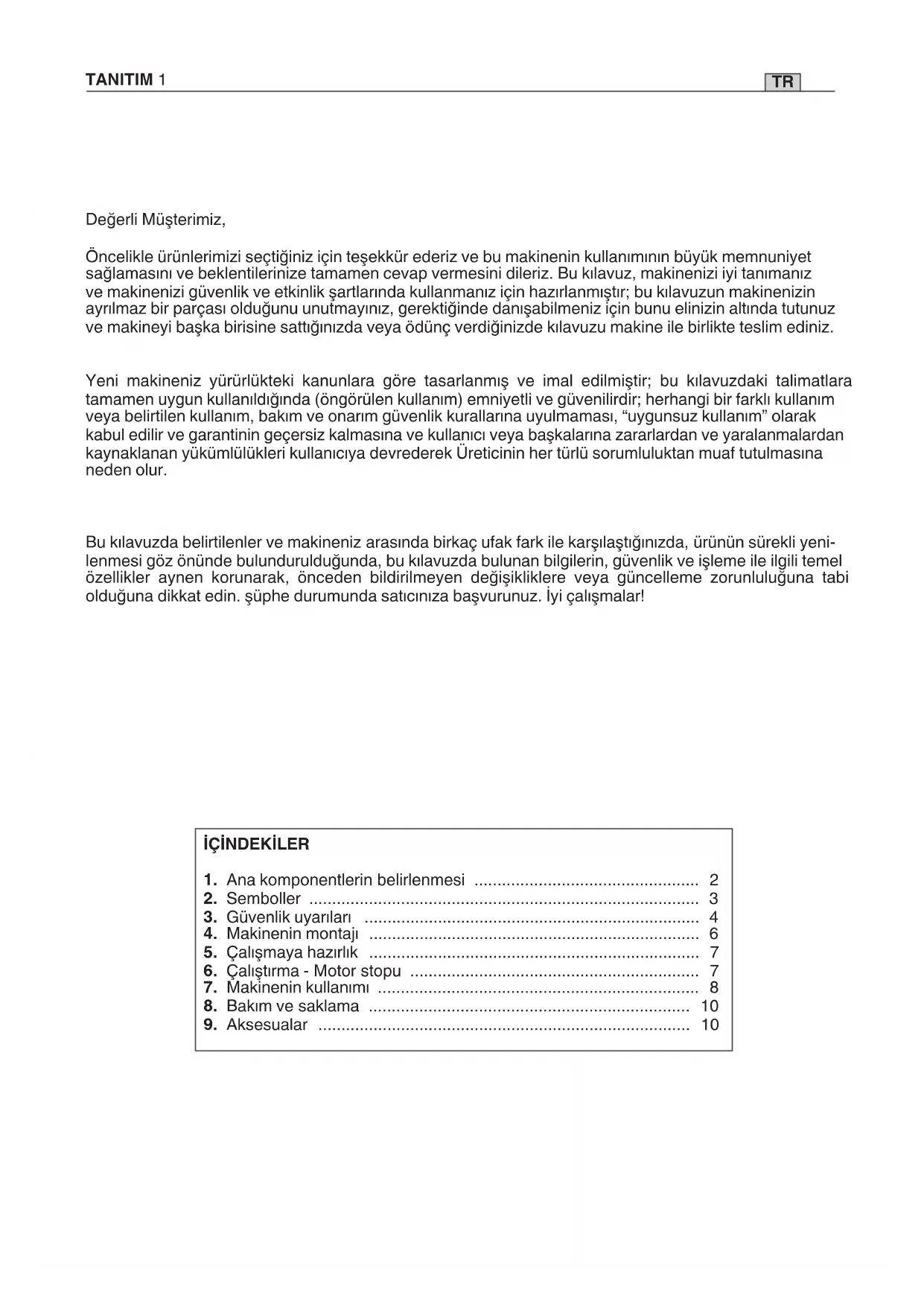 9 10 11TR KILAVUZUN OKUNMASI Kılavuz metninde özel önemli bilgiler içeren bazı pa ra graar, farklı belirginleştirme dereceleri ile işare t len miştir; bunun an- lamı aşağıdaki gibidir: NOT veya ÖNEMLİ Makineye zarar vermemek ve ya hasar yaratmamak amacıyla daha önceden belirtilenleri, açıklamalar veya diğer bilgiler ile tamamlar. DİKKAT! Uyulmaması halinde kişisel ya ralanma veya üçüncü şahısların yaralanması ih timali. TEHLİKE! Uyulmaması halinde, ölüm teh- likesi ile ciddi kişisel yaralanma veya üçüncü şahısların yaralanması ihtimali.