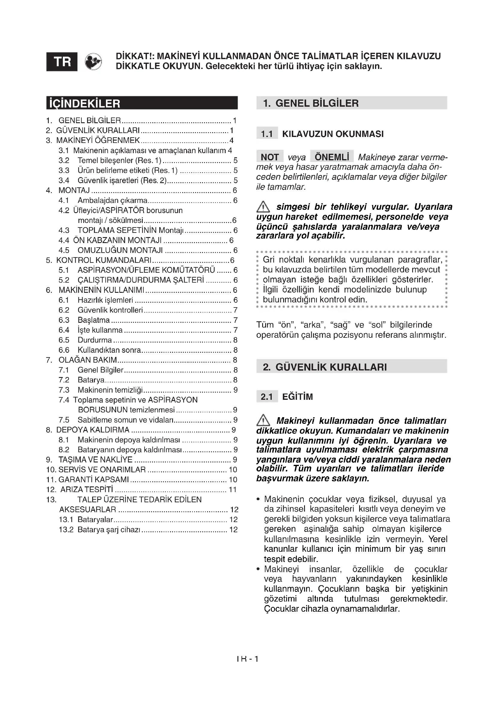 - makinenin birden fazla kişi tarafından kullanılması. ÖNEMLİ Makinenin uygunsuz kullanımı ga- rantinin geçersiz olmasına ve kullanıcının veya başkalarının zarar görmesinden ve yaralanmasın- dan kaynaklanan yükümlülükleri kullanıcıya dev- rederek Üreticinin her türlü sorumluluktan muaf tutulmasına neden olur.TR - 5