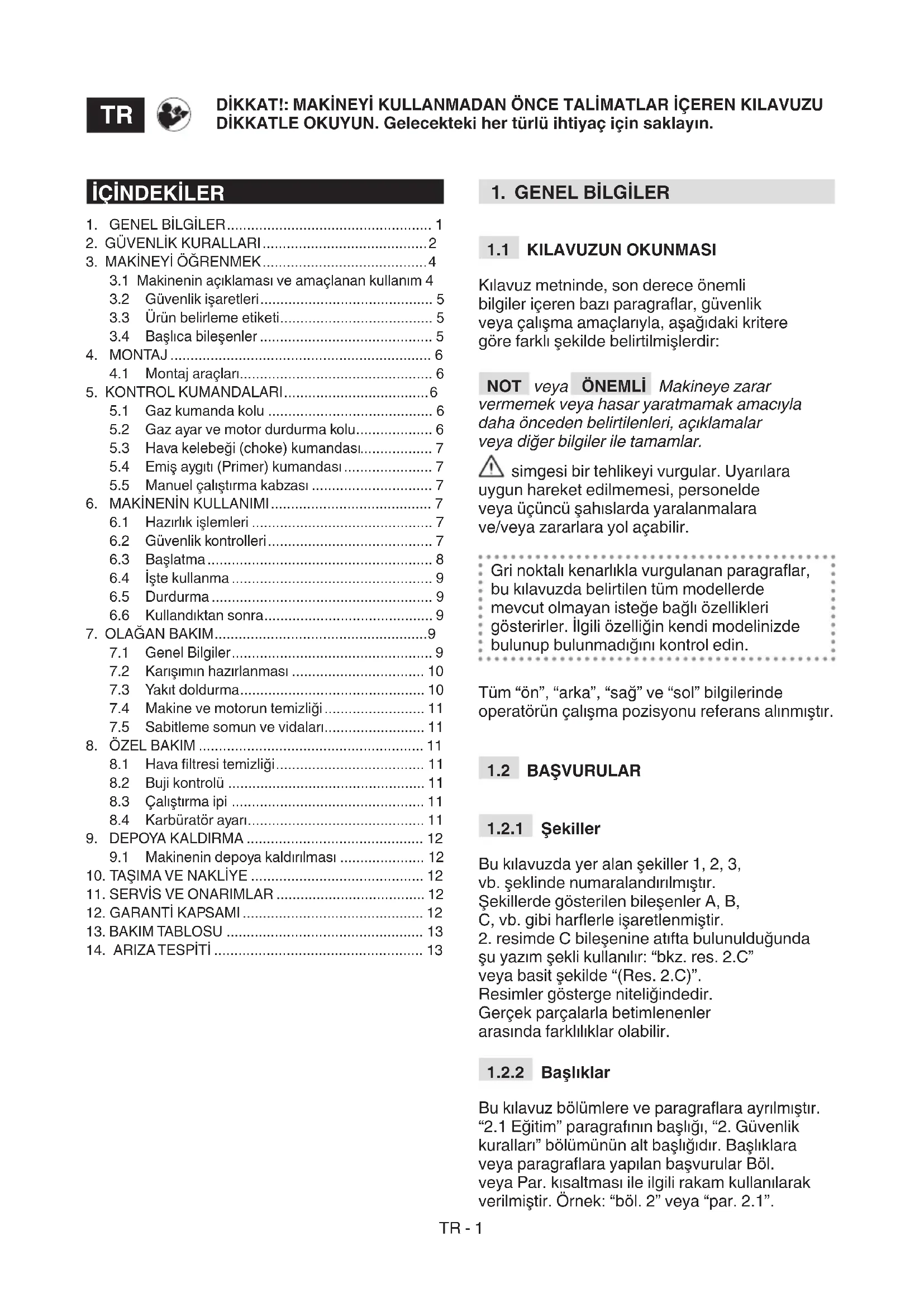Bu kılavuz bölümlere ve paragraara ayrılmıştır. “2.1 Eğitim” paragrafının başlığı, “2. Güvenlik kuralları” bölümünün alt başlığıdır. Başlıklara veya paragraara yapılan başvurular Böl. veya Par. kısaltması ile ilgili rakam kullanılarak verilmiştir. Örnek: “böl. 2” veya “par. 2.1”. İÇİNDEKİLER