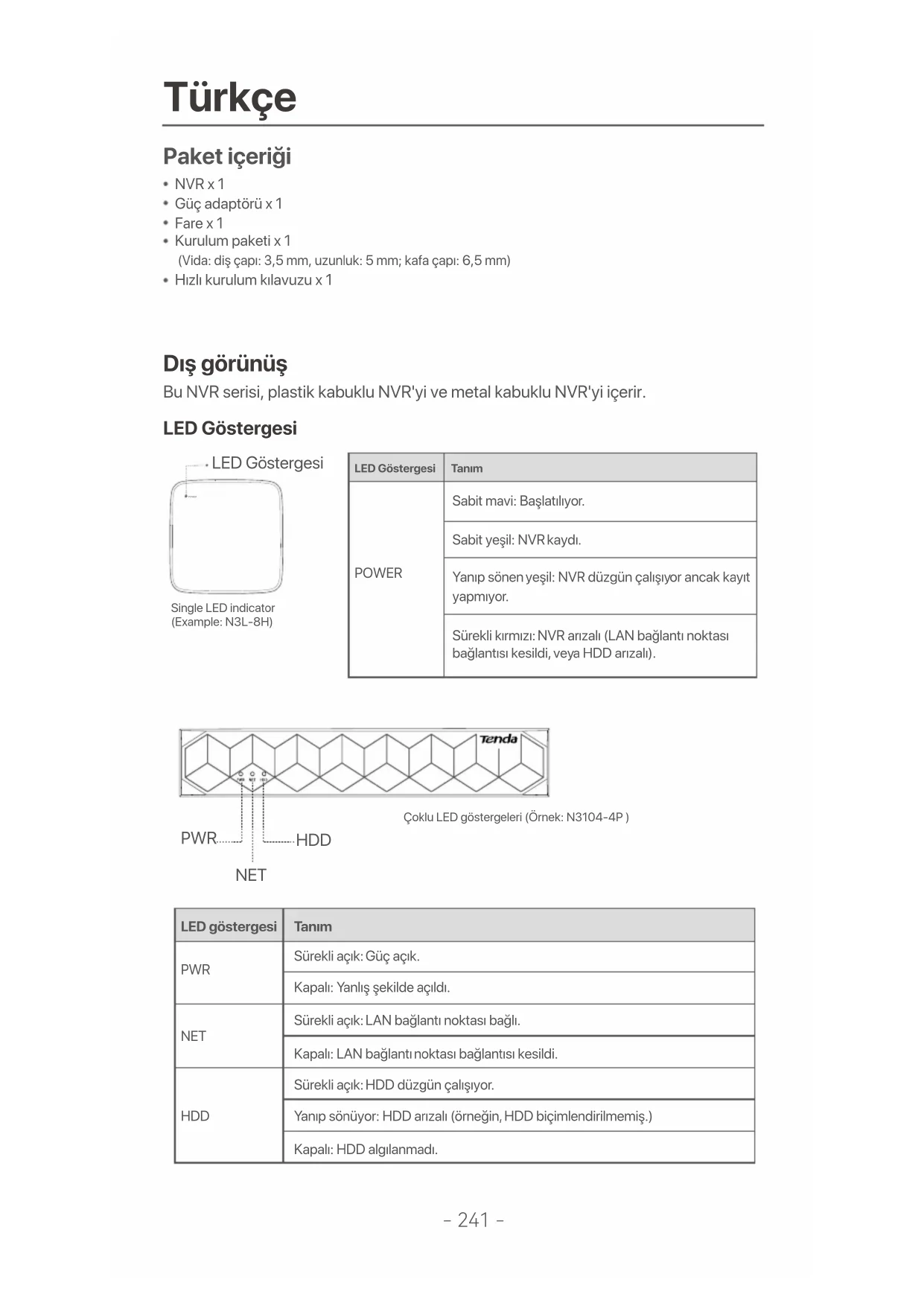 - μ μ , μ ONVIF, ONVIF μ μ μ admin . μ , μ μ Tenda.- 241 - Türkçe Paket içeriği Dış görünüş NVR x 1Güç adaptörü x 1Fare x 1Kurulum paketi x 1 (Vida: diş çapı: 3,5 mm, uzunluk: 5 mm; kafa çapı: 6,5 mm)Hızlı kurulum kılavuzu x 1 LED Göstergesi Bu NVR serisi, plastik kabuklu NVR'yi ve metal kabuklu NVR'yi içerir.POWER LED Göstergesi Single LED indicator (Example: N3L-8H)Çoklu LED göstergeleri (Örnek: N3104-4P ) PWR NET HDD LED Göstergesi Tanım POWER Sabit mavi: Başlatılıyor. Sabit yeşil: NVR kaydı. Yanıp sönen yeşil: NVR düzgün çalışıyor ancak kayıt yapmıyor. Sürekli kırmızı: NVR arızalı (LAN bağlantı noktası bağlantısı kesildi, veya HDD arızalı). LED göstergesi Tanım PWR NET HDD Sürekli açık: Güç açık. Kapalı: Yanlış şekilde açıldı. Sürekli açık: LAN bağlantı noktası bağlı. Kapalı: LAN bağlantı noktası bağlantısı kesildi. Sürekli açık: HDD düzgün çalışıyor. Yanıp sönüyor: HDD arızalı (örneğin, HDD biçimlendirilmemiş.) Kapalı: HDD algılanmadı.- 242 - Alt panel HDD vida deliği Duvara montaj delikleri Duvara montaj delikleri HDD vida deliği İpuçlarıDuvara montaj delikleri: Cihazı duvara sabitlemek için kullanılır.Duvara montaj malzemeleri kendi kendine hazırlanır. Plastik vida ve ankrajların tavsiye edilen özellikleri:Vida: diş çapı: 3 mm, uzunluk: 14 mm; kafa çapı: 5.2 mmPlastik ankraj: iç çap: 6,0 mm; uzunluk: 26,4 mm Plastik kabuk NVR (Örnek: N3L-8H) Metal kabuk NVR (Örnek: N3104-4P) Arka panel Güç girişi Topraklama terminali HDMI bağlantı noktası 10/100 Mbps LAN bağlantı noktası VGA bağlantı noktası PoE NVR (Örnek: N3104-4P) USB2.0 bağlantı noktaları