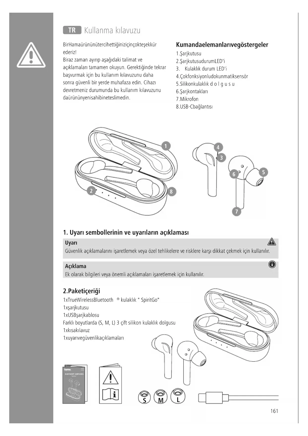 kulaklık"Spirit Go" 1x şarj kutusu 1x USB şarj kablosu Farklı boyutlarda (S, M, L) 3çift silikon kulaklıkdolgusu 1x kısa kılavuz 1x uyarı ve güvenlik açıklamaları