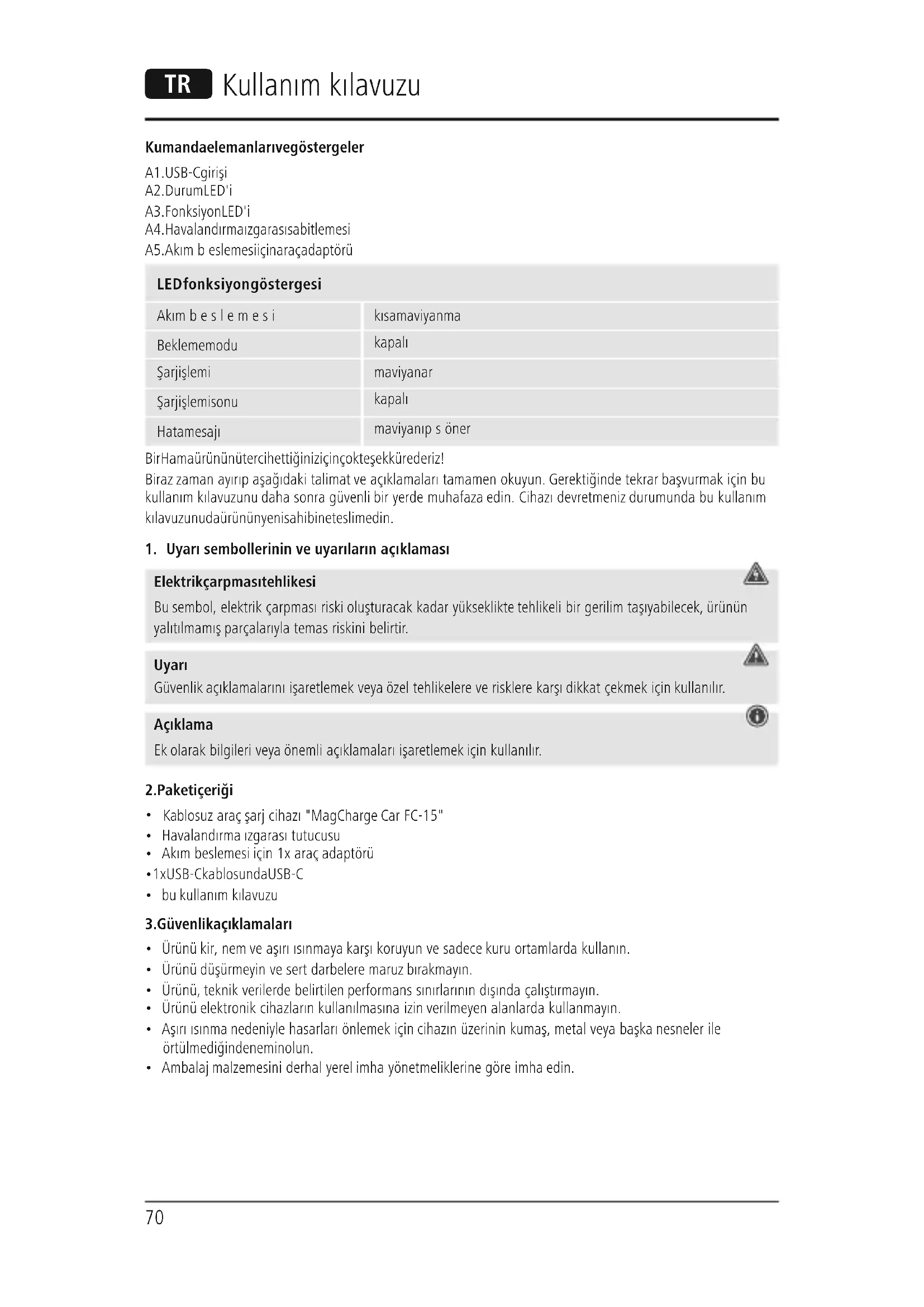 - Cep telefonu çantalarının, kılıarınvs. ve kablosuz şarj cihazı ile nihai cihazınızınarka tarafı arasındaki diğer materyallerin şarj işlemini rahatsızettiğini ve hatta engellediğini dikkate alın. Açıklama –Araçelektrik aksamı 12 V, 24V Şarj cihazı sadece 12 Vve24V'lik araç elektrik aksamı için uygundur.