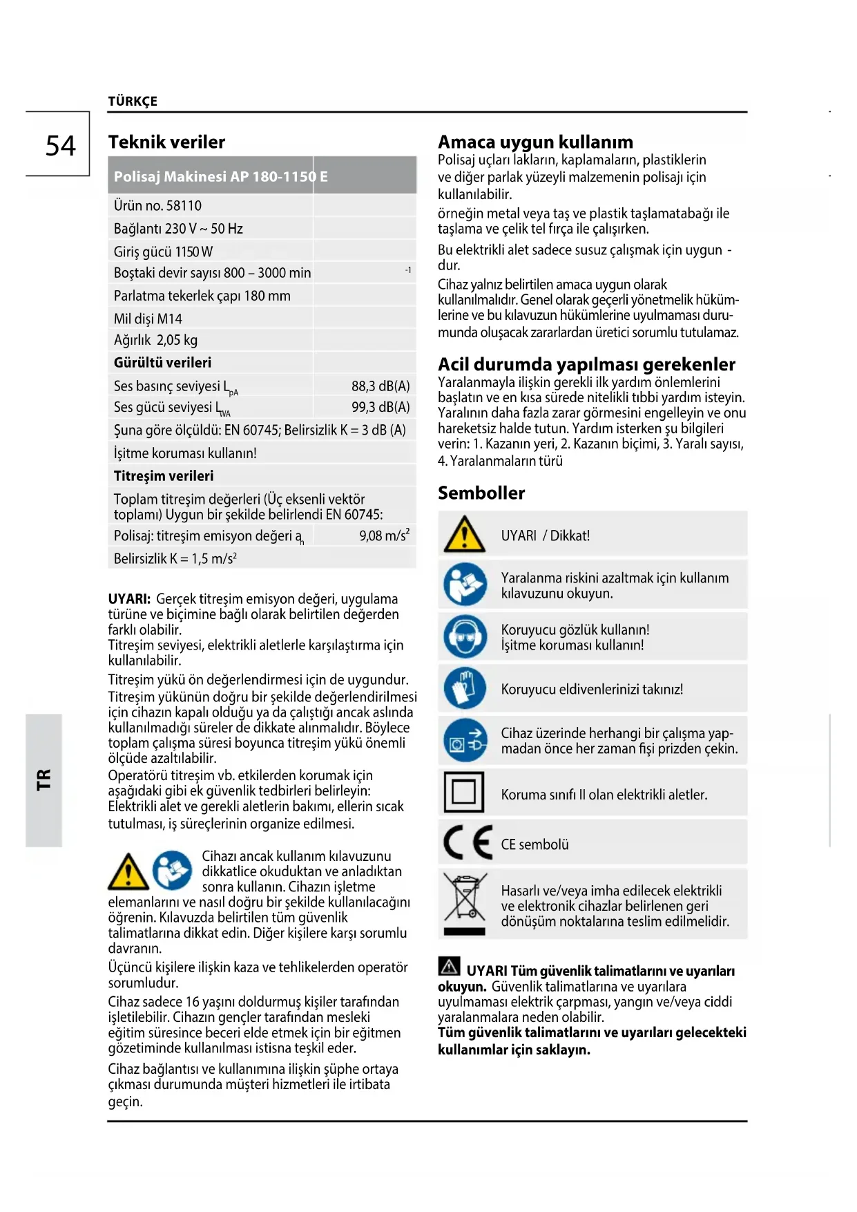 Teknik veriler Polisaj Makinesi AP 180-1150 E Ürün no. 58110 Bağlantı 230 V ~ 50 Hz Giriş gücü 1150 W Boştaki devir sayısı 800 – 3000 min