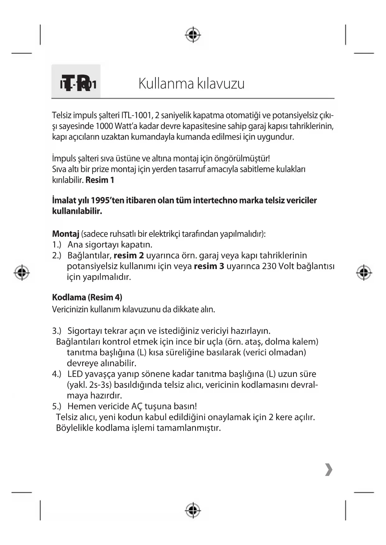 Kullanma kılavuzu Telsiz impuls şalteri ITL-1001, 2 saniyelik kapatma otomatiği ve potansiyelsiz çıkı-şı sayesinde 1000 Watt’a kadar devre kapasitesine sahip garaj kapısı tahriklerinin, kapı açıcıların uzaktan kumandayla kumanda edilmesi için uygundur.İmpuls şalteri sıva üstüne ve altına montaj için öngörülmüştür!Sıva altı bir prize montaj için yerden tasarruf amacıyla sabitleme kulakları kırılabilir. Resim 1İmalat yılı 1995’ten itibaren olan tüm intertechno marka telsiz vericiler kullanılabilir.Montaj (sadece ruhsatlı bir elektrikçi tarafından yapılmalıdır):1.) Ana sigortayı kapatın. 2.) Bağlantılar, resim 2 uyarınca örn. garaj veya kapı tahriklerinin potansiyelsiz kullanımı için veya resim 3 uyarınca 230 Volt bağlantısı için yapılmalıdır.Kodlama (Resim 4)Vericinizin kullanım kılavuzunu da dikkate alın.3.) Sigortayı tekrar açın ve istediğiniz vericiyi hazırlayın. Bağlantıları kontrol etmek için ince bir uçla (örn. ataş, dolma kalem) tanıtma başlığına (L) kısa süreliğine basılarak (verici olmadan) devreye alınabilir.4.) LED yavaşça yanıp sönene kadar tanıtma başlığına (L) uzun süre (yakl. 2s-3s) basıldığında telsiz alıcı, vericinin kodlamasını devral-maya hazırdır.5.) Hemen vericide AÇ tuşuna basın! Telsiz alıcı, yeni kodun kabul edildiğini onaylamak için 2 kere açılır. Böylelikle kodlama işlemi tamamlanmıştır. ›ITL-1001