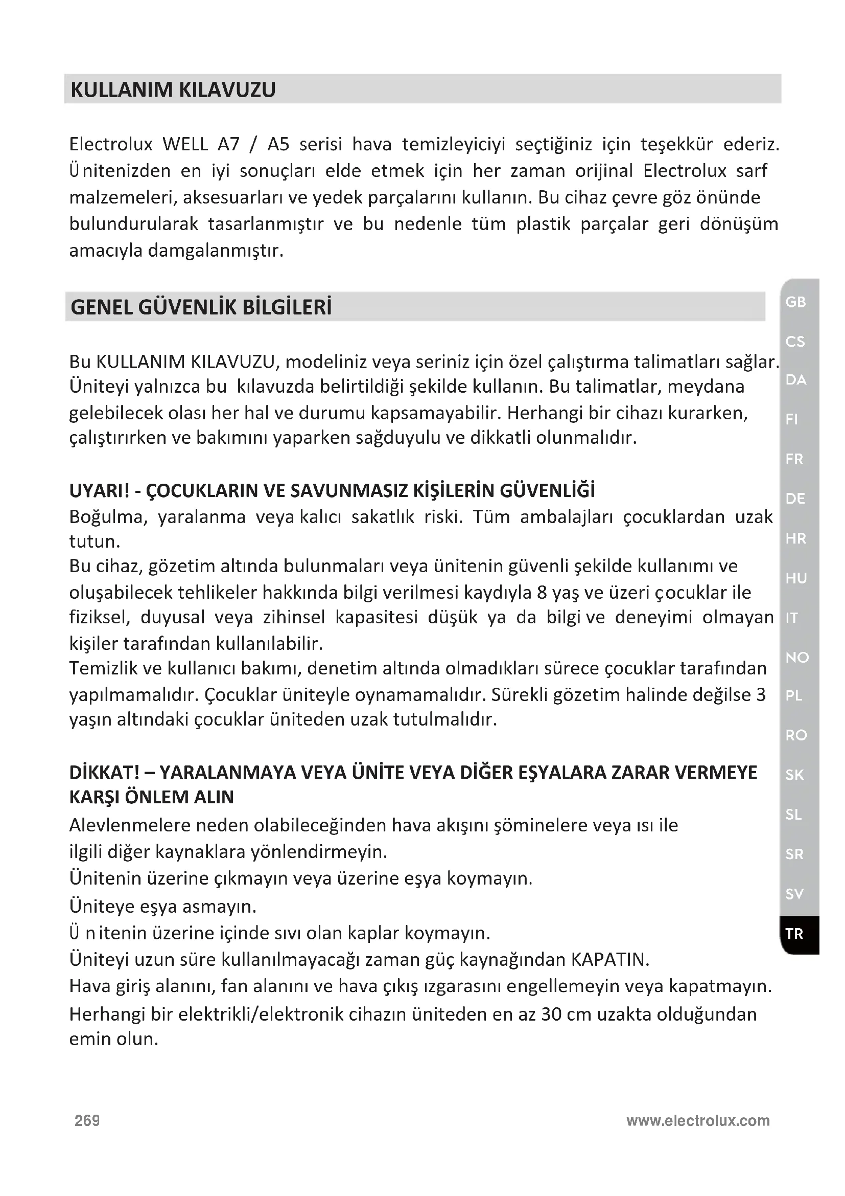 Electrolux WELL A7 / A5 serisi hava temizleyiciyi seçtiğiniz için teşekkür ederiz. Ünitenizden en iyi sonuçları elde etmek için her zaman orijinal Electrolux sarf malzemeleri, aksesuarları ve yedek parçalarını kullanın. Bu cihaz çevre göz önünde bulundurularak tasarlanmıştır ve bu nedenle tüm plastik parçalar geri dönüşüm amacıyla damgalanmıştır. GENEL GÜVENLİK BİLGİLERİ