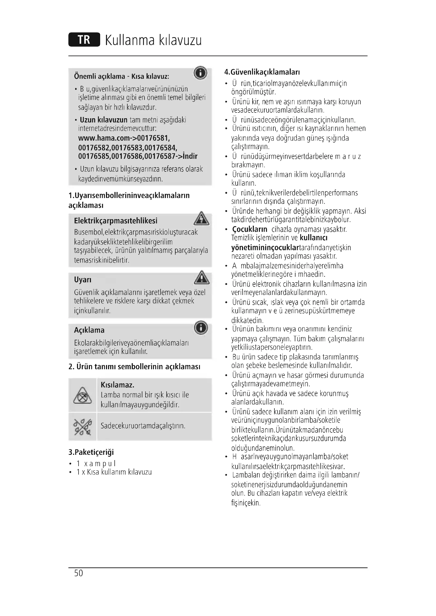 - Uzun kılavuzun tam metni aşağıdaki internet adresinde mevcuttur: www.hama.com -> 00176581, 00176582, 00176583, 00176584, 00176585, 00176586, 00176587 -> İndir